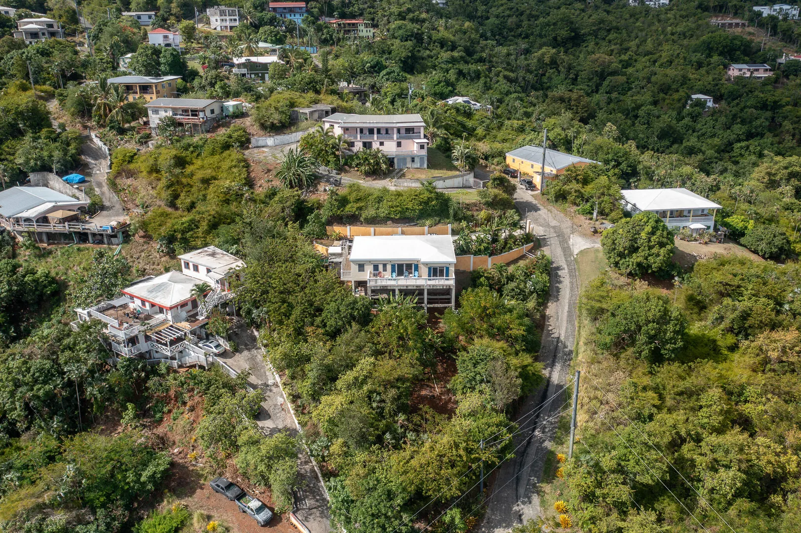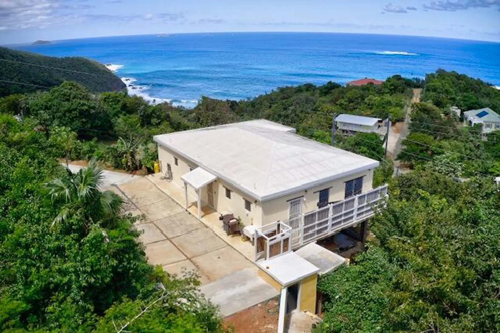 Enjoy the peace and natural beauty of St. Thomas' Northside from this solidly built 2BD/2BA concrete home, perfectly positioned to capture ocean views and cool breezes.The upper level offers comfortable living with an open floor plan with large porch spanning the length of the house. While the unfinished lower level opens the door to incredible possibilities: add a 3rd bedroom + bath, an office, or even a self-contained studio apartment. With direct access to create an additional driveway and plenty of space for a pool, this property is ready to evolve with your vision.Mature fruit trees avocado, mango, and more surround the home, creating a lush, garden-like setting. Practical features include three cisterns totaling 27,000 gallons, easy plumbing and electrical access, and strong concrete construction for peace of mind.