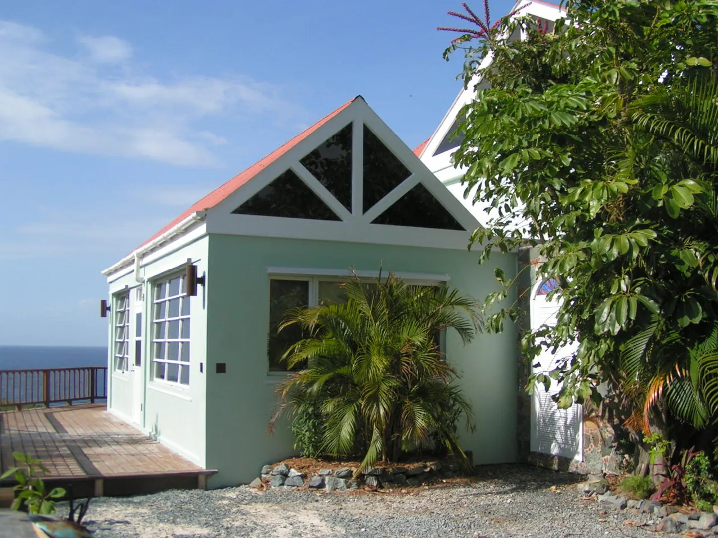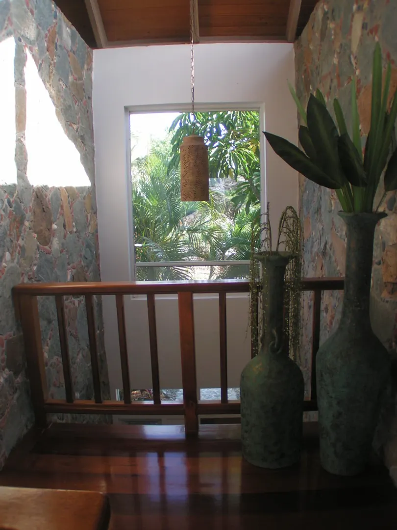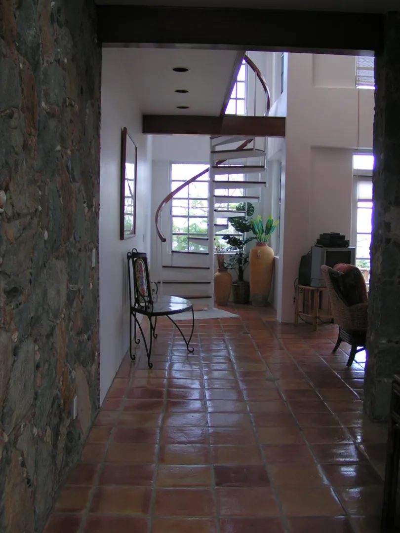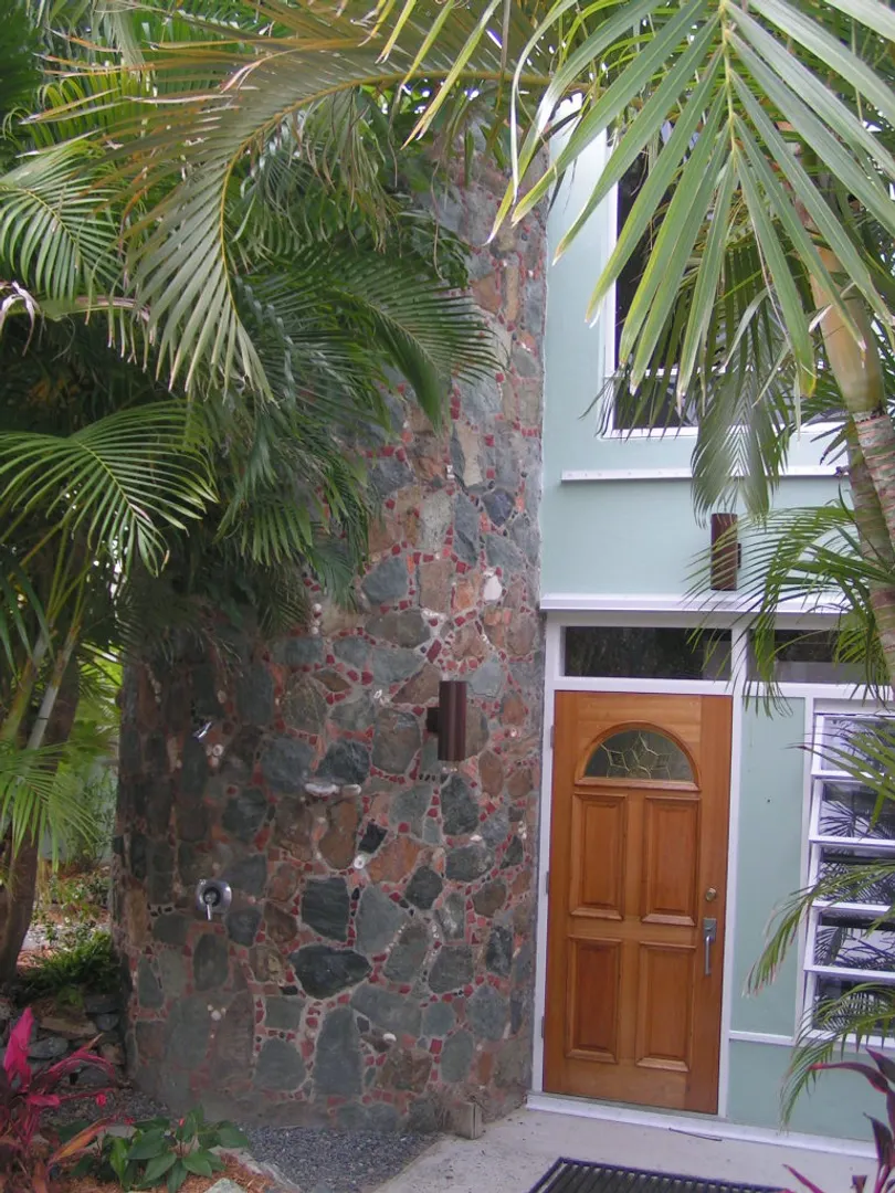 Raj Mahal-Beautiful, recently renovated masonry home accented with stone walls inside and out, cathedral ceiling with skylights in the great room and Saltillo clay tile floors. Two air-conditioned bedroom suites plusone-bedroom apt. with full kitchen and patio, each privately separated from each other. The Master suite,accessed by a spiral staircase, has hardwood floors, a separate dressing or office area and a private covered deck. Enjoy incredible southerly views across the Caribbean to St. Croix throughout the house, inside and out. Inviting pool and hot tub each, on their own separate spacious decks. Extensive, mature landscaping including various fruit trees. BUYER and SELLER to equally pay the costs of recording the Doc. Stamps to the Deed.