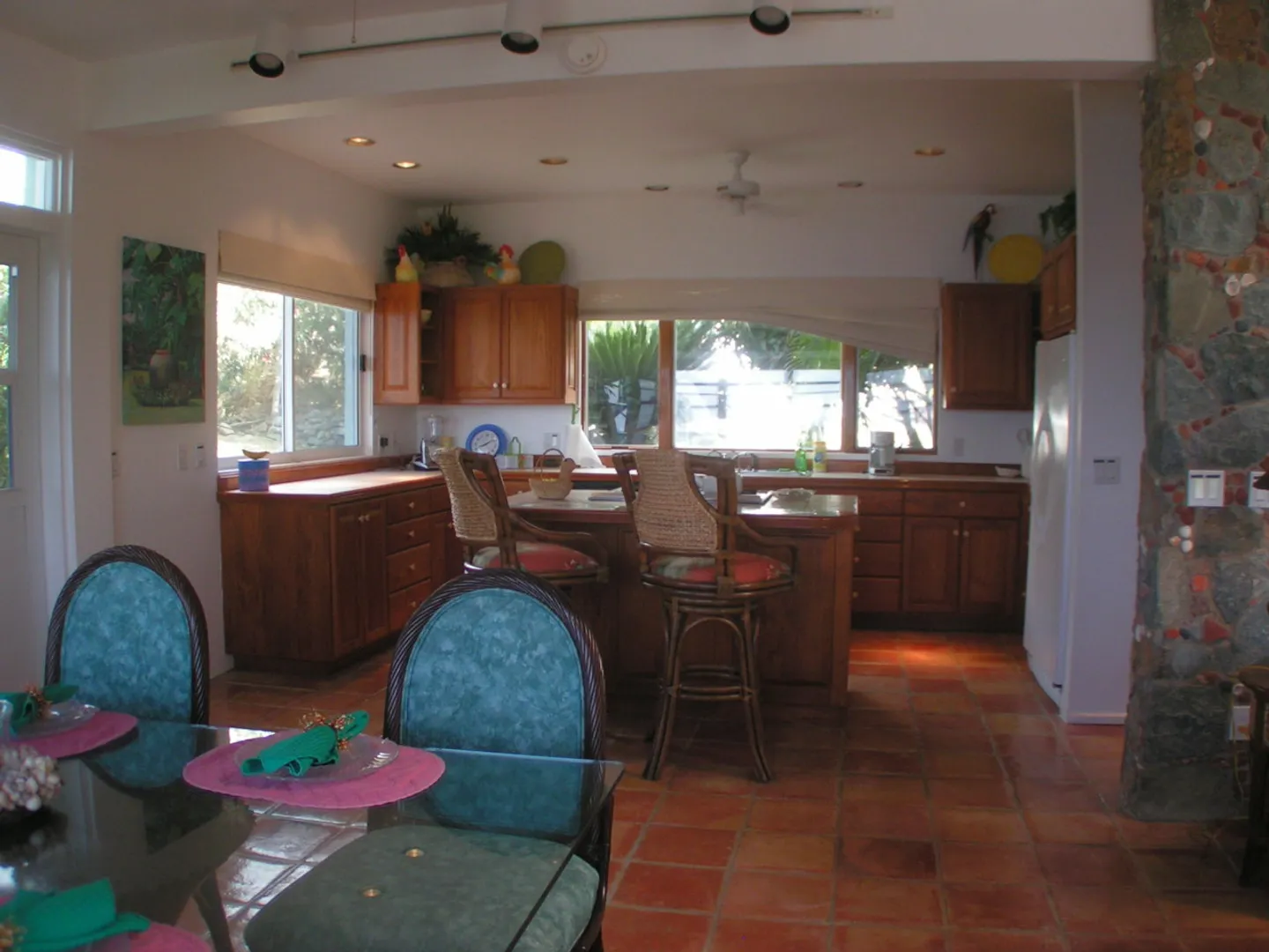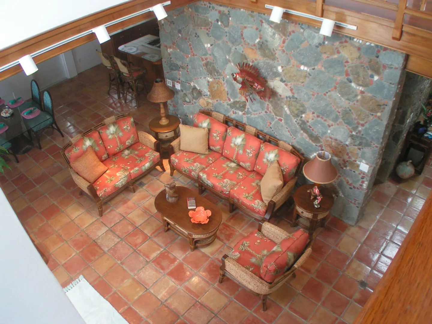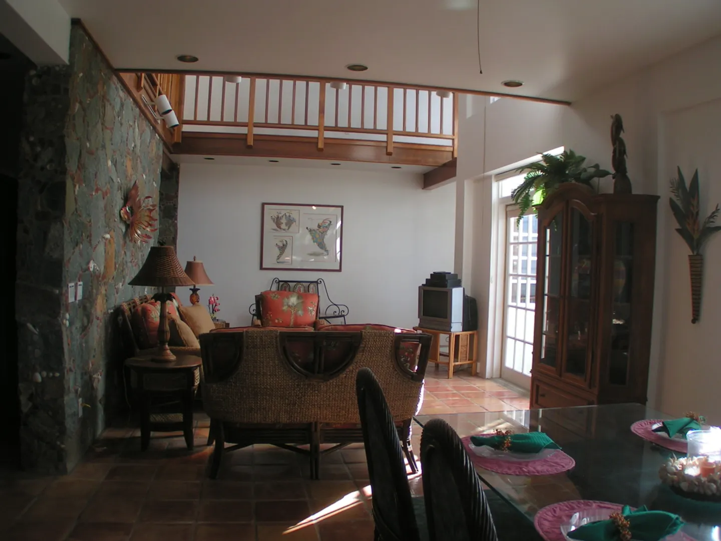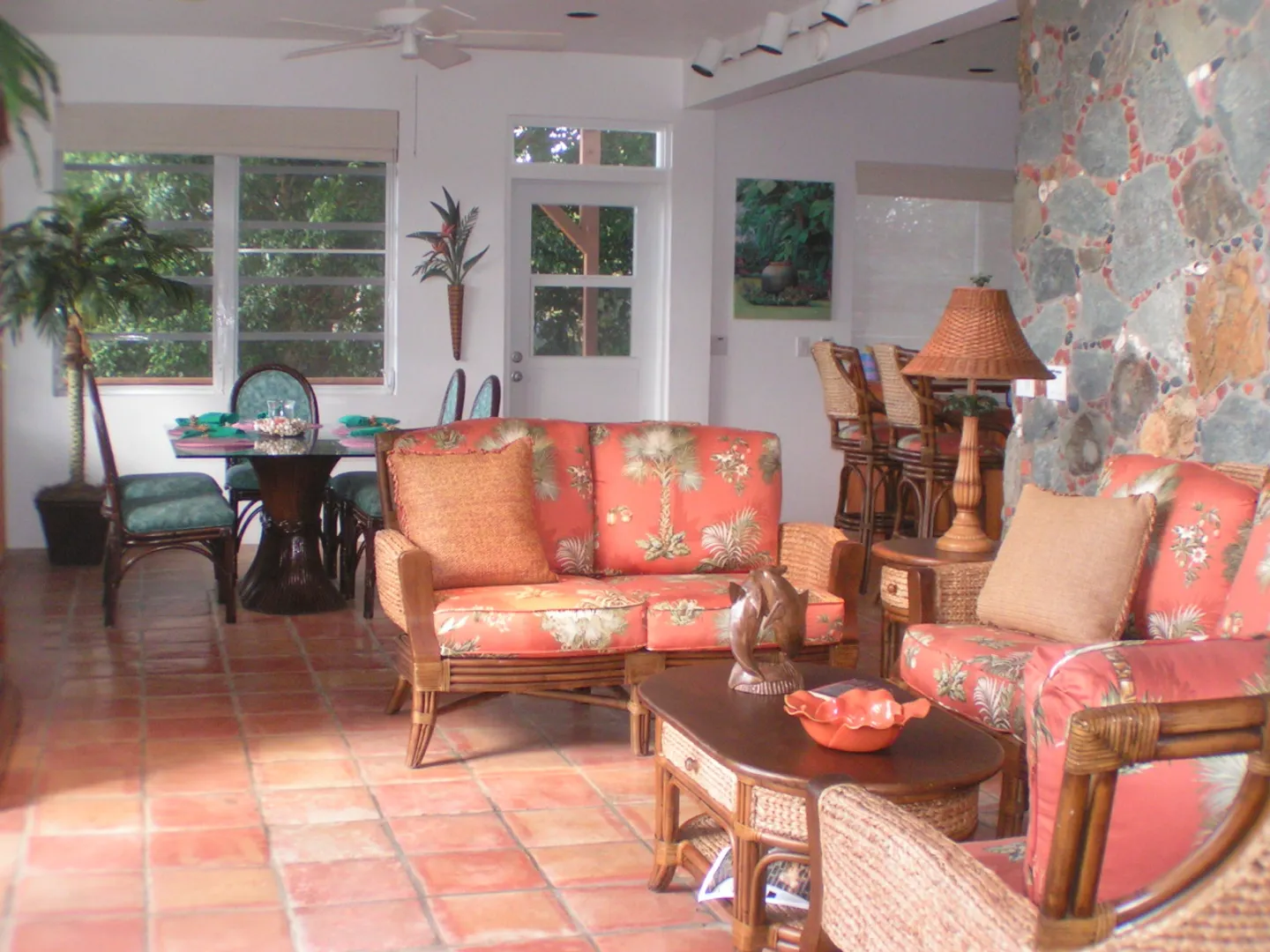Raj Mahal-Beautiful, recently renovated masonry home accented with stone walls inside and out, cathedral ceiling with skylights in the great room and Saltillo clay tile floors. Two air-conditioned bedroom suites plusone-bedroom apt. with full kitchen and patio, each privately separated from each other. The Master suite,accessed by a spiral staircase, has hardwood floors, a separate dressing or office area and a private covered deck. Enjoy incredible southerly views across the Caribbean to St. Croix throughout the house, inside and out. Inviting pool and hot tub each, on their own separate spacious decks. Extensive, mature landscaping including various fruit trees. BUYER and SELLER to equally pay the costs of recording the Doc. Stamps to the Deed.