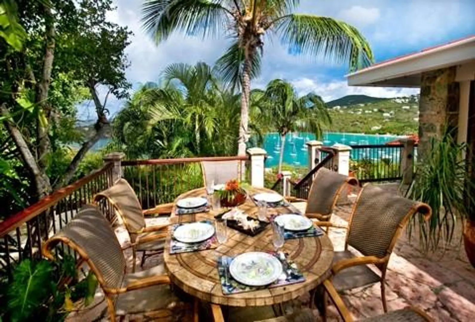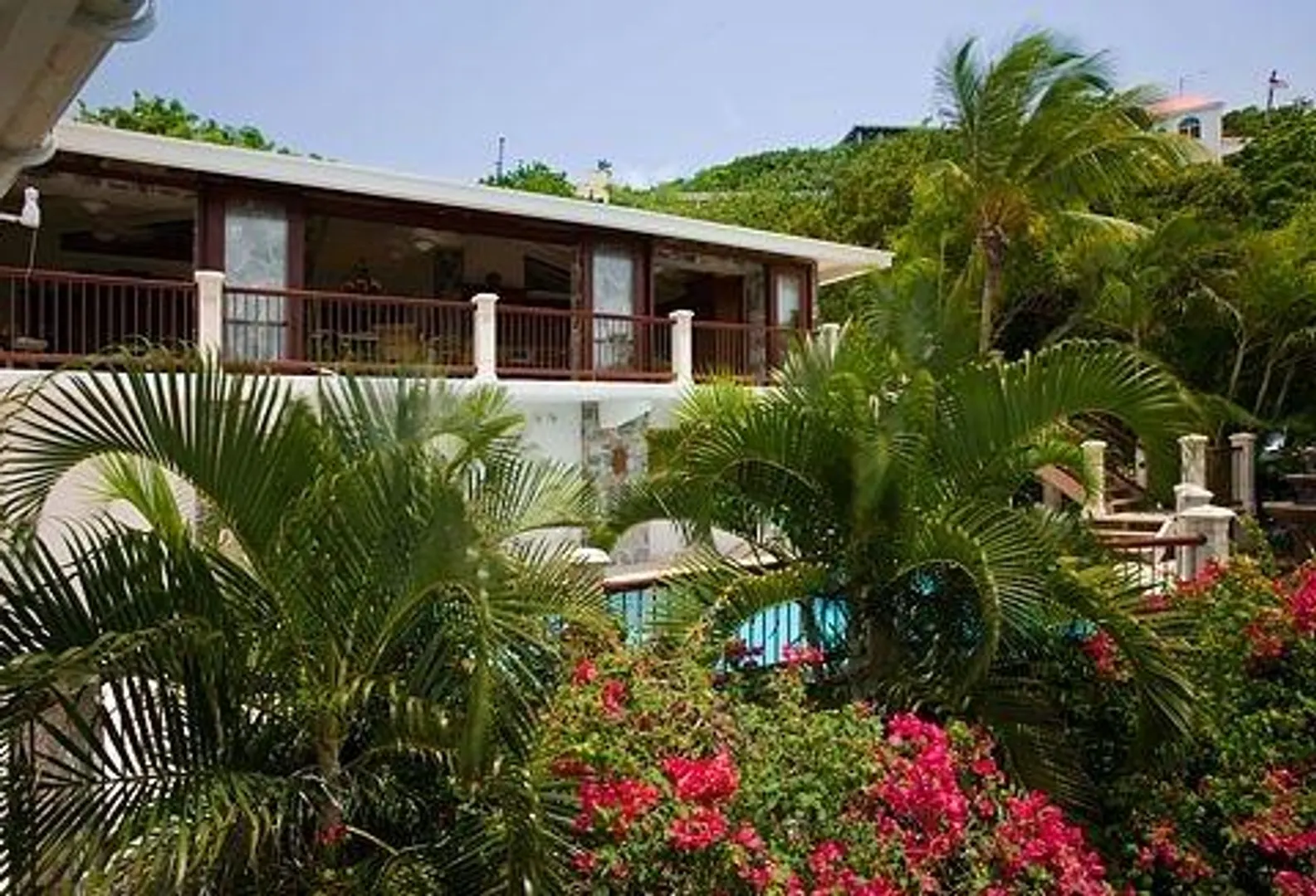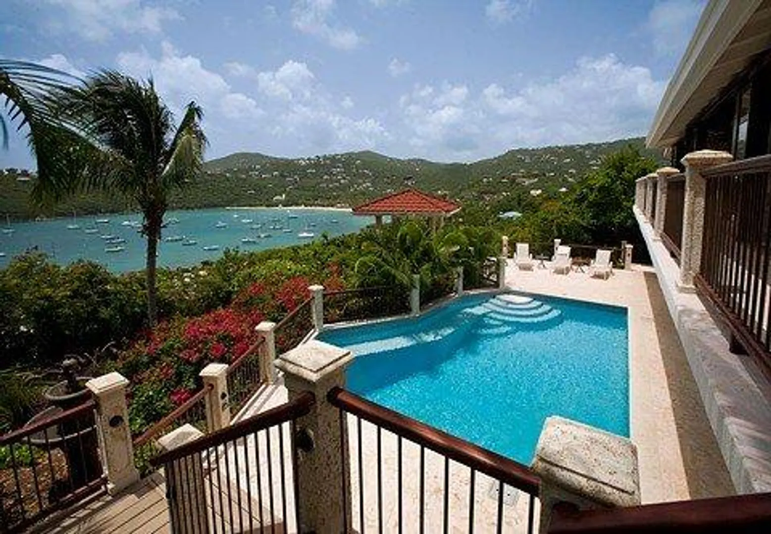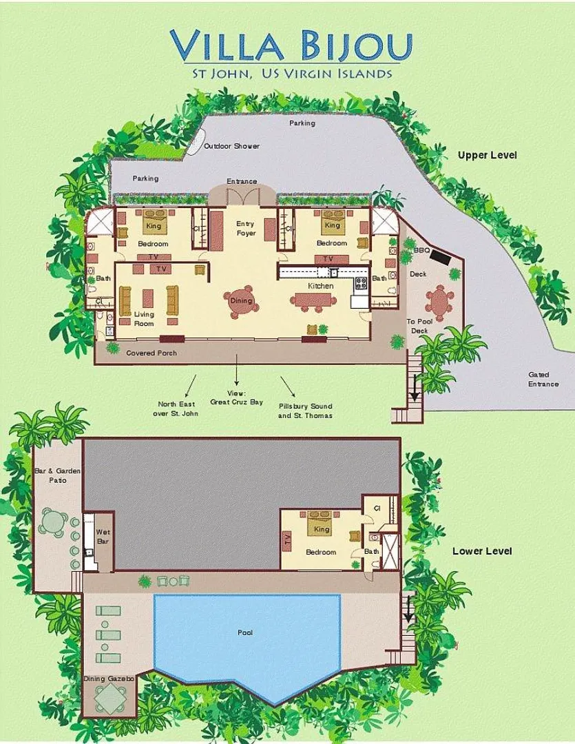 Villa Bijou is a fully furnished three-bedroom, three and one-half bath pool villa with gated entry. This lovely air conditioned Great Cruz Bay residence was completely remodeled and modernized in 2006 with high end finishes; custom mahogany doors and windows, stone showers, large closets with owner's lockouts, and lovely freeform coral stone floor coverings. Outdoors, you'll find over 1,600 square feet of beautifully tiled porches and patios for dining, sunning or sipping cocktails around the pool bar and gazebo.To ensure year-round comfort the pool is heated and cooled by heat pump and energy concerns have been fully addressed with a solar panel net metering system that provides huge savings on utility bills. There is even a diesel backup generator in the event of loss of power. All glass openings are fitted with hurricane screening, a compact, lightweight and aesthetically attractive alternative to other types of protective storm measures. This property is a very popular vacation rental due to the convenient Great Cruz Bay location which provides for stunning sunset views overlooking the bay and St. Thomas in the distance.