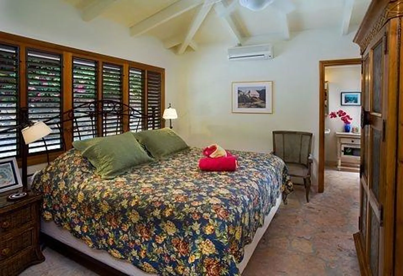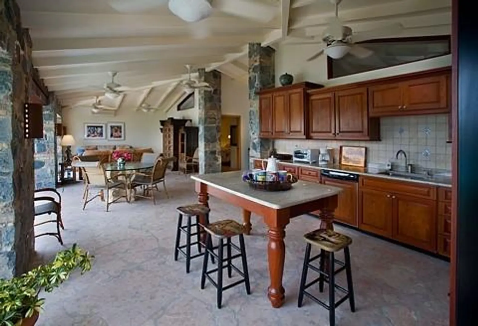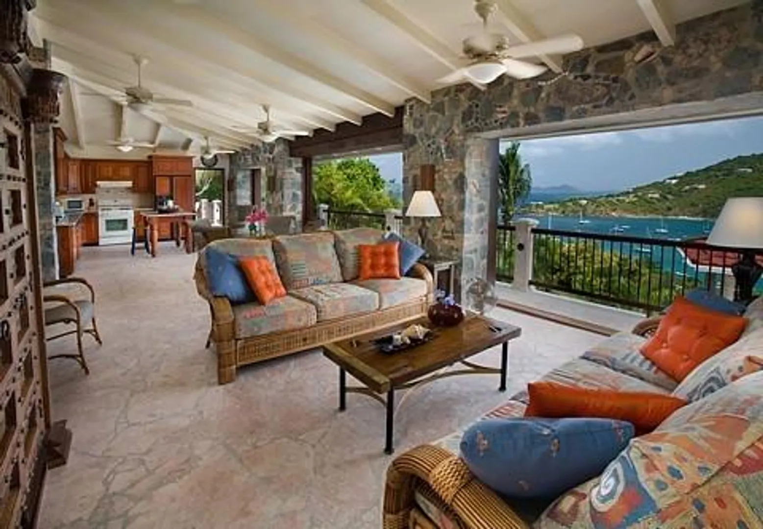 Villa Bijou is a fully furnished three-bedroom, three and one-half bath pool villa with gated entry. This lovely air conditioned Great Cruz Bay residence was completely remodeled and modernized in 2006 with high end finishes; custom mahogany doors and windows, stone showers, large closets with owner's lockouts, and lovely freeform coral stone floor coverings. Outdoors, you'll find over 1,600 square feet of beautifully tiled porches and patios for dining, sunning or sipping cocktails around the pool bar and gazebo.To ensure year-round comfort the pool is heated and cooled by heat pump and energy concerns have been fully addressed with a solar panel net metering system that provides huge savings on utility bills. There is even a diesel backup generator in the event of loss of power. All glass openings are fitted with hurricane screening, a compact, lightweight and aesthetically attractive alternative to other types of protective storm measures. This property is a very popular vacation rental due to the convenient Great Cruz Bay location which provides for stunning sunset views overlooking the bay and St. Thomas in the distance.