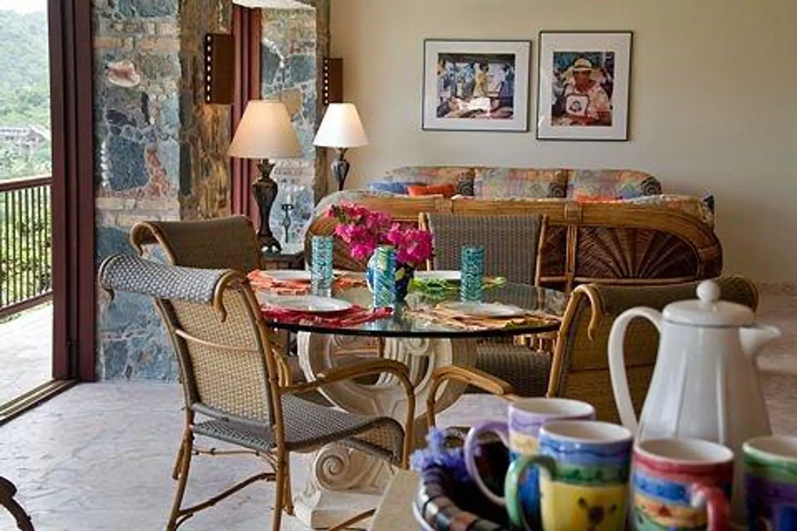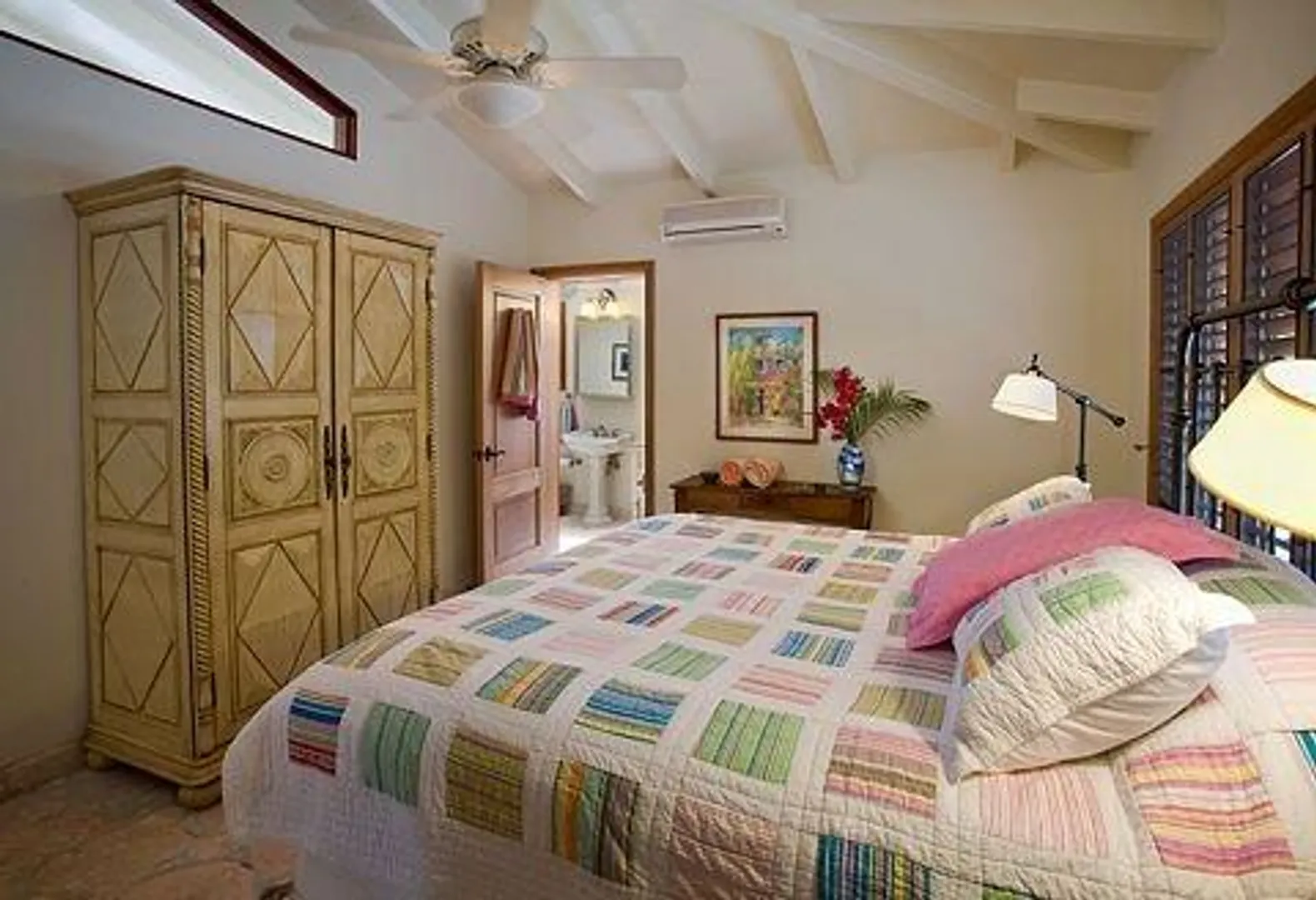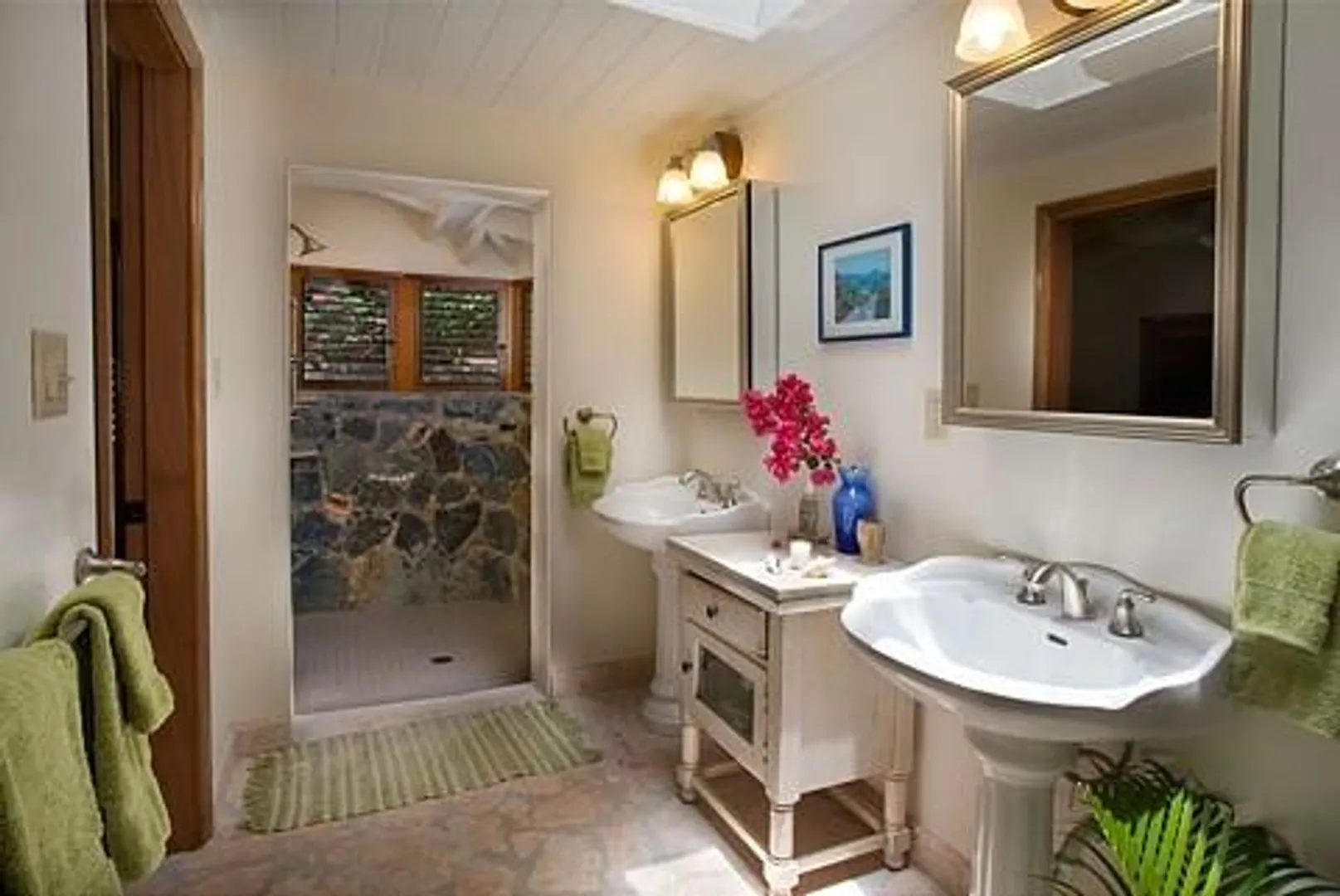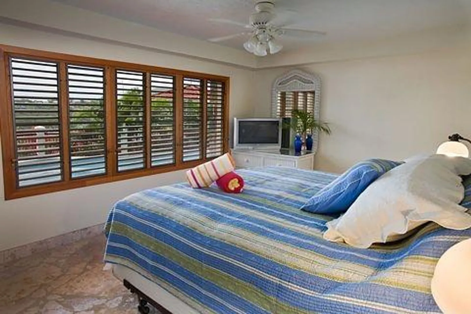 Villa Bijou is a fully furnished three-bedroom, three and one-half bath pool villa with gated entry. This lovely air conditioned Great Cruz Bay residence was completely remodeled and modernized in 2006 with high end finishes; custom mahogany doors and windows, stone showers, large closets with owner's lockouts, and lovely freeform coral stone floor coverings. Outdoors, you'll find over 1,600 square feet of beautifully tiled porches and patios for dining, sunning or sipping cocktails around the pool bar and gazebo.To ensure year-round comfort the pool is heated and cooled by heat pump and energy concerns have been fully addressed with a solar panel net metering system that provides huge savings on utility bills. There is even a diesel backup generator in the event of loss of power. All glass openings are fitted with hurricane screening, a compact, lightweight and aesthetically attractive alternative to other types of protective storm measures. This property is a very popular vacation rental due to the convenient Great Cruz Bay location which provides for stunning sunset views overlooking the bay and St. Thomas in the distance.