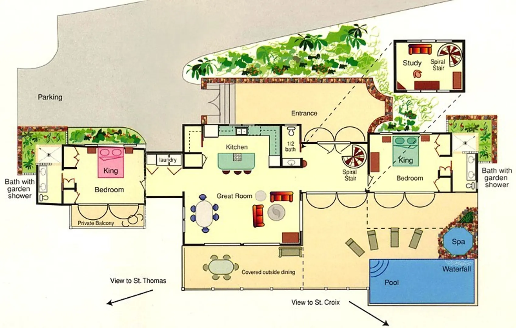 • View: Caribbean, Panoramic, South Shore, St. Croix, St. Thomas, West/sunset