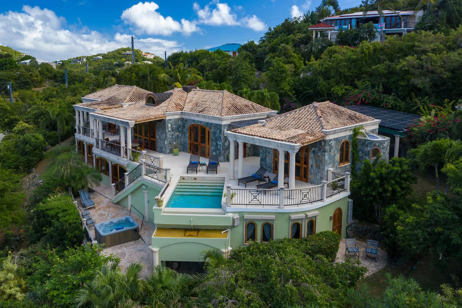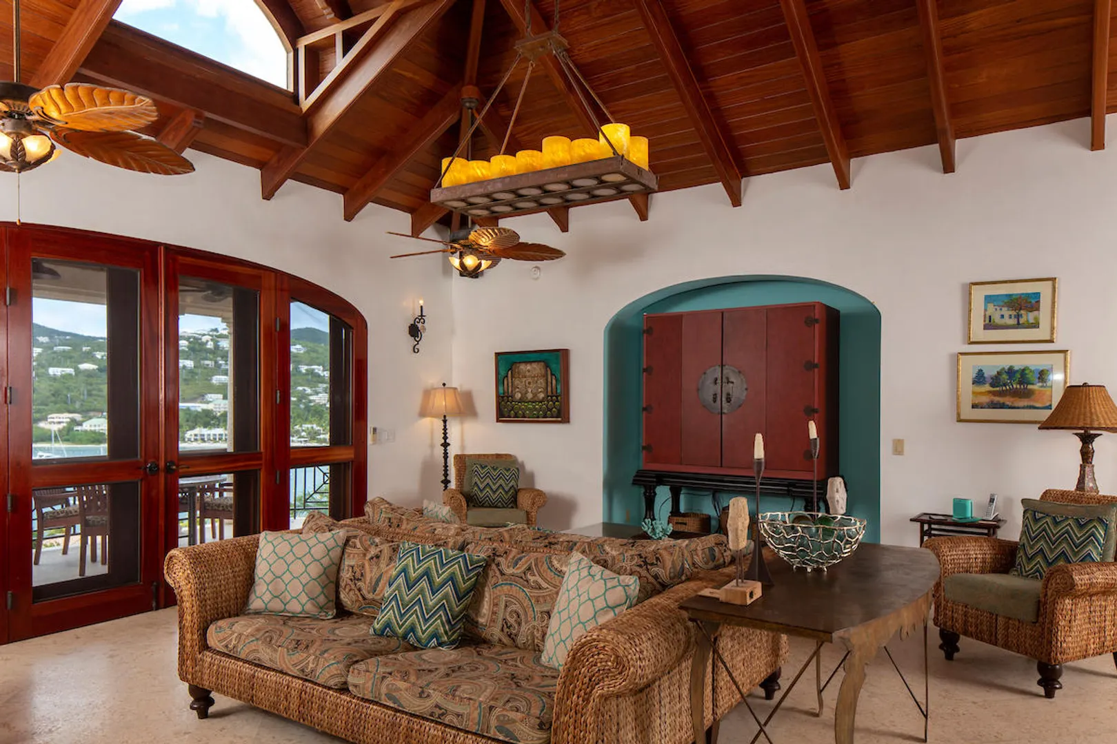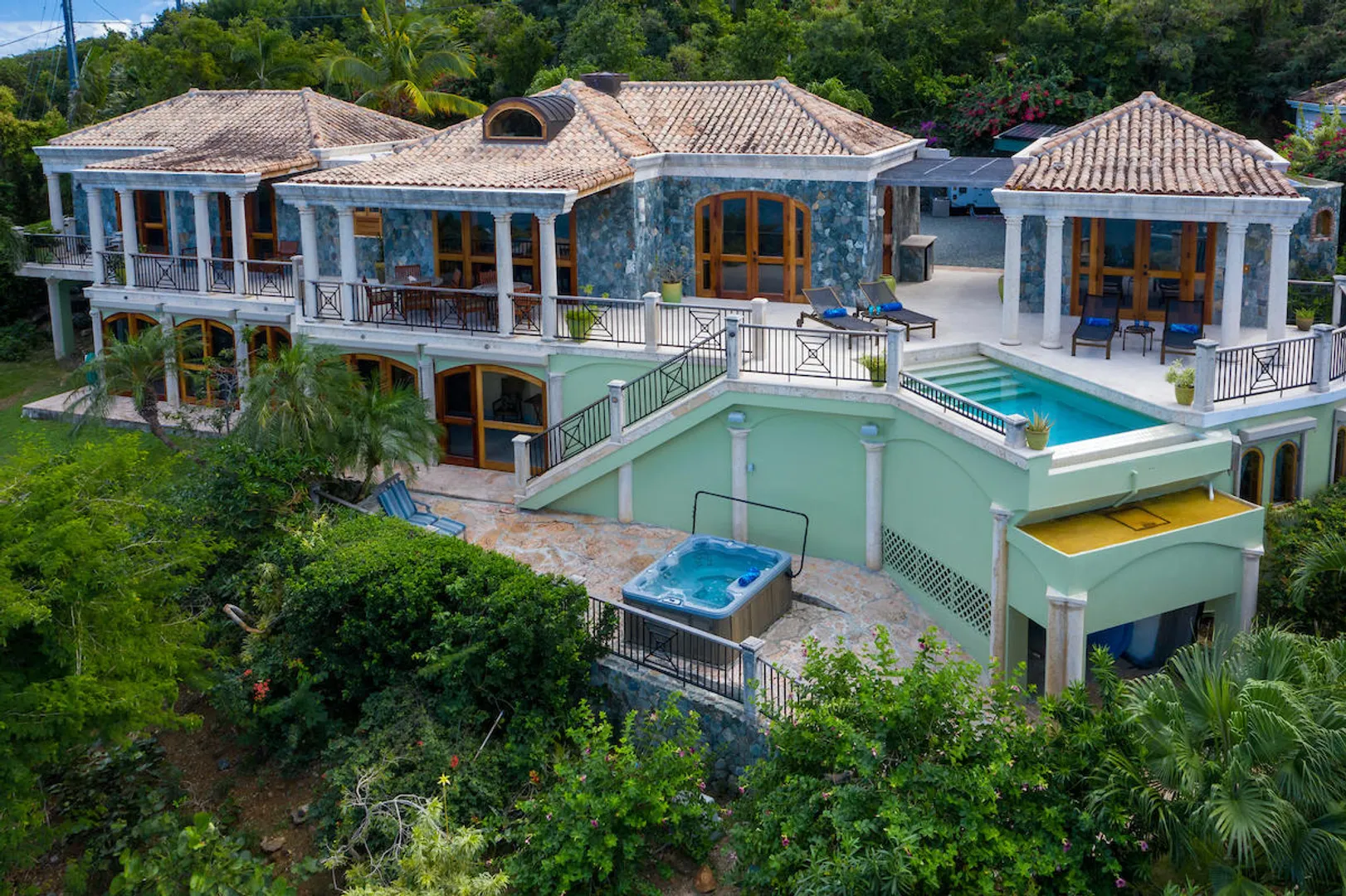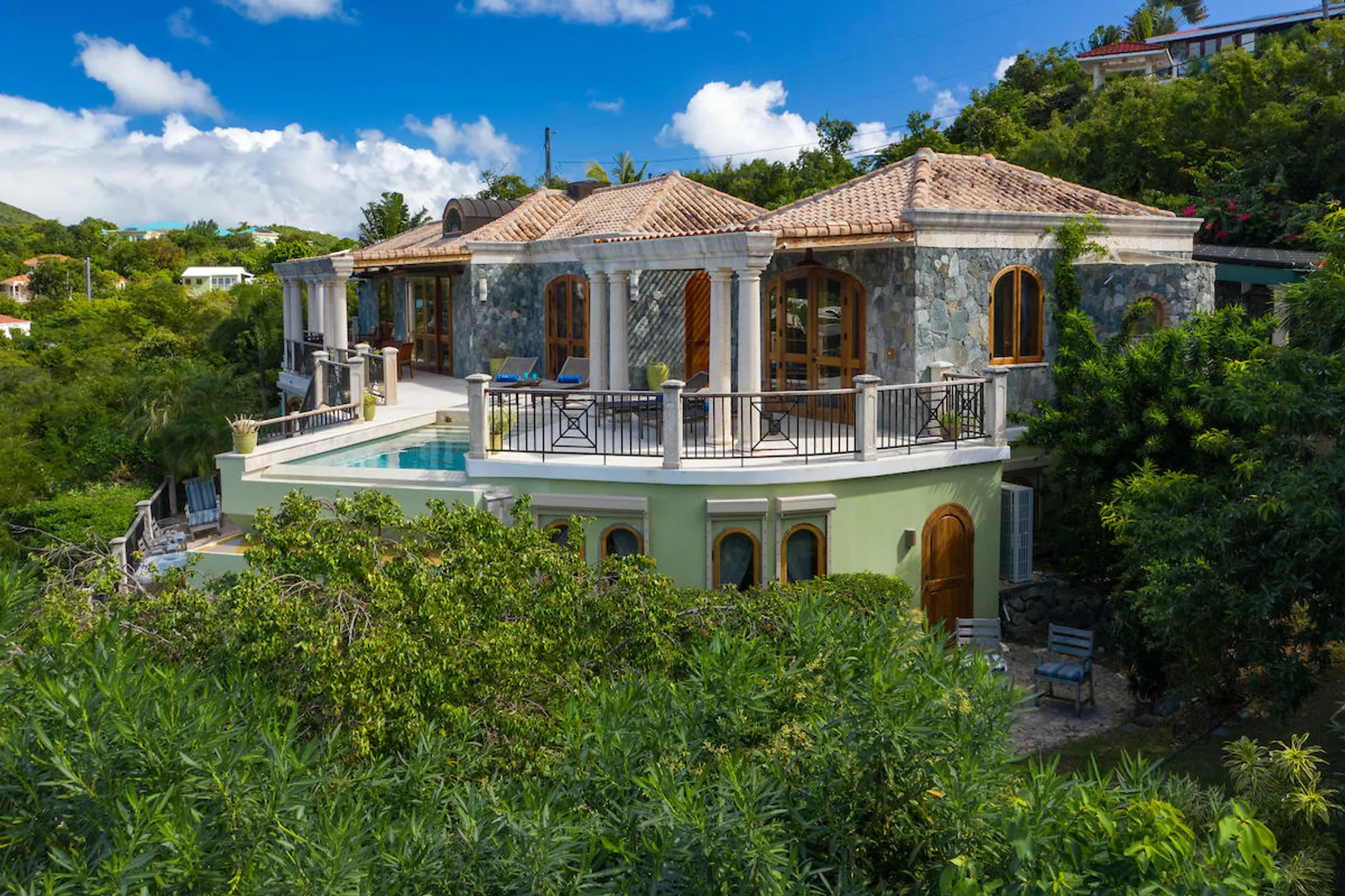 OCEANA VILLA reinvents Caribbean living at its finest in the 21st century. Situated in Great Cruz Bay, this masterpiece villa captures the summer sunset views of the Caribbean Sea and features native stonework and designer details throughout. This luxury Caribbean style 6 Bedroom, 6.5 bath home exudes natural elegance and features cathedral ceilings, custom lighting and furnishings, coral tile floors and decks as well as tropical wood doors and windows . The gated entry to the drive of the home and dramatic entrance into the Great Room, framed in beautiful, sustainable tropical hardwoods, make Oceana Villa a classic island showplace.