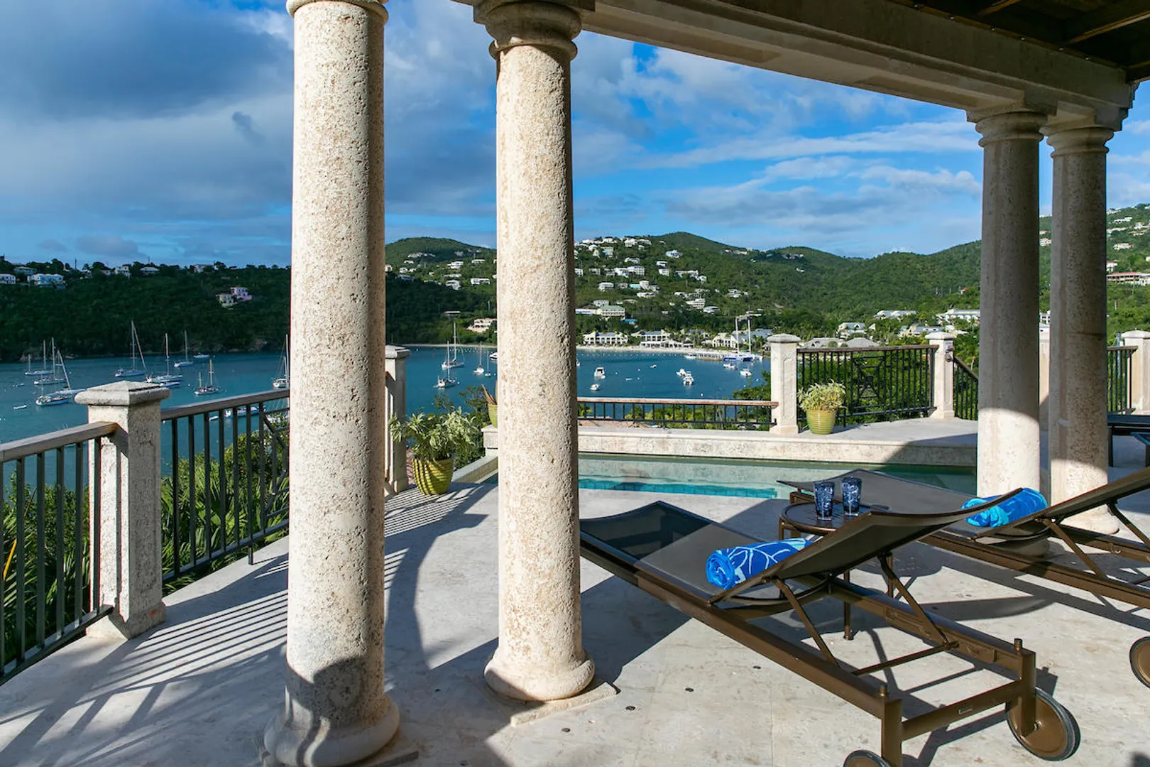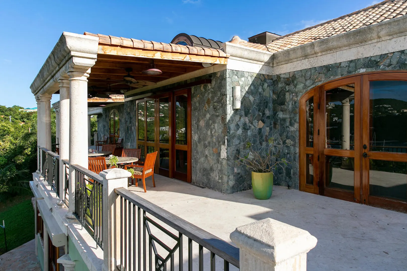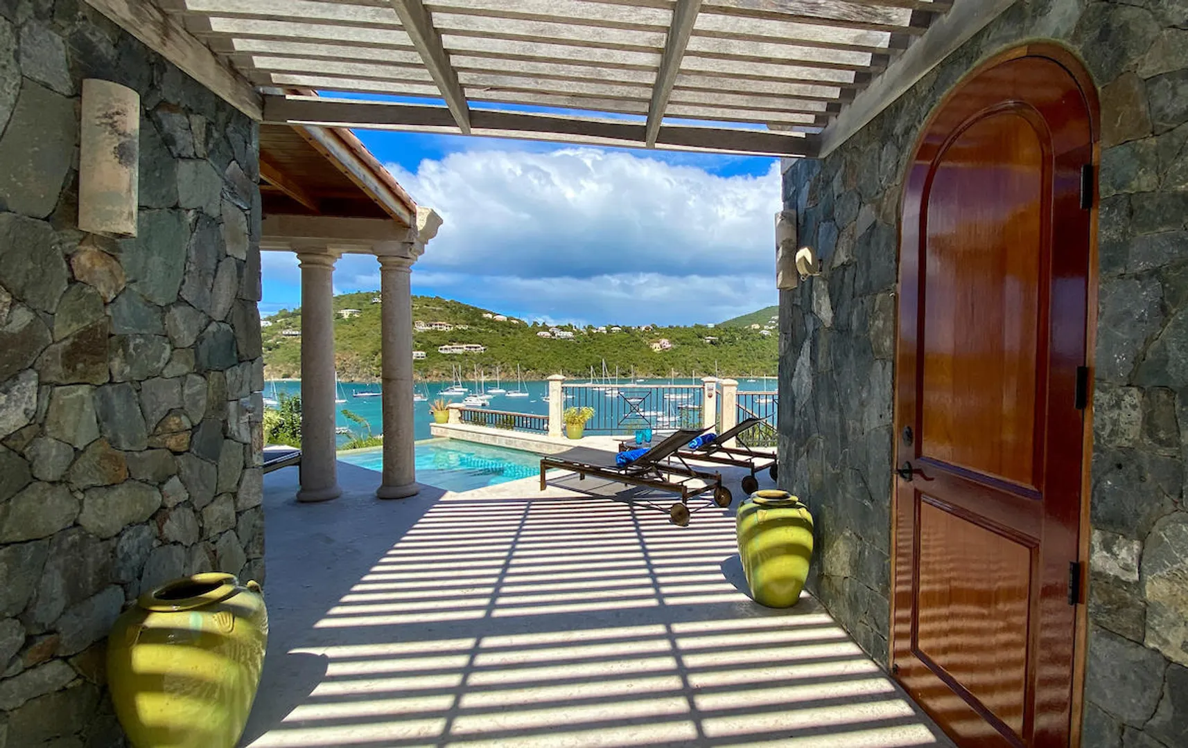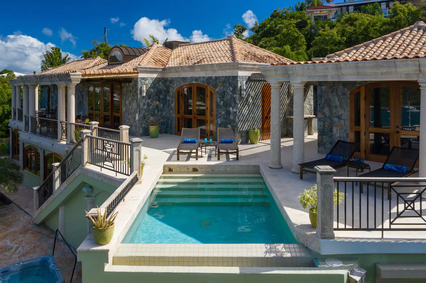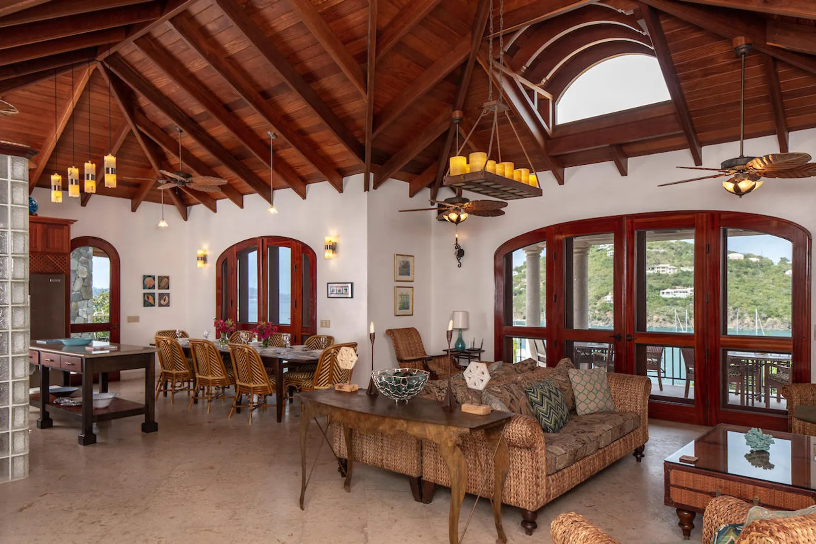OCEANA VILLA reinvents Caribbean living at its finest in the 21st century. Situated in Great Cruz Bay, this masterpiece villa captures the summer sunset views of the Caribbean Sea and features native stonework and designer details throughout. This luxury Caribbean style 6 Bedroom, 6.5 bath home exudes natural elegance and features cathedral ceilings, custom lighting and furnishings, coral tile floors and decks as well as tropical wood doors and windows . The gated entry to the drive of the home and dramatic entrance into the Great Room, framed in beautiful, sustainable tropical hardwoods, make Oceana Villa a classic island showplace.