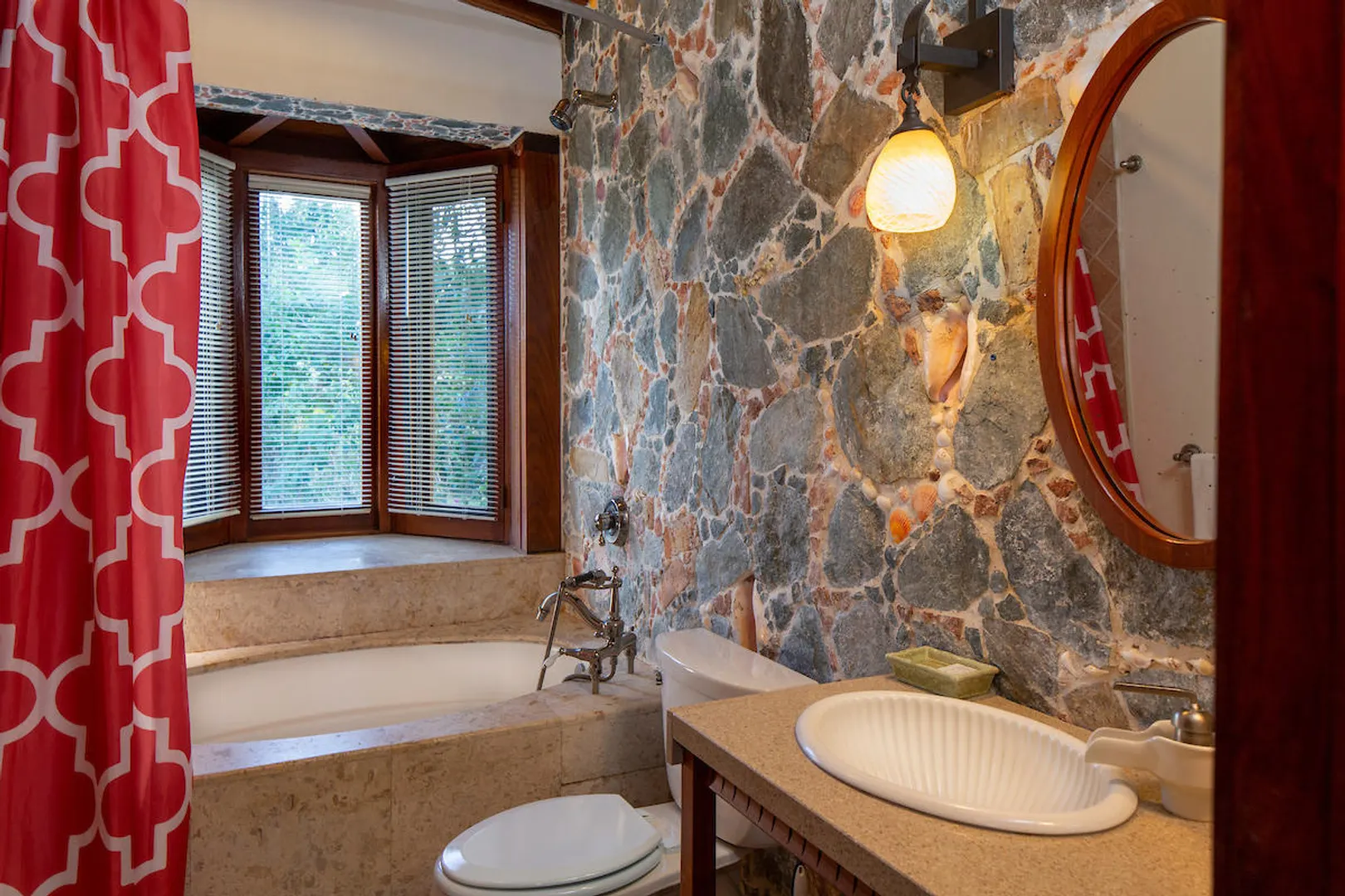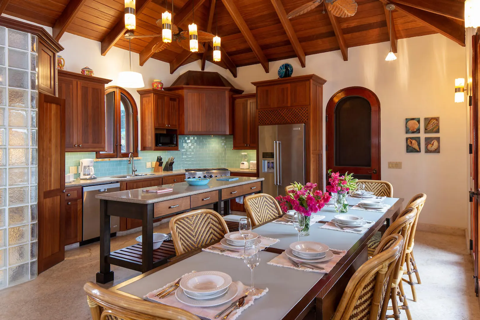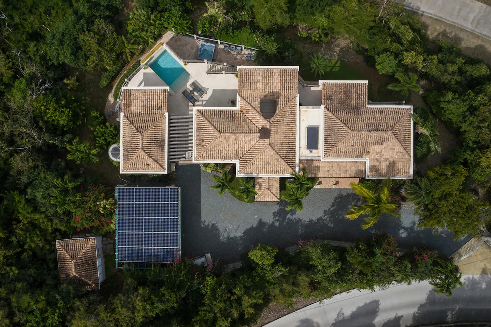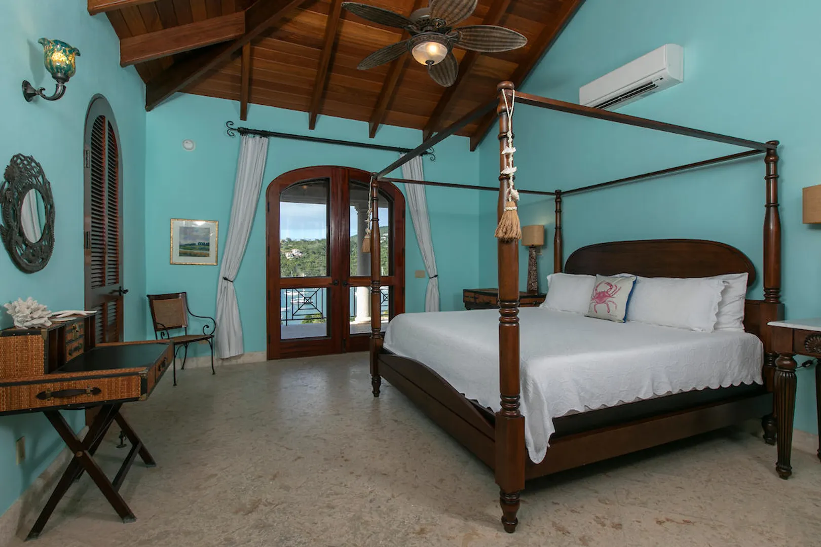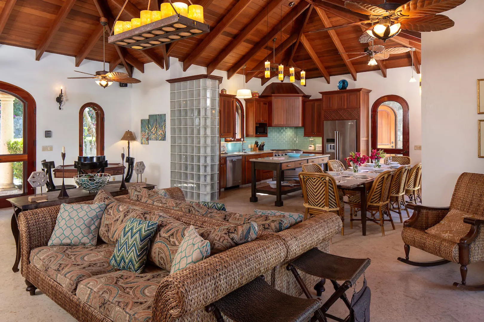 OCEANA VILLA reinvents Caribbean living at its finest in the 21st century. Situated in Great Cruz Bay, this masterpiece villa captures the summer sunset views of the Caribbean Sea and features native stonework and designer details throughout. This luxury Caribbean style 6 Bedroom, 6.5 bath home exudes natural elegance and features cathedral ceilings, custom lighting and furnishings, coral tile floors and decks as well as tropical wood doors and windows . The gated entry to the drive of the home and dramatic entrance into the Great Room, framed in beautiful, sustainable tropical hardwoods, make Oceana Villa a classic island showplace.
