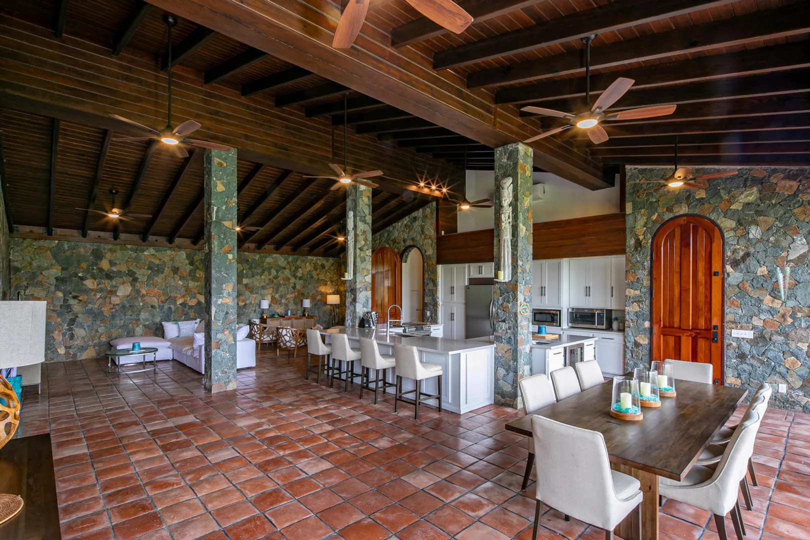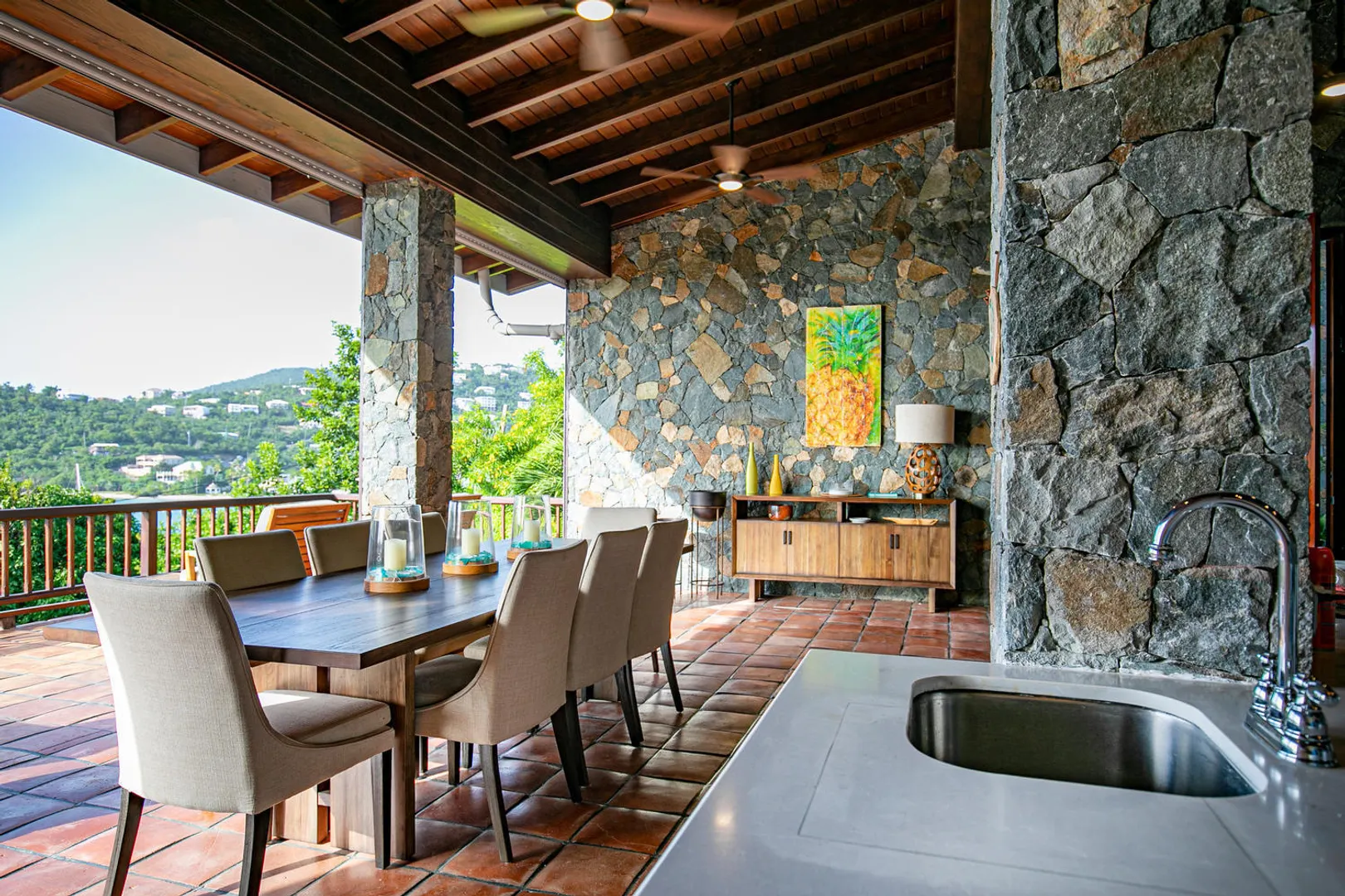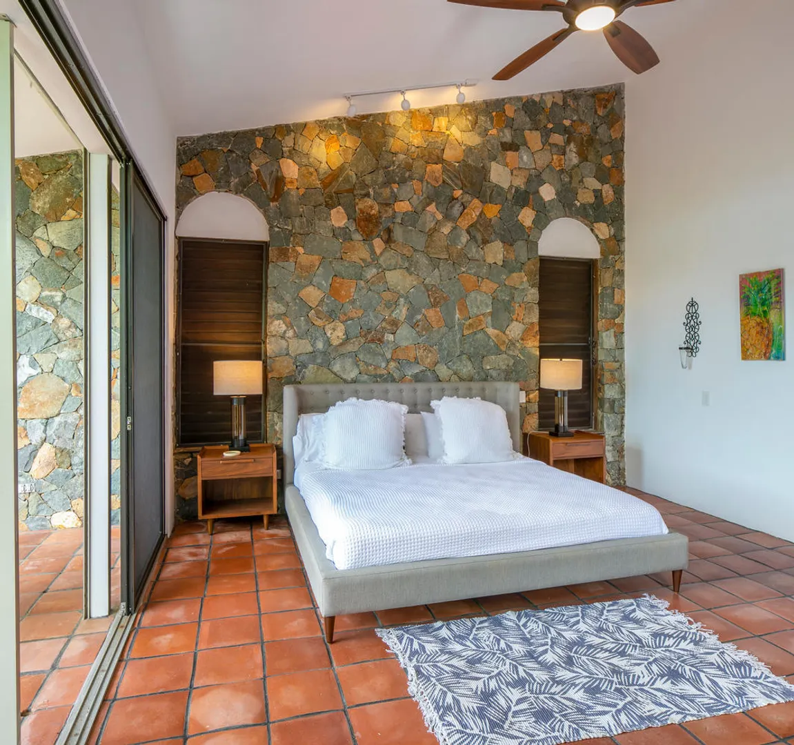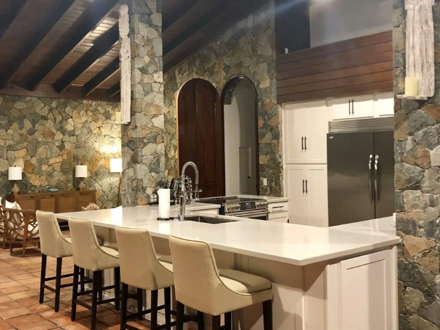 With mostly level land at the end of a gated drive, this property offers endless possibilities as a private retreat. Sunset Villa is sited on one lot and the adjacent lot offers room for expansion or as privacy. A traditional Caribbean style home constructed of local stone, modernized and updated. The great room functions beautifully with a huge, central cook's kitchen with pantry, bar and dining area, comfortable living and TV area and convenient full bath. Three fully air-conditioned bedrooms are situated on either side of the great room with a 4th located on the lower pool level. An inviting pool & expansive patio area are surrounded by stone walls, pathways and extensive landscaping.