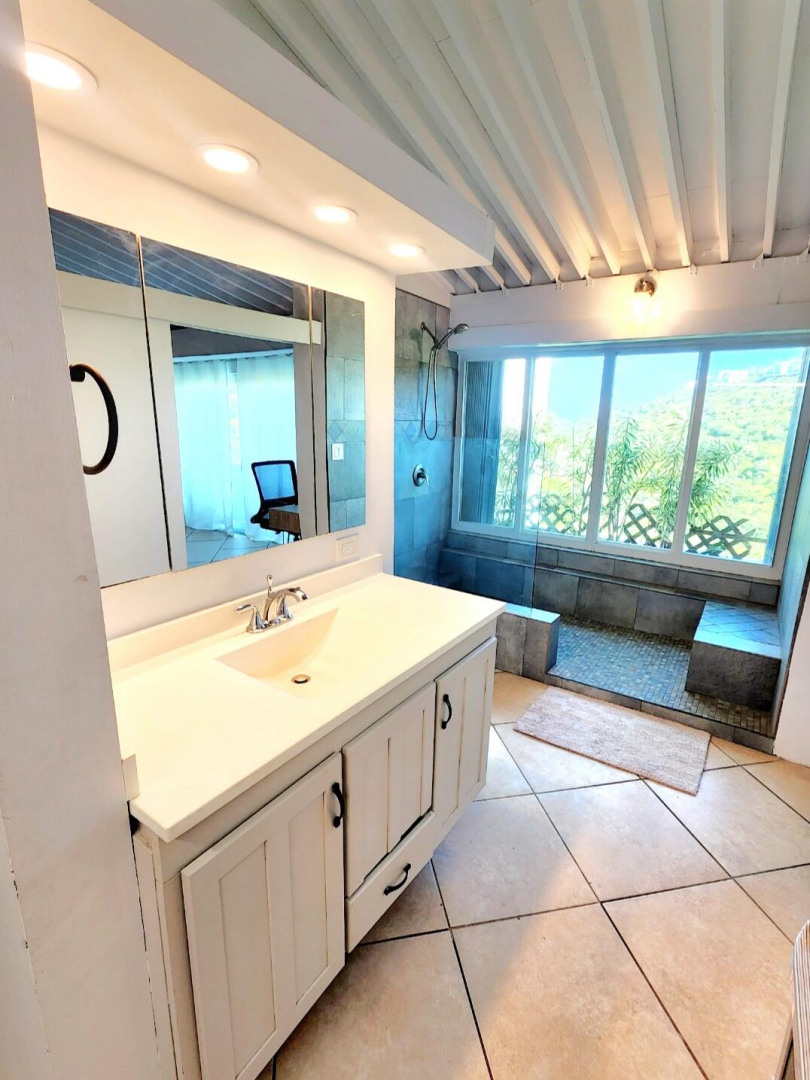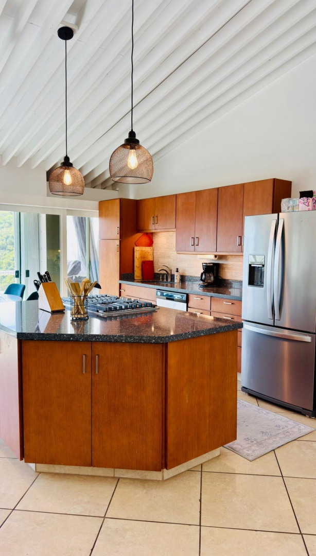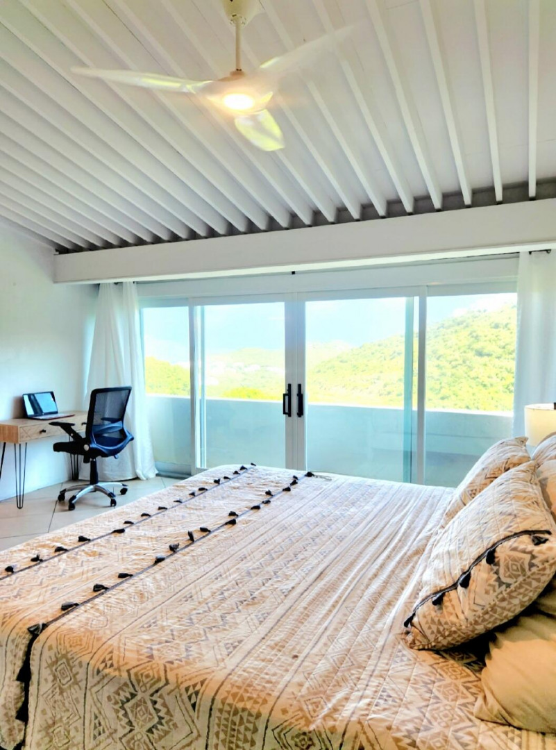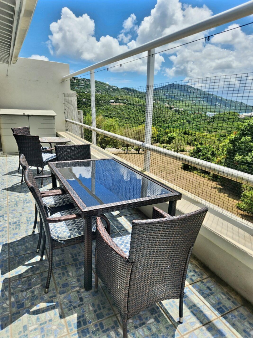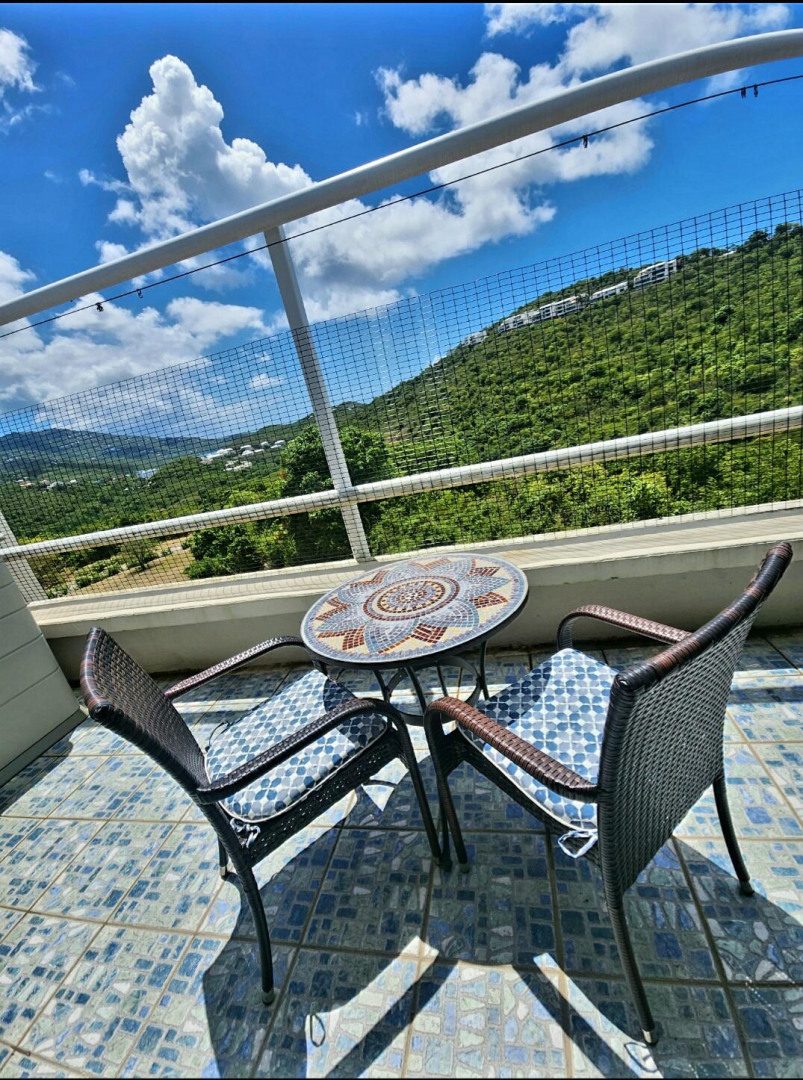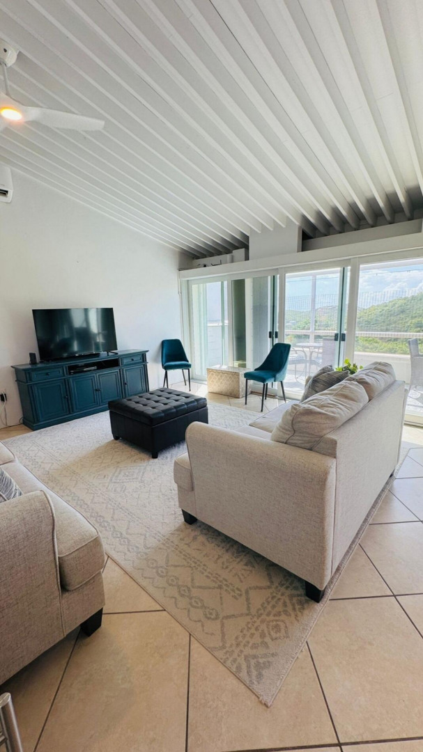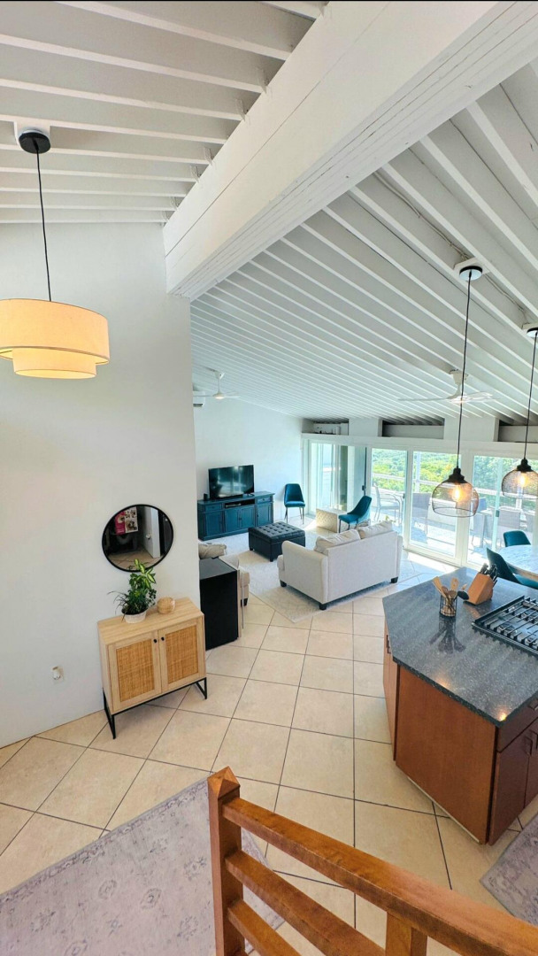 Turn key apartment in the desirable Mahogany Run neighborhood. This rare split level layout features cathedral ceilings, expanded bedrooms, quartz kitchen counters , open entertaining space, in unit w/d, dishwasher, a/c, and Ecoflow backup batteries when power goes out. All nestled in private, cul-de-sac location, with good flat parking. Walk out onto the large porch where you are greeted with panoramic hillside and valley views that descend into Magens Bay.. If you are seeking a rental that feels more like a home than a condo, is 5 minutes or less to Magens Bay, offers privacy and has a 24 hour security guard, look no further. Listing agent is property owner.