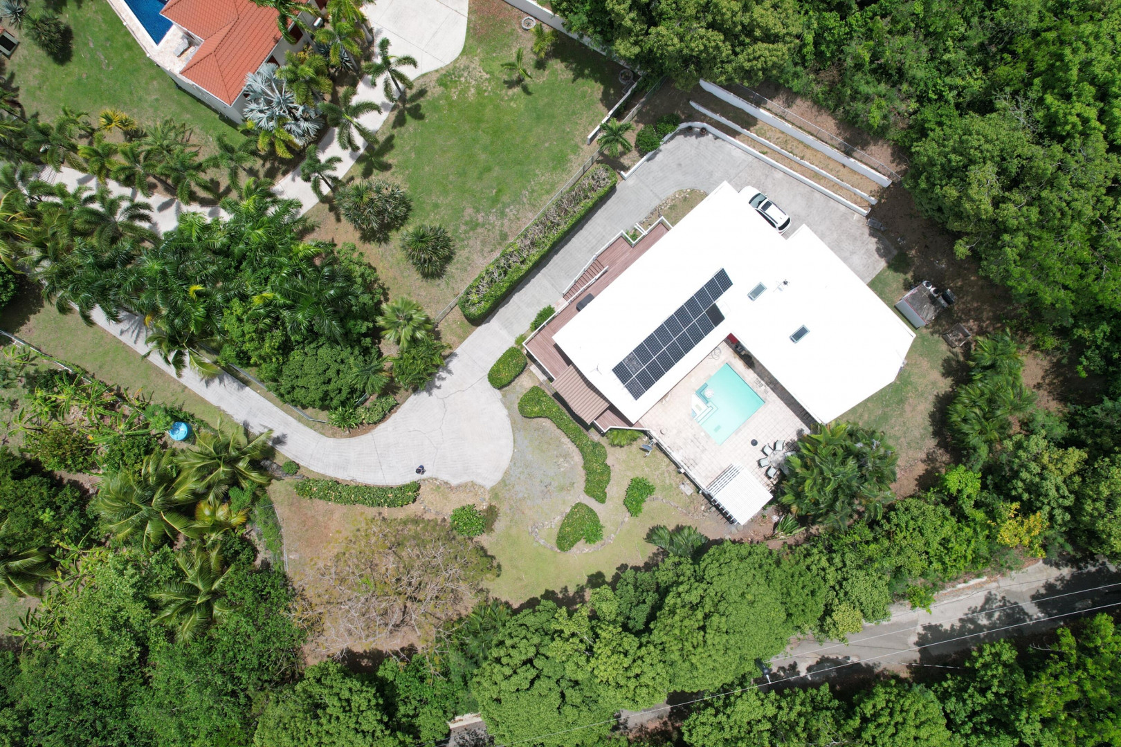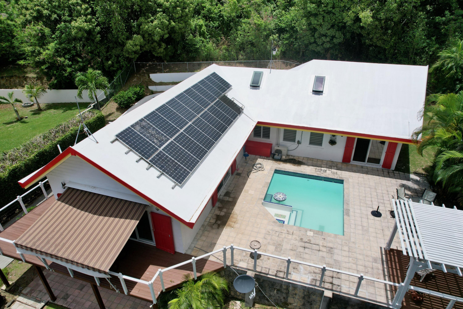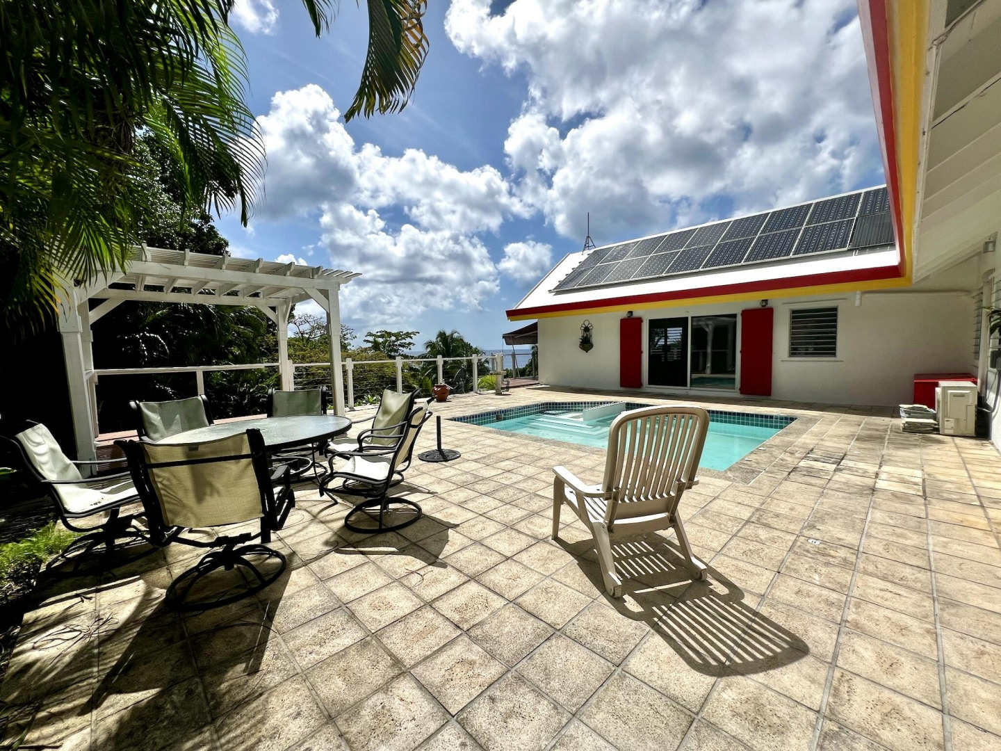 Tucked away on St. Croix's lush northside, this 3-bedroom, 2-bathroom home is a peaceful island escape with space, comfort, and privacy. Surrounded by mature landscaping, the home is filled with natural light and features an open kitchen and living area with high ceilings and a loft space perfect for storage or a cozy reading nook. Enjoy modern comforts with solar power and mini-split A/C units in all bedrooms for efficient cooling. Step outside to a large deck with a pergola, pool, and slight sea views -- ideal for relaxing or entertaining under the Caribbean sky. The downstairs apartment with its own patio offers great potential for guests or rental income.Located just 5 minutes from Cane Bay and 30 minutes from Christiansted, this property offers the best of quiet island living with easy access to beaches, diving, dining, and more.