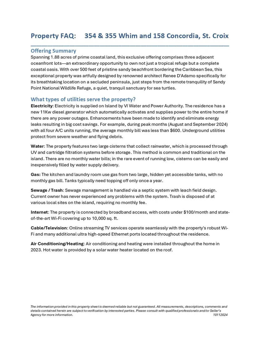 Discover a breathtaking oceanfront retreat on St. Croix's picturesque west end, easily accessible from major cities, no passport needed for U.S. citizens! The extraordinary 1.88-acre coastal oasis features 3 adjacent lots with 500+ ft. of pristine beachfront bordering the Caribbean Sea, steps from Sandy Point. Designed by architect Renee D'Adamo, the residence blends indoor/outdoor living, offering stunning sunrises, panoramic views, and soothing ocean sounds. Enjoy the gourmet kitchen with custom mahogany, dual fridges, and captivating ocean views. With two tranquil bedroom suites, a wraparound outdoor gallery, and a pergola for al fresco dining, this sanctuary promises luxury and relaxation. Embrace an unparalleled coastal lifestyle and unforgettable experiences in this unique paradise.