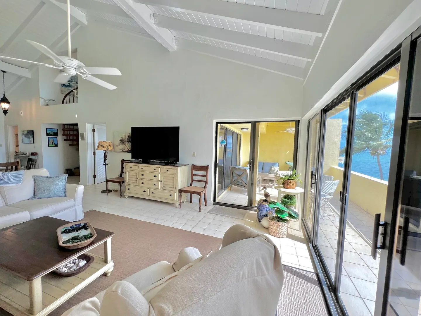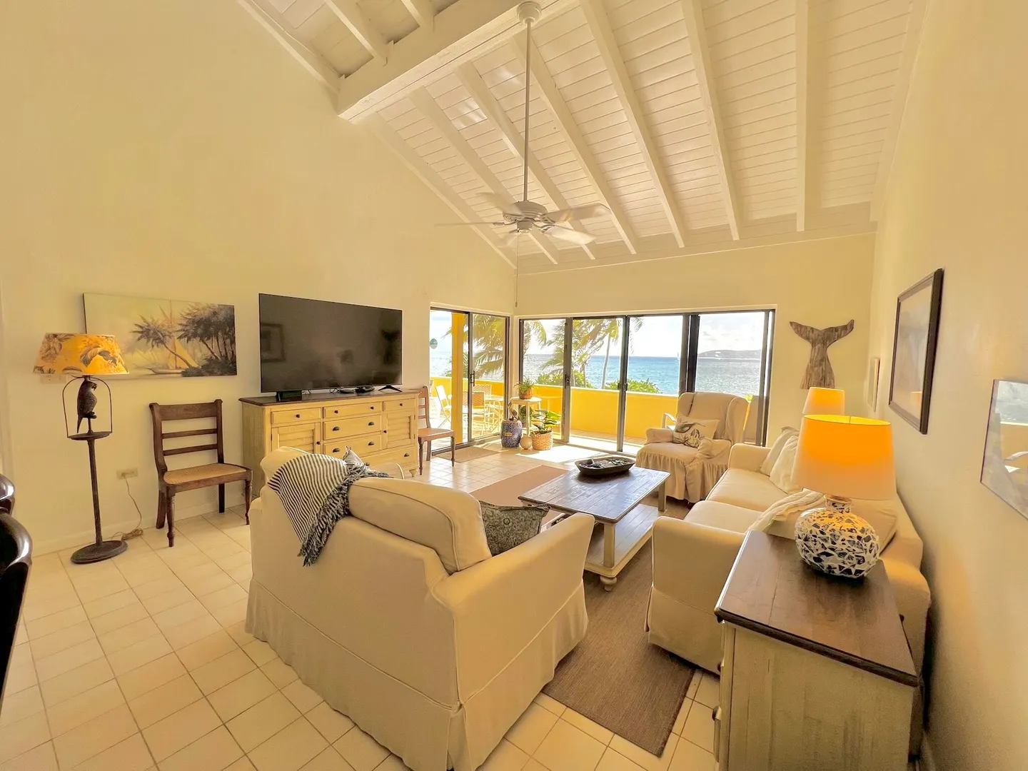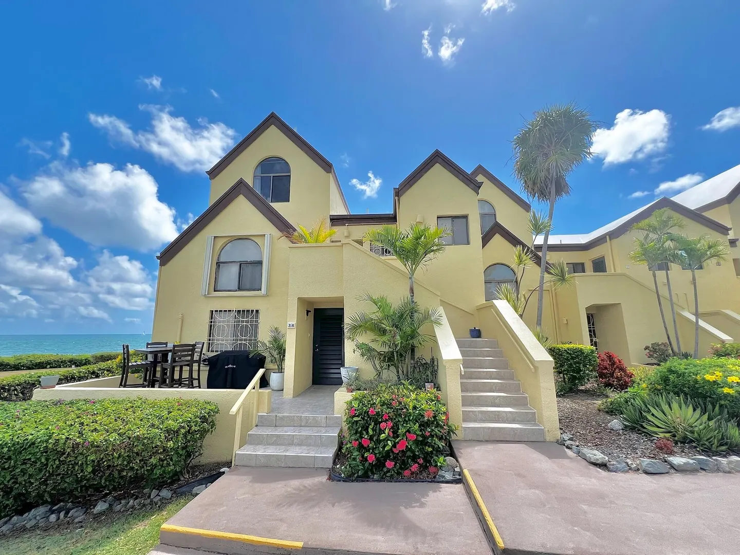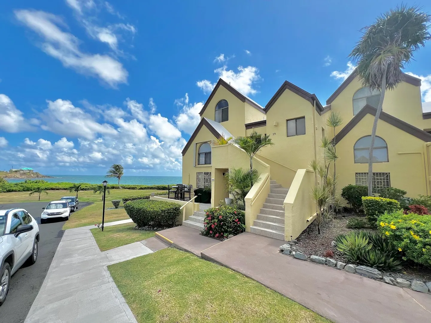 PRIME condo location in the popular beachfront complex of Candle Reef II. This 3-bedroom, 2.5 bath upper level, end unit condo has straight on Buck Island views and also views of Pull Point. It is located only steps from a sandy beach lined with tropical palms and crystal clear water. The main level encompasses an open great room with soaring ceilings, primary suite with full bath ensuite, half bath and spacious covered gallery. The second level consists of two spacious guest bedrooms and one full bath, with Buck views from one bedroom and Pull Point and sugar mill views from the other. Perfect and private for guests! The master suite is spacious and airy, illuminated by natural sunlight and cooled by the constant Caribbean breeze. Wake up and enjoy the view from the covered seating areawith a nice cup of coffee before a beach walk and swim. The primary suite opens directly to the gallery that spans the width of the condo.