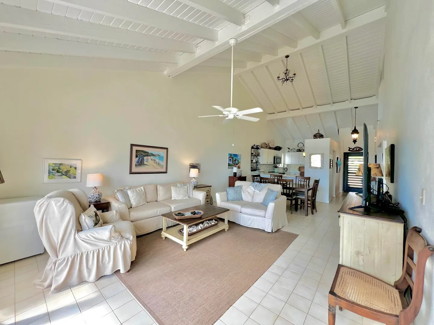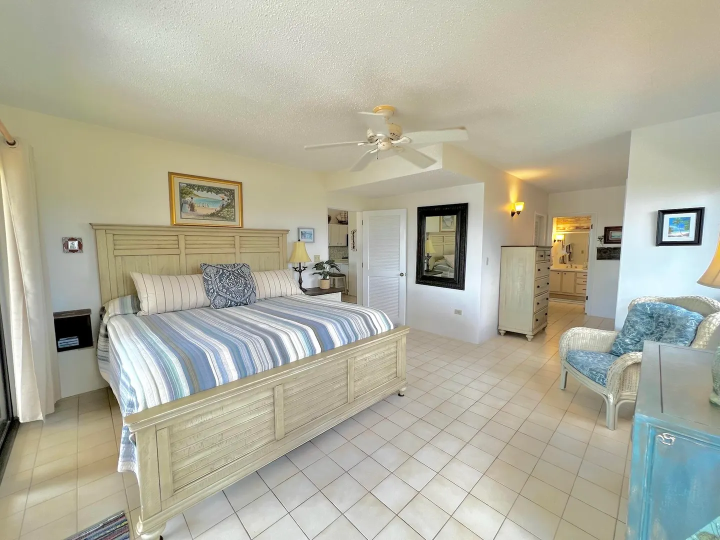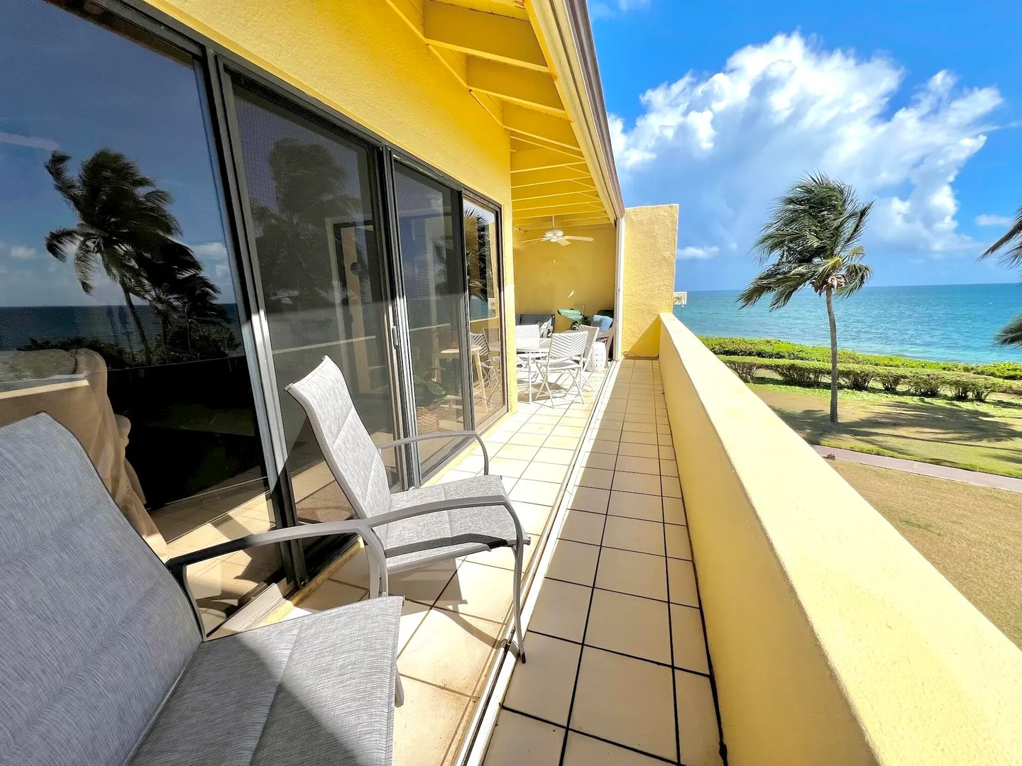 PRIME condo location in the popular beachfront complex of Candle Reef II. This 3-bedroom, 2.5 bath upper level, end unit condo has straight on Buck Island views and also views of Pull Point. It is located only steps from a sandy beach lined with tropical palms and crystal clear water. The main level encompasses an open great room with soaring ceilings, primary suite with full bath ensuite, half bath and spacious covered gallery. The second level consists of two spacious guest bedrooms and one full bath, with Buck views from one bedroom and Pull Point and sugar mill views from the other. Perfect and private for guests! The master suite is spacious and airy, illuminated by natural sunlight and cooled by the constant Caribbean breeze. Wake up and enjoy the view from the covered seating areawith a nice cup of coffee before a beach walk and swim. The primary suite opens directly to the gallery that spans the width of the condo.