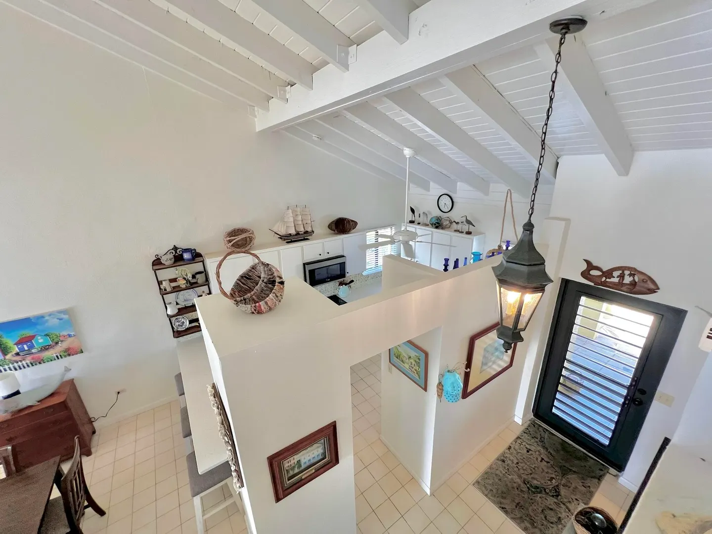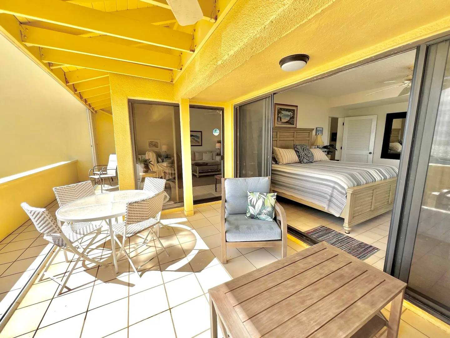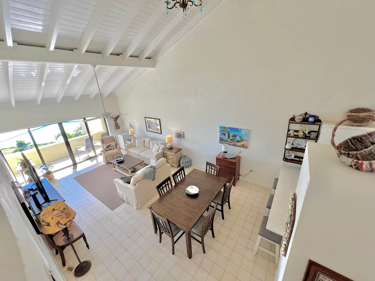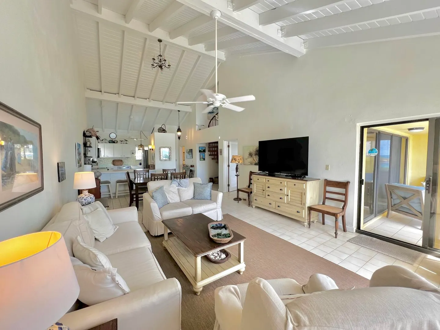 PRIME condo location in the popular beachfront complex of Candle Reef II. This 3-bedroom, 2.5 bath upper level, end unit condo has straight on Buck Island views and also views of Pull Point. It is located only steps from a sandy beach lined with tropical palms and crystal clear water. The main level encompasses an open great room with soaring ceilings, primary suite with full bath ensuite, half bath and spacious covered gallery. The second level consists of two spacious guest bedrooms and one full bath, with Buck views from one bedroom and Pull Point and sugar mill views from the other. Perfect and private for guests! The master suite is spacious and airy, illuminated by natural sunlight and cooled by the constant Caribbean breeze. Wake up and enjoy the view from the covered seating areawith a nice cup of coffee before a beach walk and swim. The primary suite opens directly to the gallery that spans the width of the condo.
