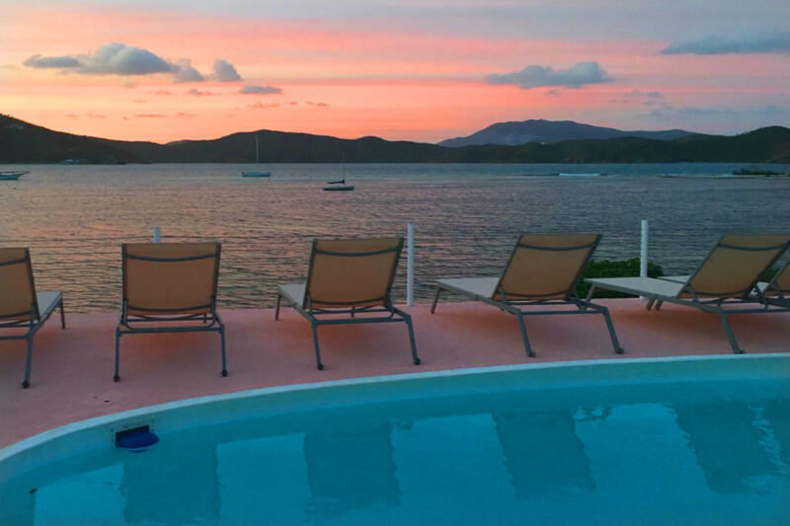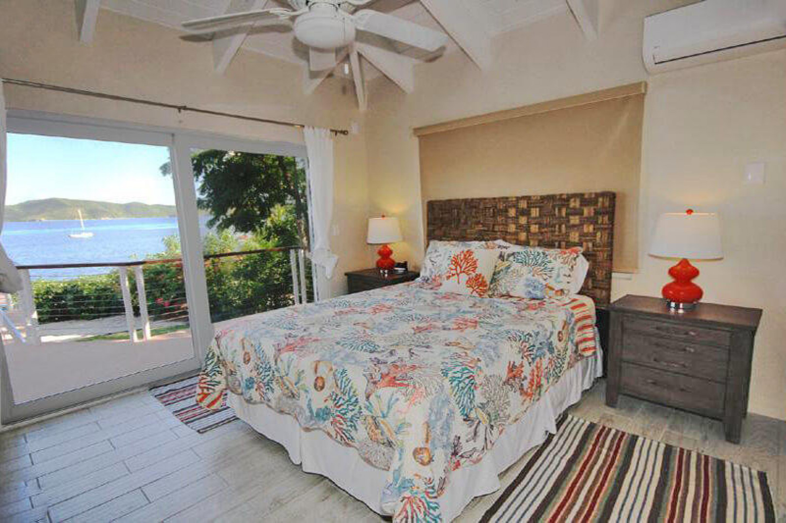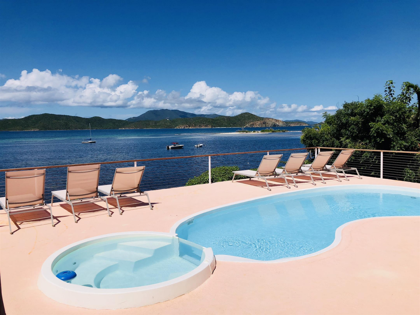 Fabulous BEACHFRONT home with a sandy, swimmable beach on a FLAT LOT. RAINBOW BEACH is a solid masonry pool villa that recently received a complete makeover. Click photo#2 for 3-D Virtual tour. The home has 4 air-conditioned bedrooms all featuring water views and en-suite baths. Located on a quiet cove within gated Johnson's Bay Estates, RB is only minutes from Coral Bay restaurants and shopping and only a few miles further to National Park beaches. Upgrades include new tile throughout, all new windows, exterior doors and sliding doors, complete new kitchen, new bathrooms, fixtures and all new furnishings. The home has been freshly painted inside and out. Paved access on a flat estate road. Amenities include a fantastic pool deck and spa. Excellent rental history and an excellent buy.