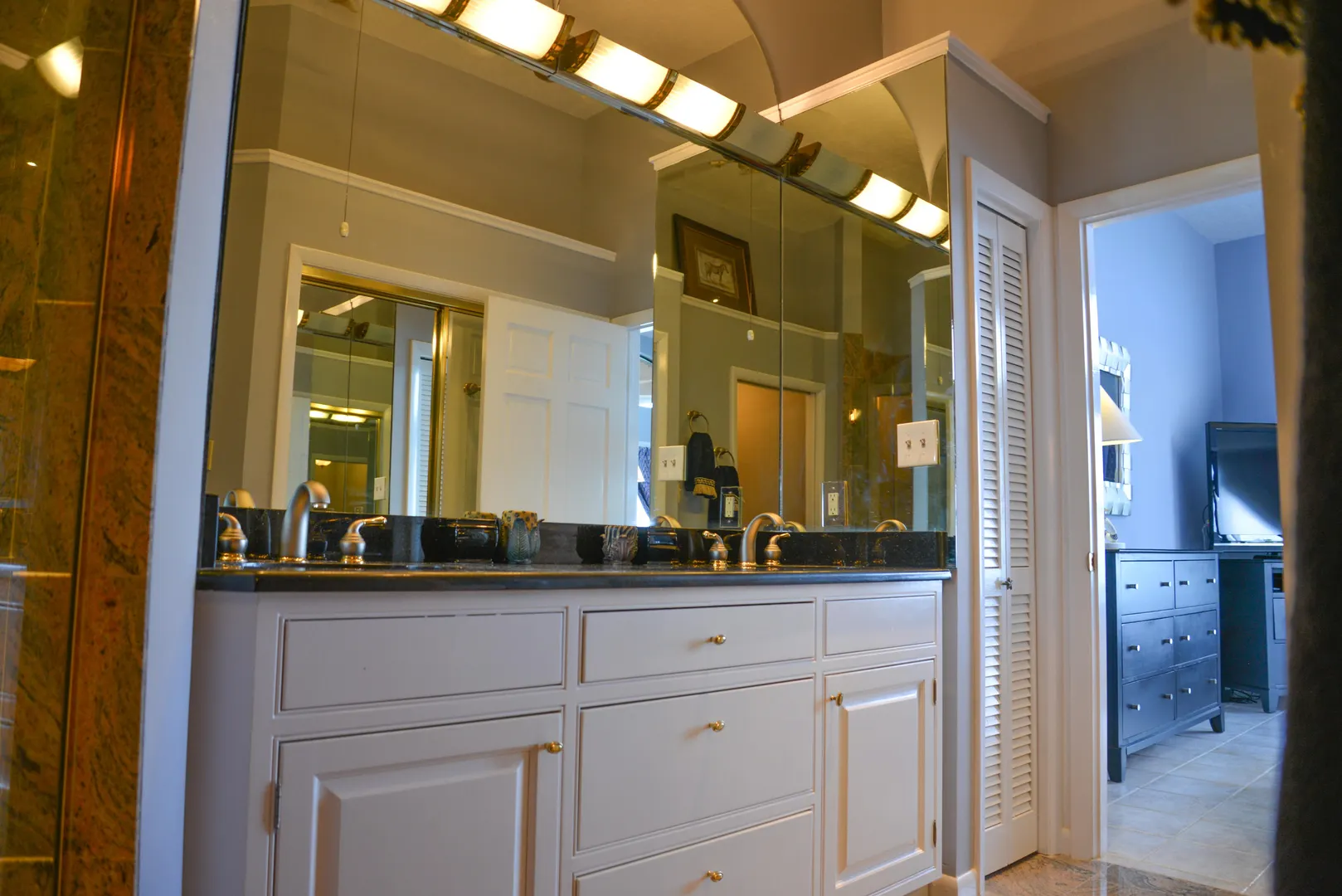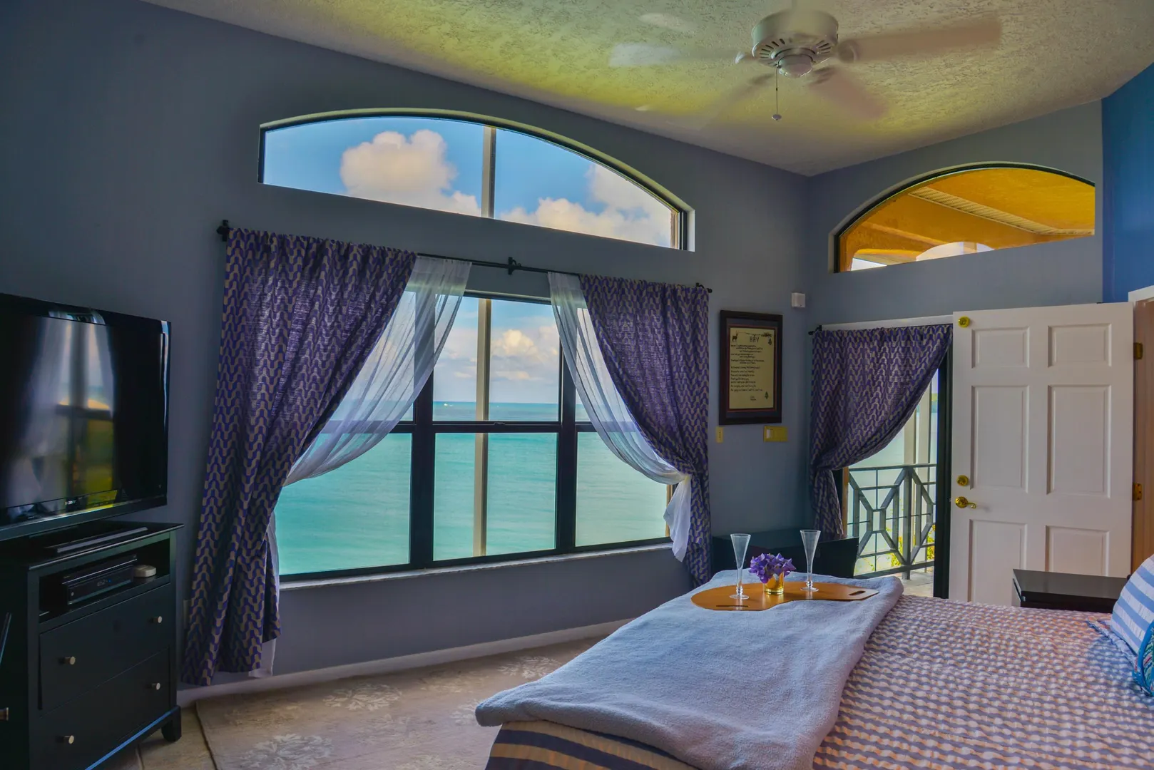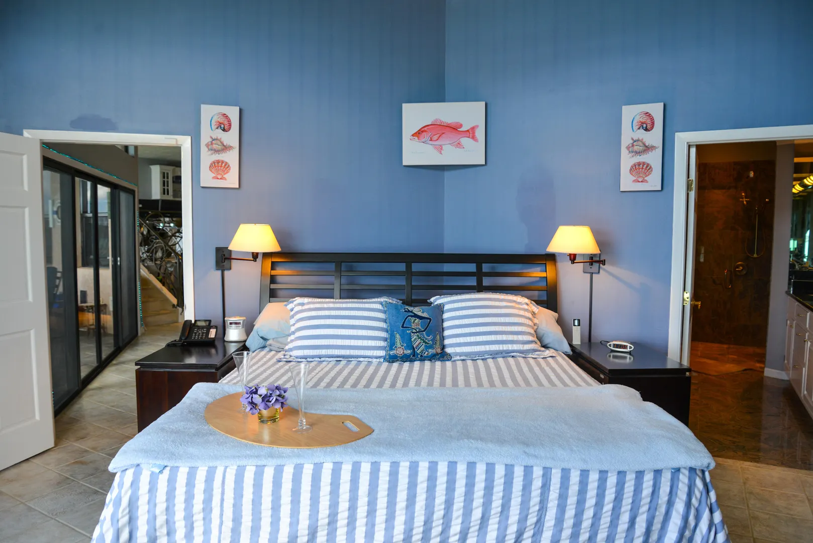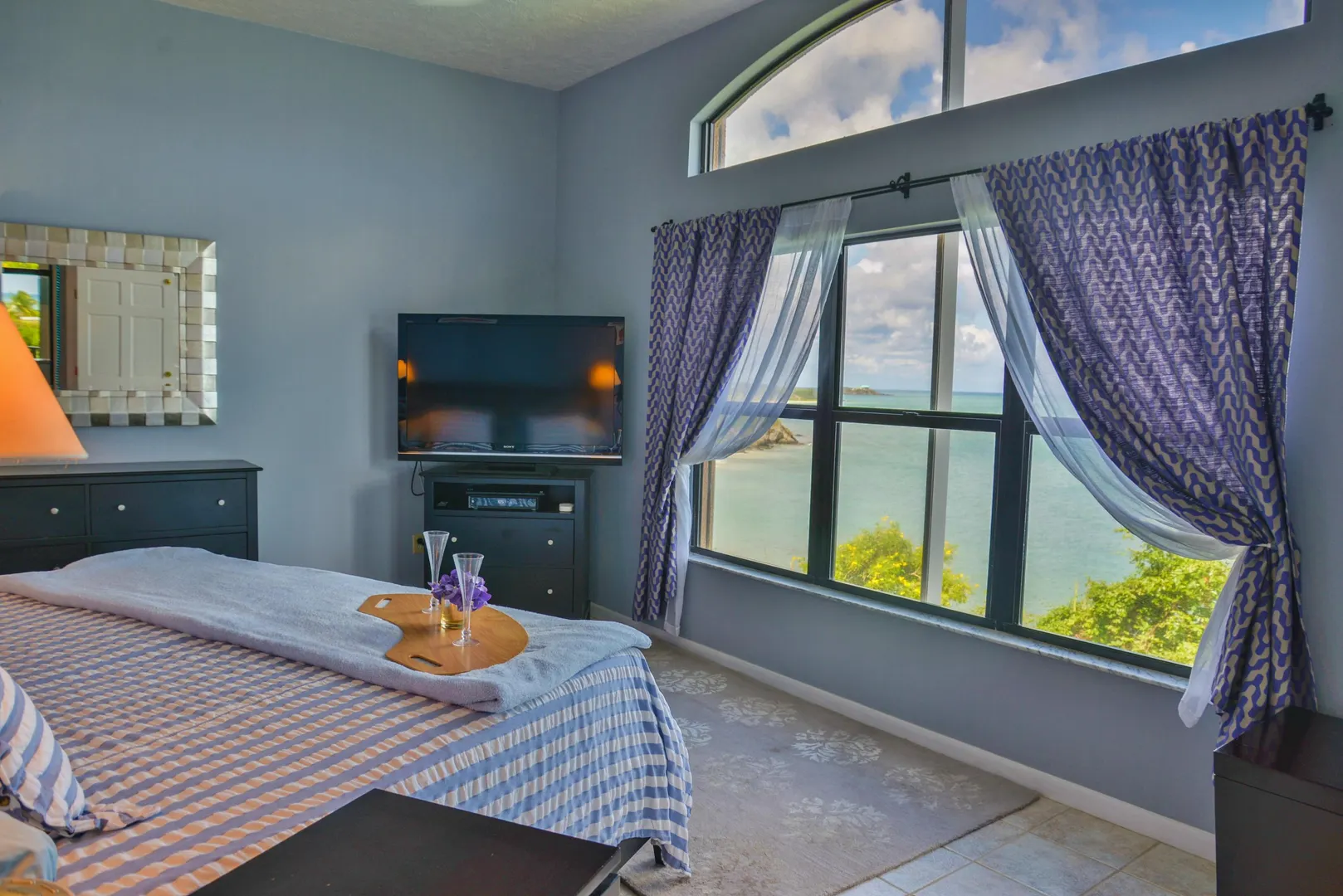 The Master king-sized bedroom, with high ceilings and amazing ocean and Buck Island views, has a slider entrance to the gallery, an ensuite master bath, marble tiled two-person shower, a private lavatory, dual sinks, and high ceilings.