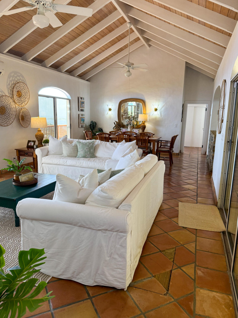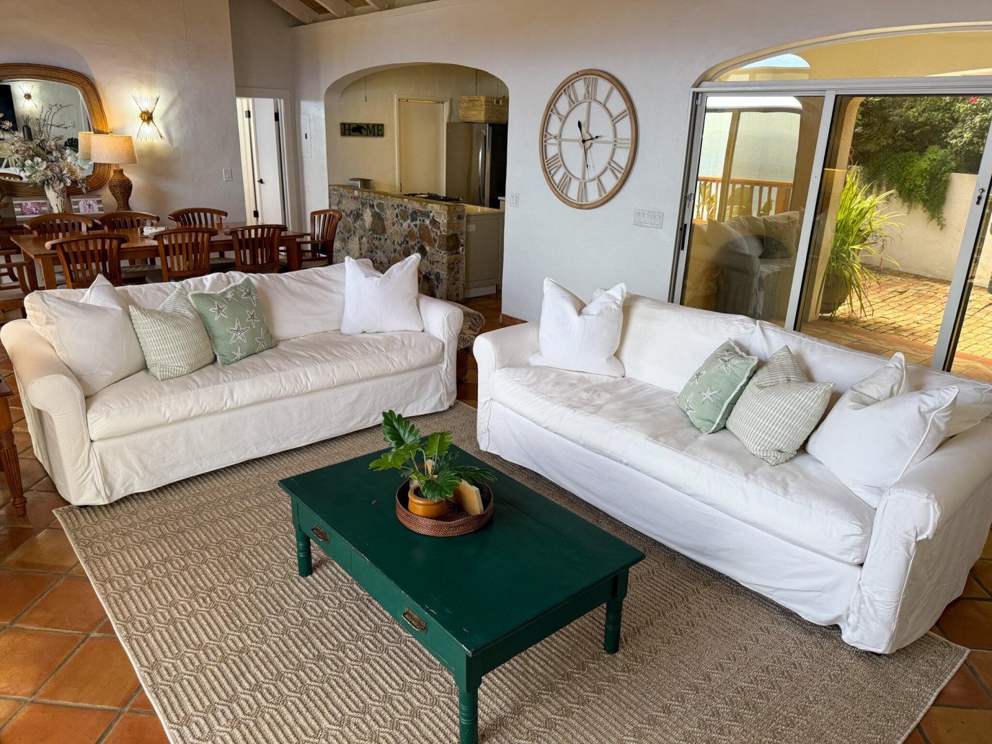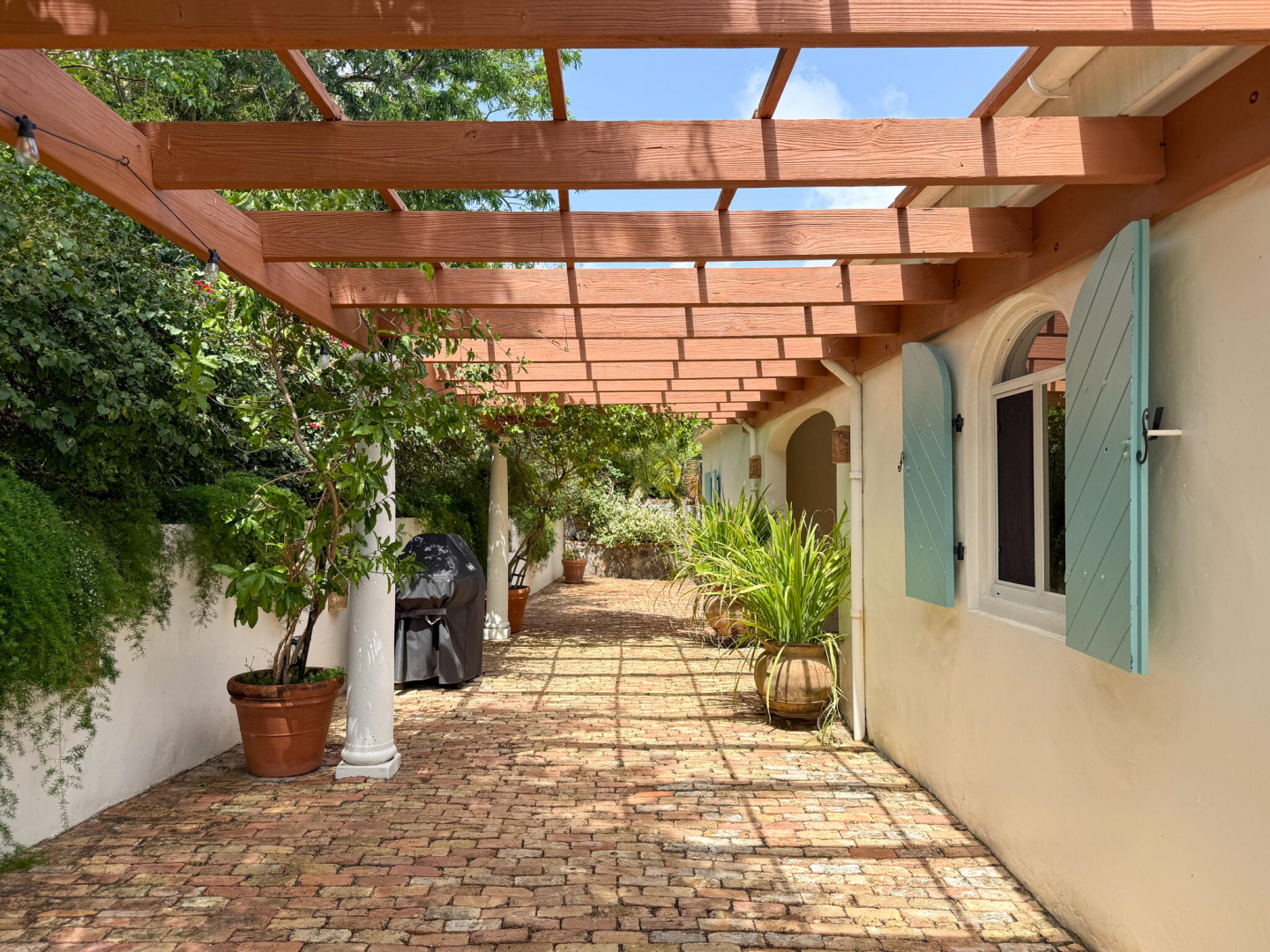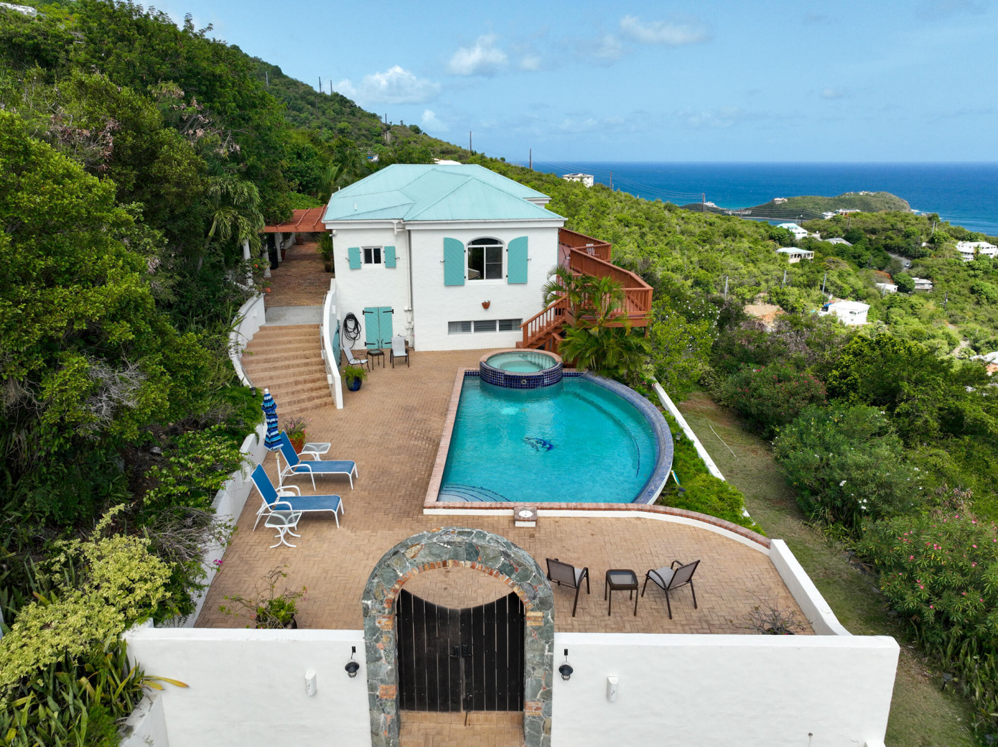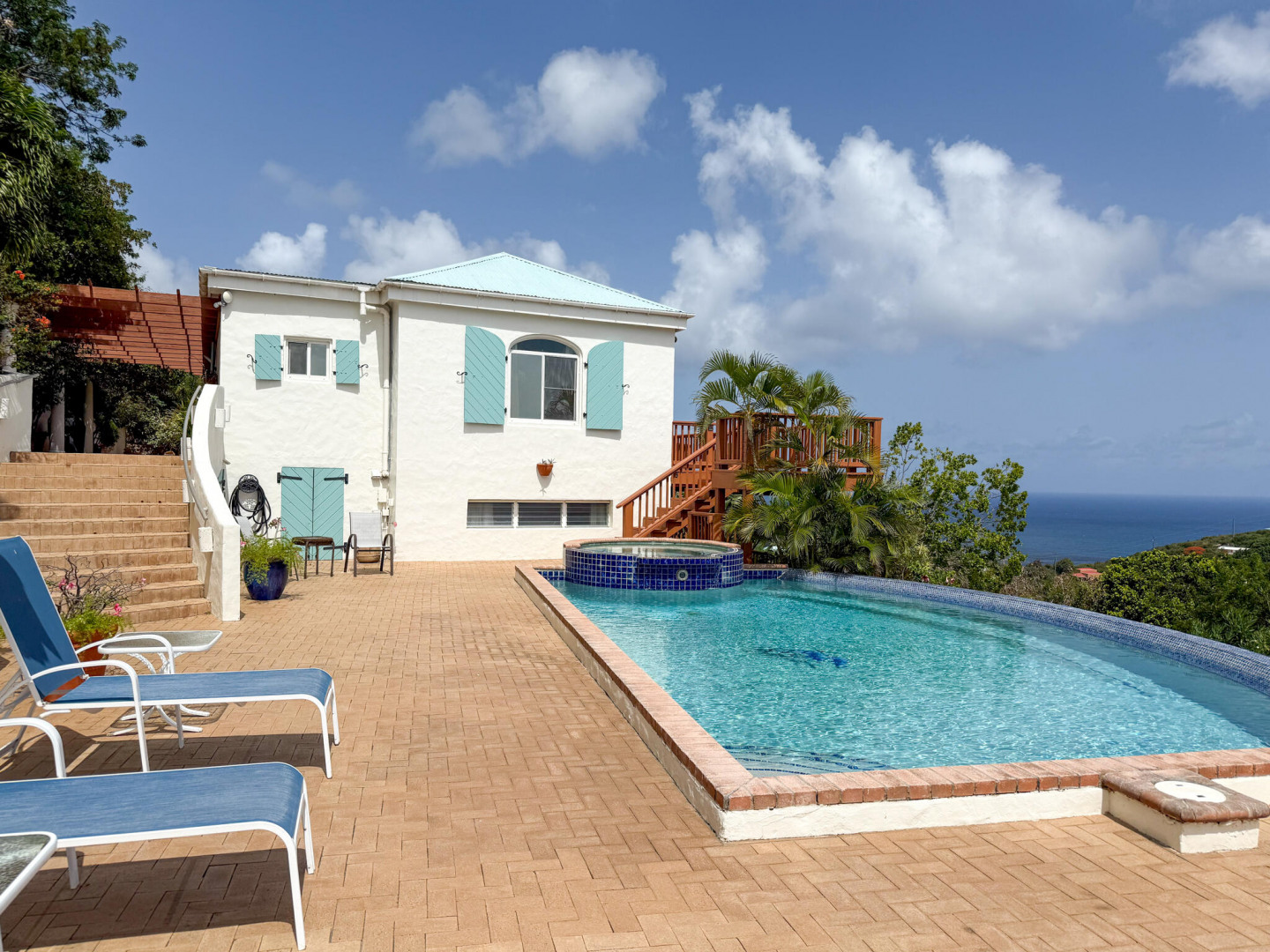 La Papaya is a versatile 2-unit concrete villa in Chocolate Hole, offering sweeping sunset views. This solidly built property boasts a two unit layout, allowing for added benefits for buyers exploring loan options. The main house features 3 spacious bedrooms, designed with light & airy beach-inspired decor. Open concept living, dining, & kitchen areas flow seamlessly out to an expansive deck. The lower level apartment offers 2 additional bedrooms, separate living area, & private access, ideal for guests or rental income. Between the two units lies a brick-paved pool deck with a large pool & jacuzzi with a waterfall feature. Professionally landscaped with tropical blooms, fruit trees, & a grassy lawn, La Papaya is a private, welcoming retreat with excellent rental potential + room to grow.