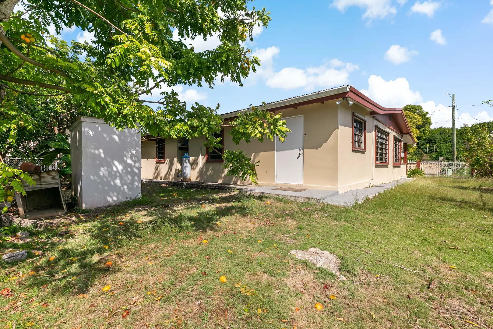 Step into this well-maintained 4-bedroom, 2-bathroom single-family home with 1,500 sq. ft. of living space. It offers updated bathrooms, a laundry/utility room, a fully fenced backyard with fruit trees and a tool shed, a covered porch, and a carport. The cistern is cleaned and painted, public water is available, and the owner is willing to provide a refrigerator, stove, and microwave. Landscaping and pest control are included.Located in Estate Strawberry Hill, just 5-10 minutes from schools, shopping centers, hospitals, the amphitheatre, and everyday conveniences. Perfect for those seeking comfort, privacy, and convenience.