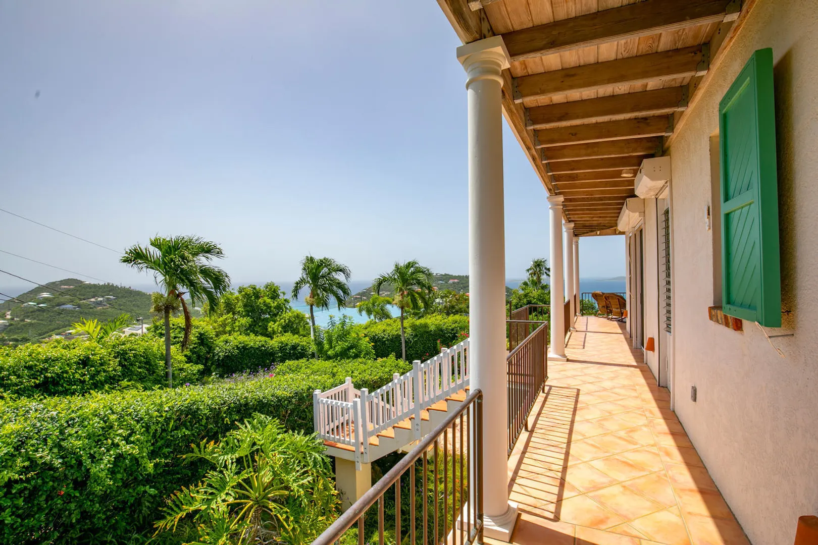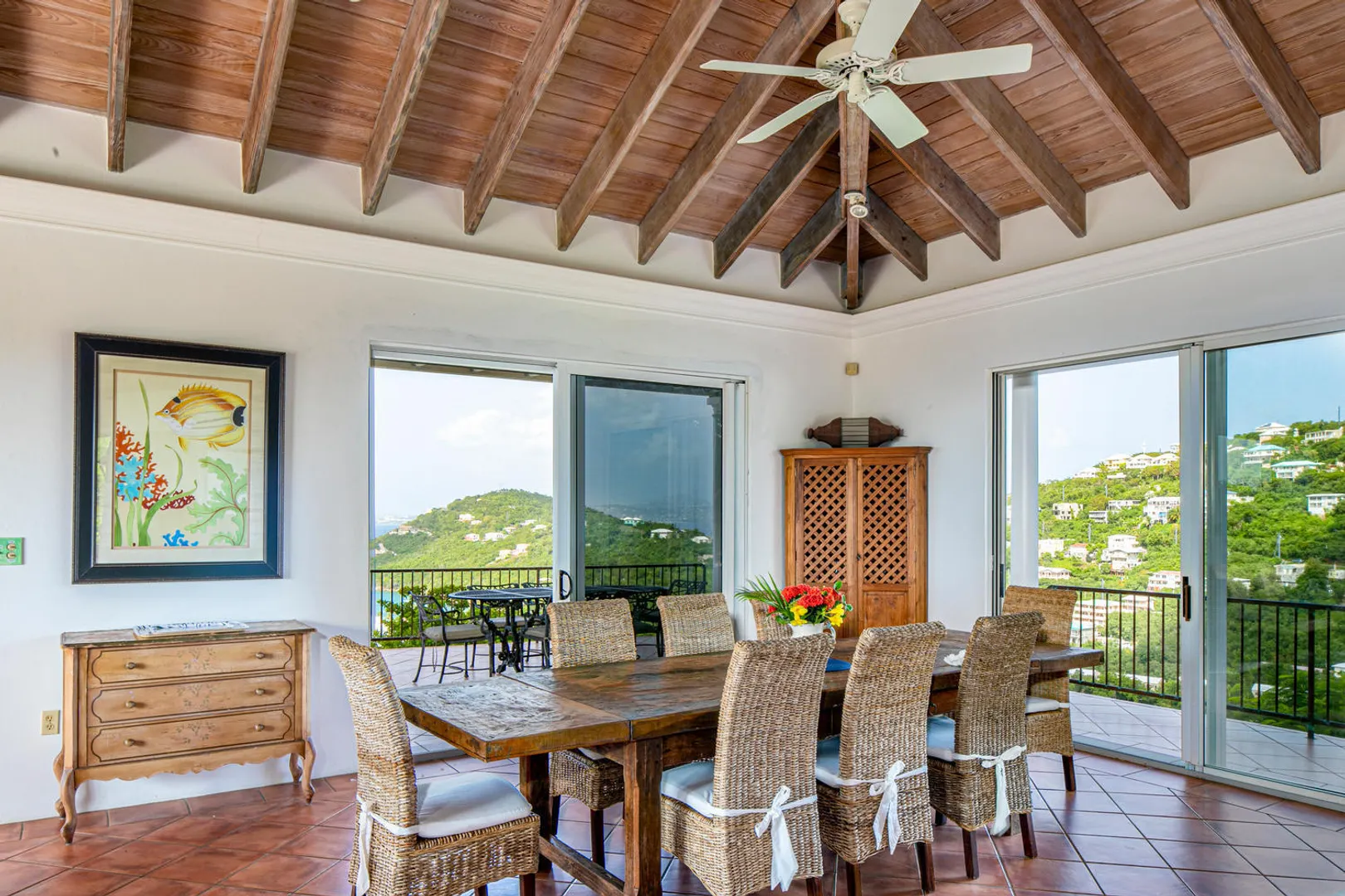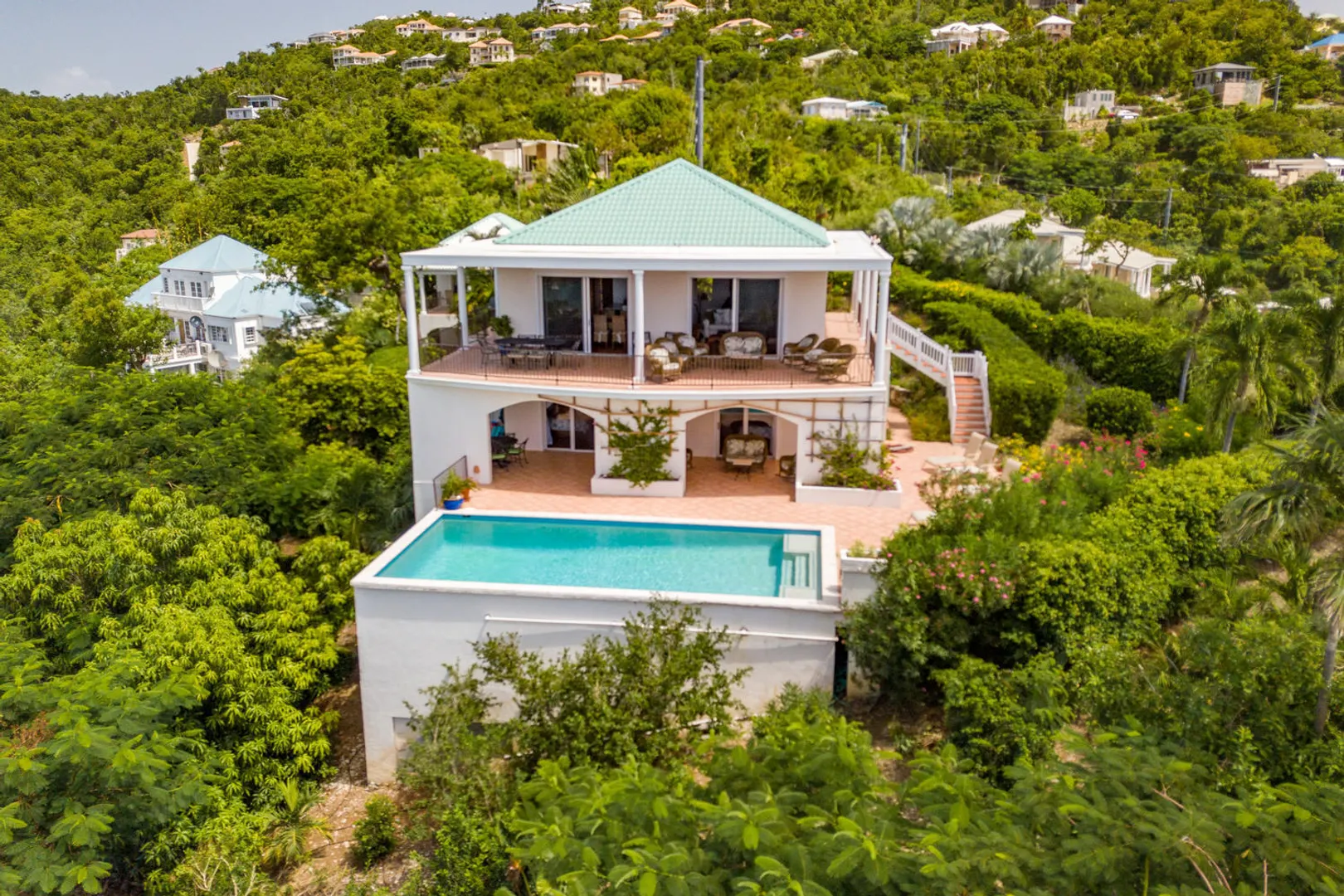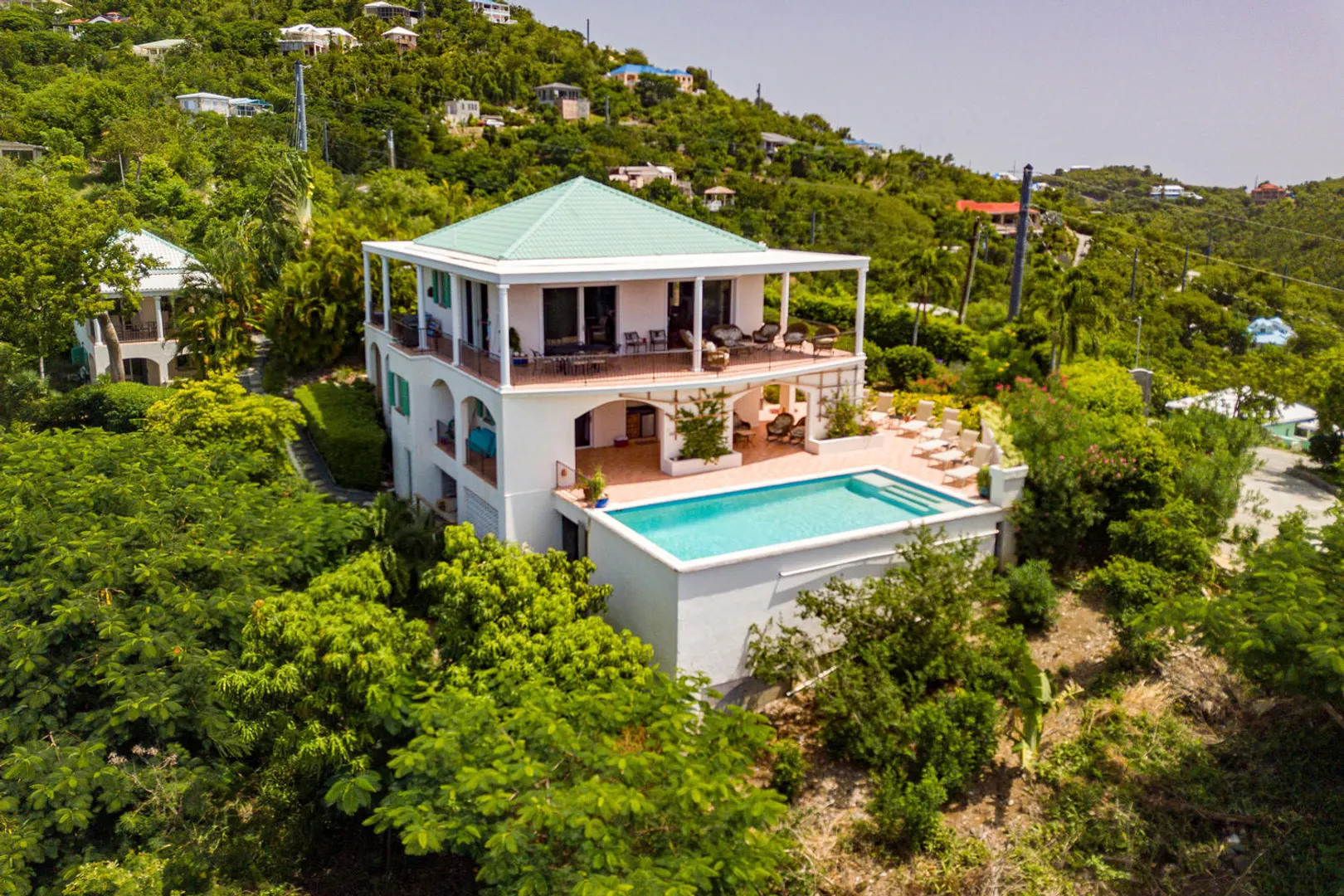 Ristaba, located in Chocolate Hole with commanding 180 degree views from Hart Bay to St. Thomas with numerous cays in between and year round magical sunsets. The main house offers 4 bedrooms suites with ensuite baths (two with outdoor garden showers); an interior staircase provides comfortable layout for families. Two bedroom cottage allows for the perfect office to work remotely or have an income producing unit. The spacious veranda is the perfect spot to host your family or guest to enjoy the colors of the caribbean as the sky changes from crystal clear blue to vibrant sunsets and finally rest at the twinkling lights over St. Thomas. Pool deck offers areas for sunbathing and those that want to lounge in the shade and the convenience of a wet bar for whipping up your favorite cocktail!Ristaba has a wonderful Caribbean flavor with hand-carved teak cabinets, vanities, plantation chairs, and grand mahogany dining table and sea-colored tile countertops. The freestanding guest house is perfectly set back from the main house with two bedrooms and is equipped to stand alone as an owners cottage with separate entrance and parking. Currently the Villa is rented as one house and the lush garden paths blend the two houses perfectly for larger groups desiring privacy. Ristaba, a 6 bedroom turn-key short term rental, is a must see for someone looking for a quality a value in the marketplace!