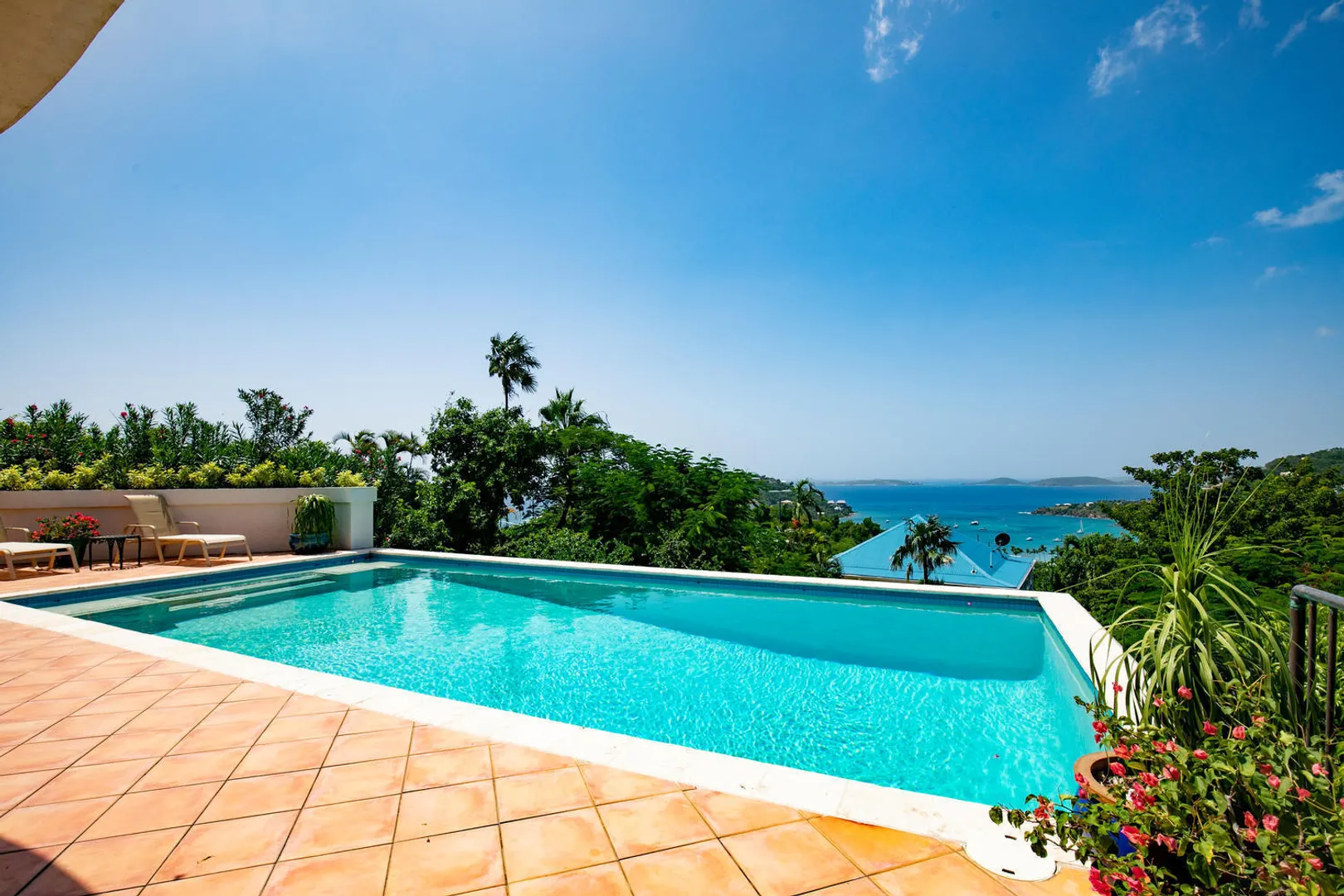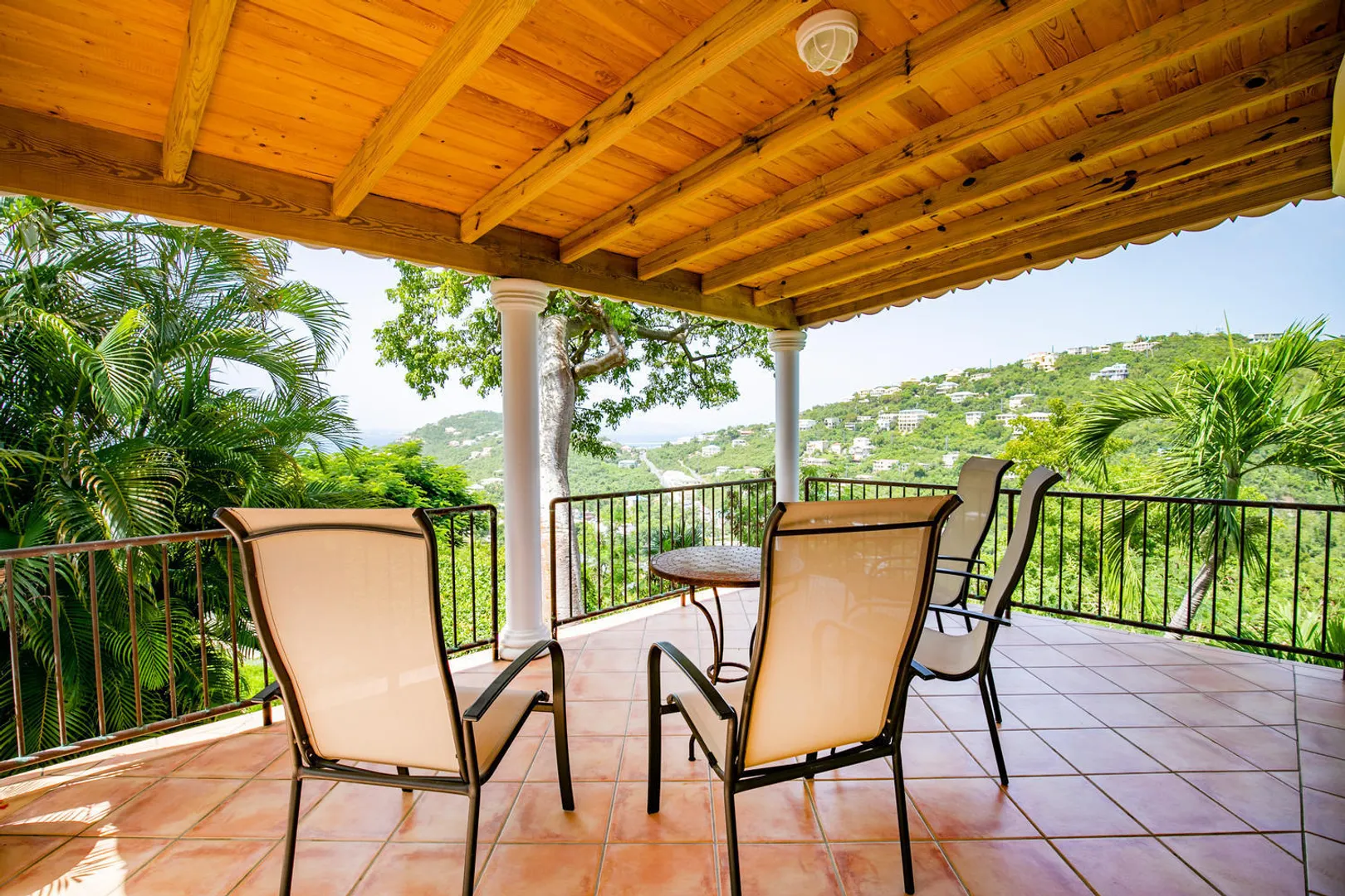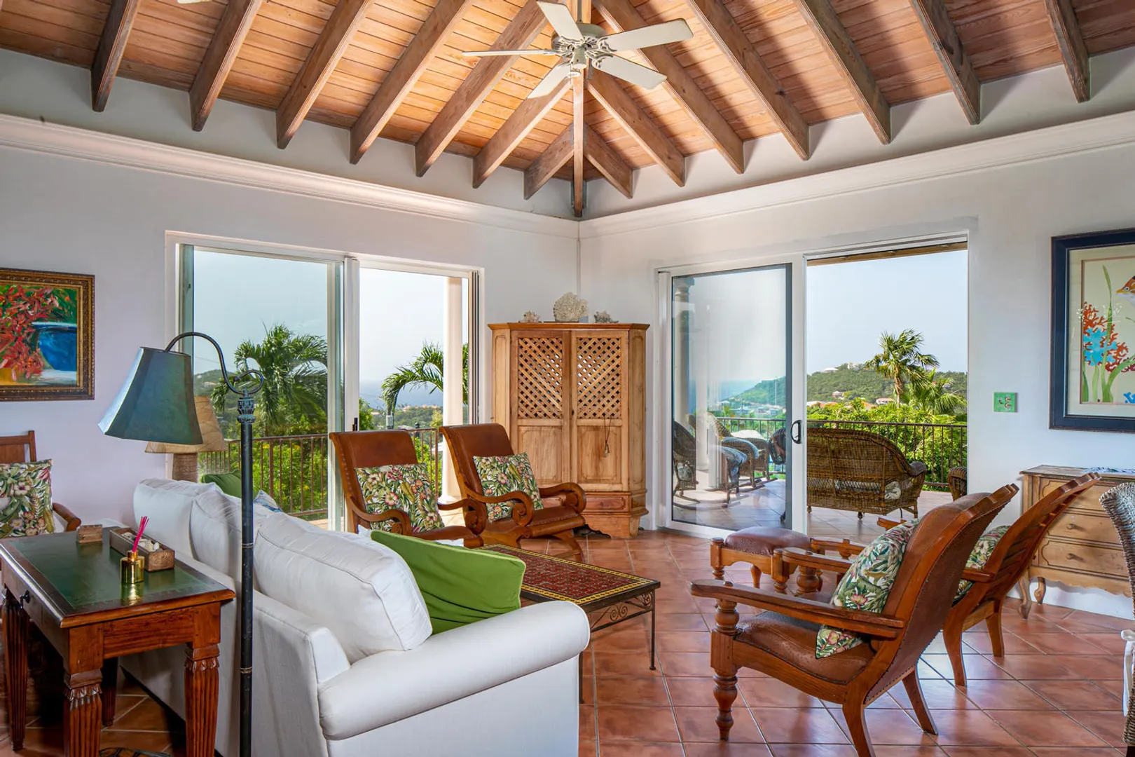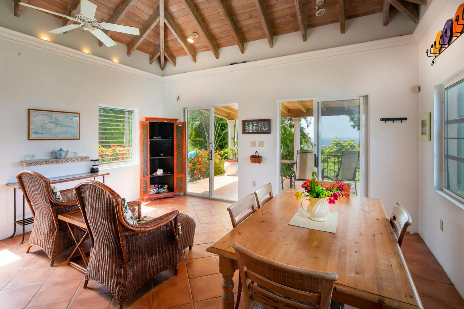 Ristaba, located in Chocolate Hole with commanding 180 degree views from Hart Bay to St. Thomas with numerous cays in between and year round magical sunsets. The main house offers 4 bedrooms suites with ensuite baths (two with outdoor garden showers); an interior staircase provides comfortable layout for families. Two bedroom cottage allows for the perfect office to work remotely or have an income producing unit. The spacious veranda is the perfect spot to host your family or guest to enjoy the colors of the caribbean as the sky changes from crystal clear blue to vibrant sunsets and finally rest at the twinkling lights over St. Thomas. Pool deck offers areas for sunbathing and those that want to lounge in the shade and the convenience of a wet bar for whipping up your favorite cocktail!Ristaba has a wonderful Caribbean flavor with hand-carved teak cabinets, vanities, plantation chairs, and grand mahogany dining table and sea-colored tile countertops. The freestanding guest house is perfectly set back from the main house with two bedrooms and is equipped to stand alone as an owners cottage with separate entrance and parking. Currently the Villa is rented as one house and the lush garden paths blend the two houses perfectly for larger groups desiring privacy. Ristaba, a 6 bedroom turn-key short term rental, is a must see for someone looking for a quality a value in the marketplace!