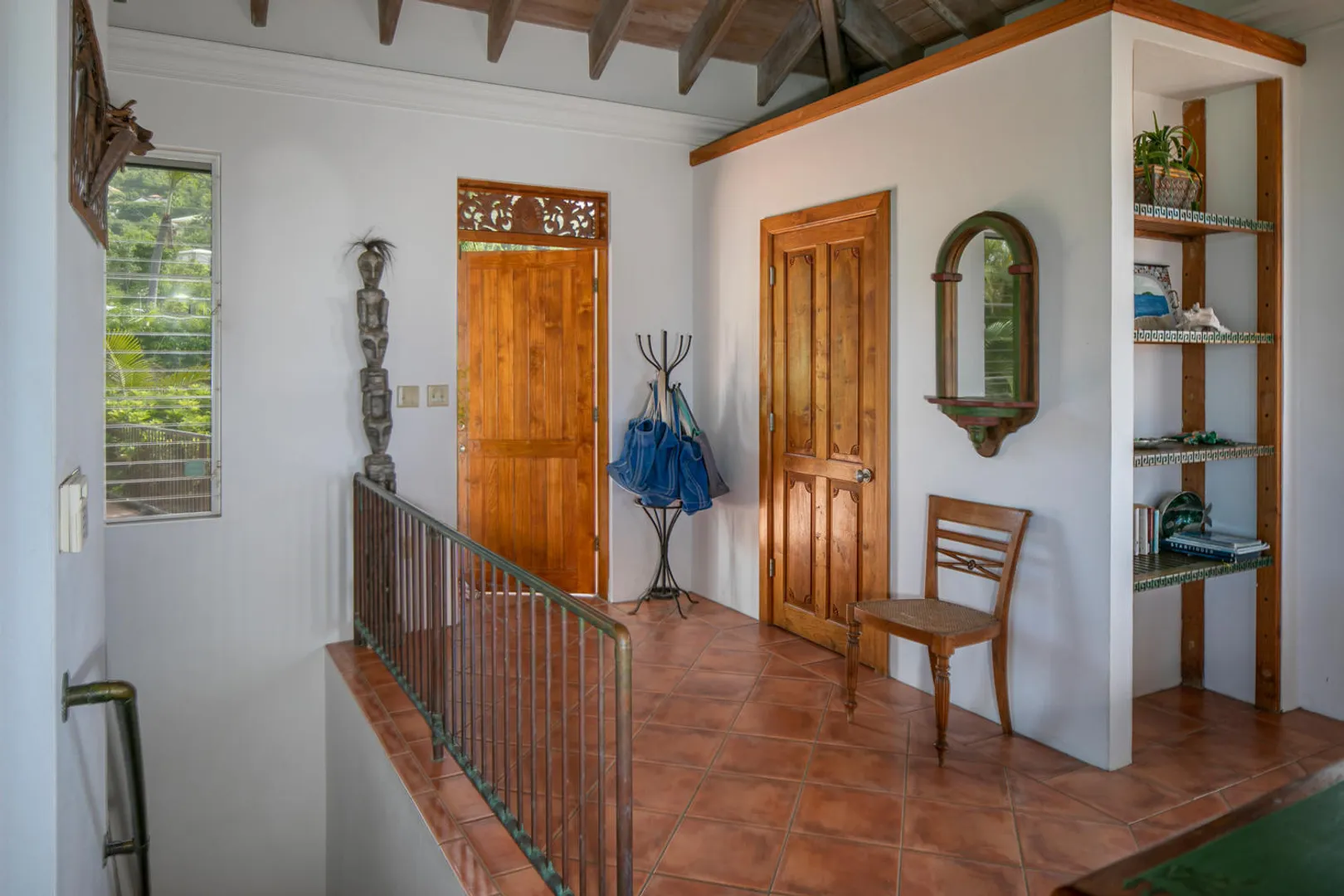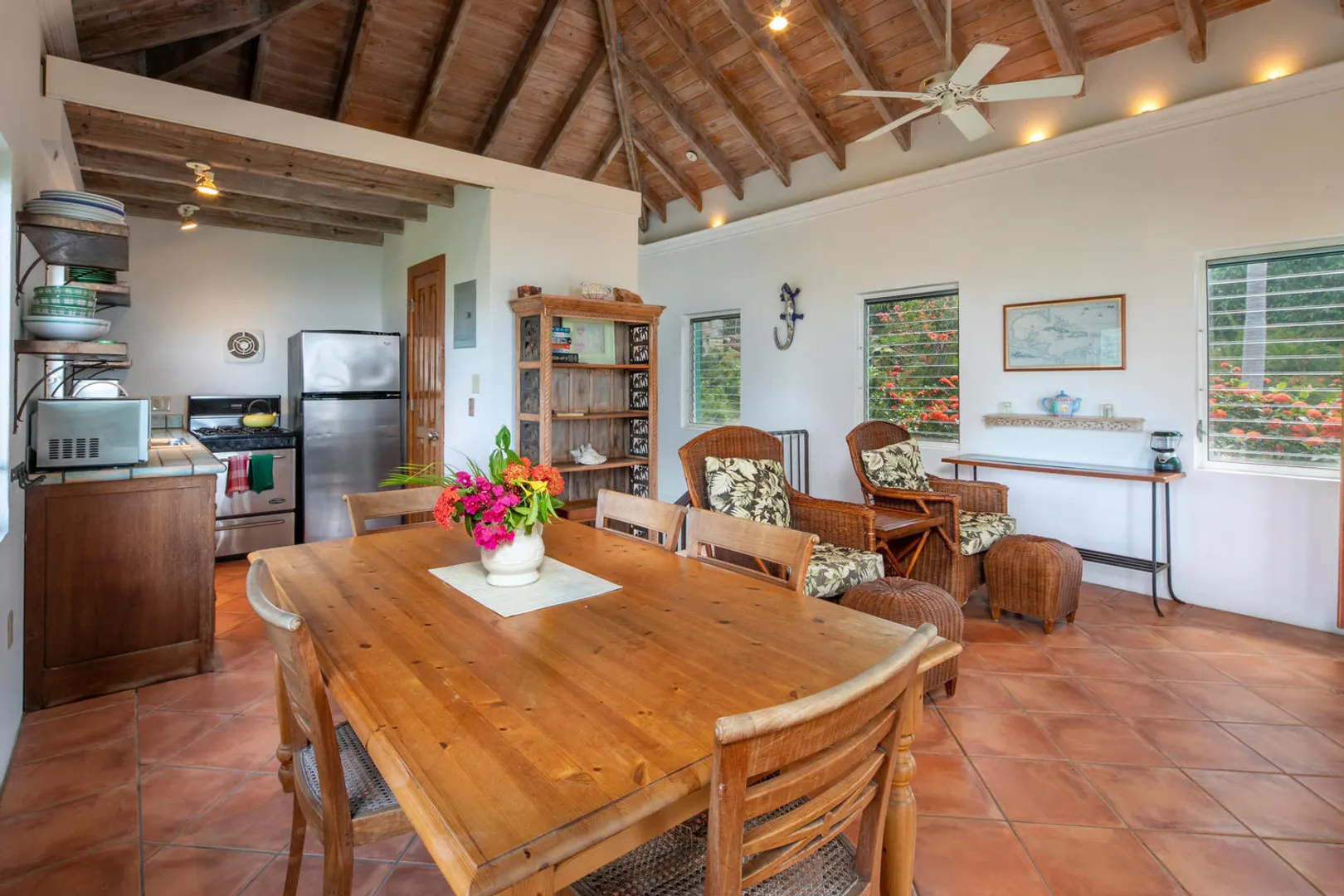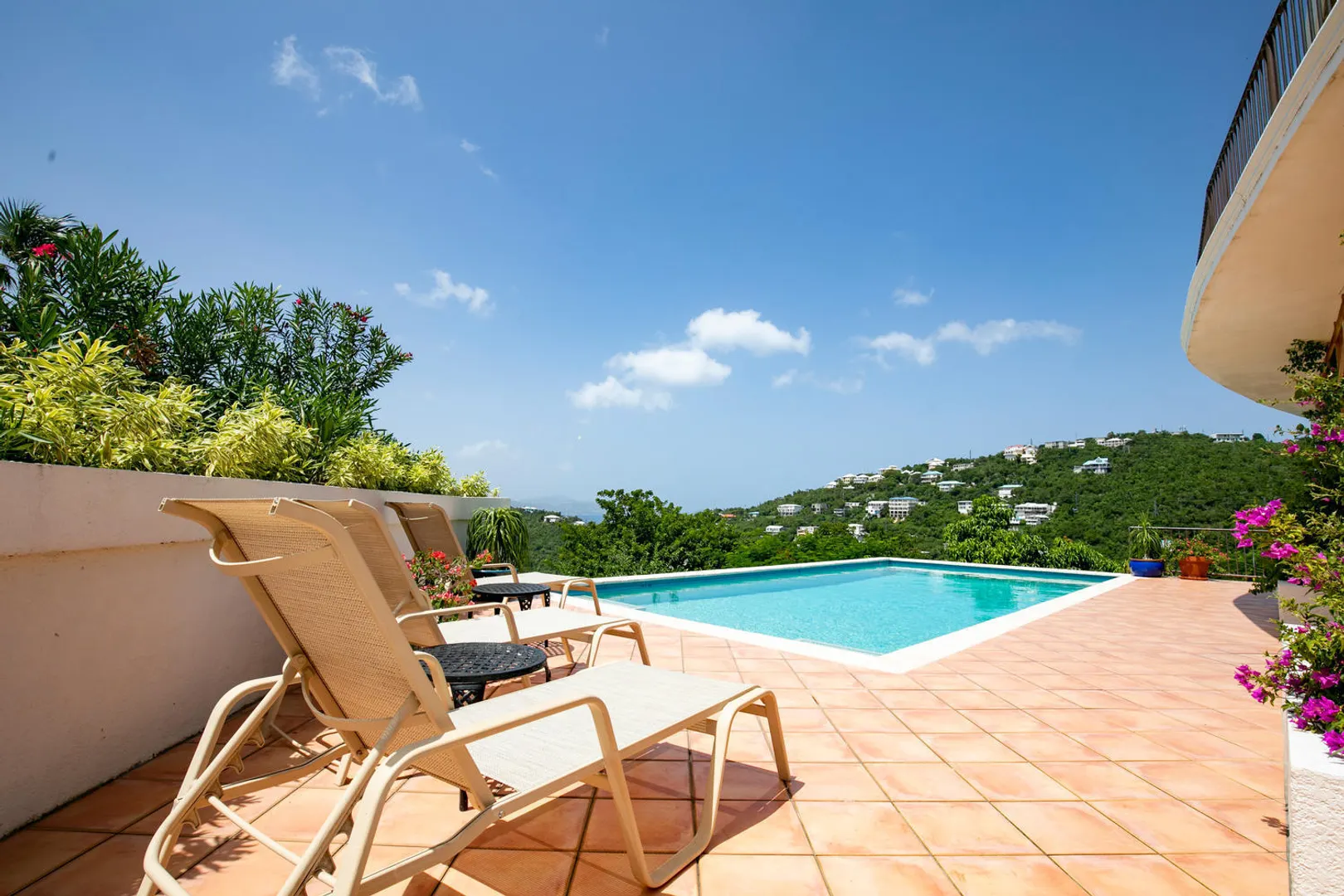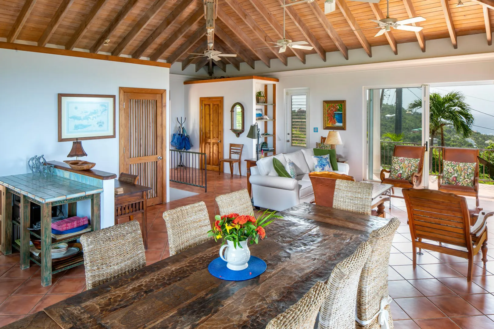Ristaba, located in Chocolate Hole with commanding 180 degree views from Hart Bay to St. Thomas with numerous cays in between and year round magical sunsets. The main house offers 4 bedrooms suites with ensuite baths (two with outdoor garden showers); an interior staircase provides comfortable layout for families. Two bedroom cottage allows for the perfect office to work remotely or have an income producing unit. The spacious veranda is the perfect spot to host your family or guest to enjoy the colors of the caribbean as the sky changes from crystal clear blue to vibrant sunsets and finally rest at the twinkling lights over St. Thomas. Pool deck offers areas for sunbathing and those that want to lounge in the shade and the convenience of a wet bar for whipping up your favorite cocktail!Ristaba has a wonderful Caribbean flavor with hand-carved teak cabinets, vanities, plantation chairs, and grand mahogany dining table and sea-colored tile countertops. The freestanding guest house is perfectly set back from the main house with two bedrooms and is equipped to stand alone as an owners cottage with separate entrance and parking. Currently the Villa is rented as one house and the lush garden paths blend the two houses perfectly for larger groups desiring privacy. Ristaba, a 6 bedroom turn-key short term rental, is a must see for someone looking for a quality a value in the marketplace!