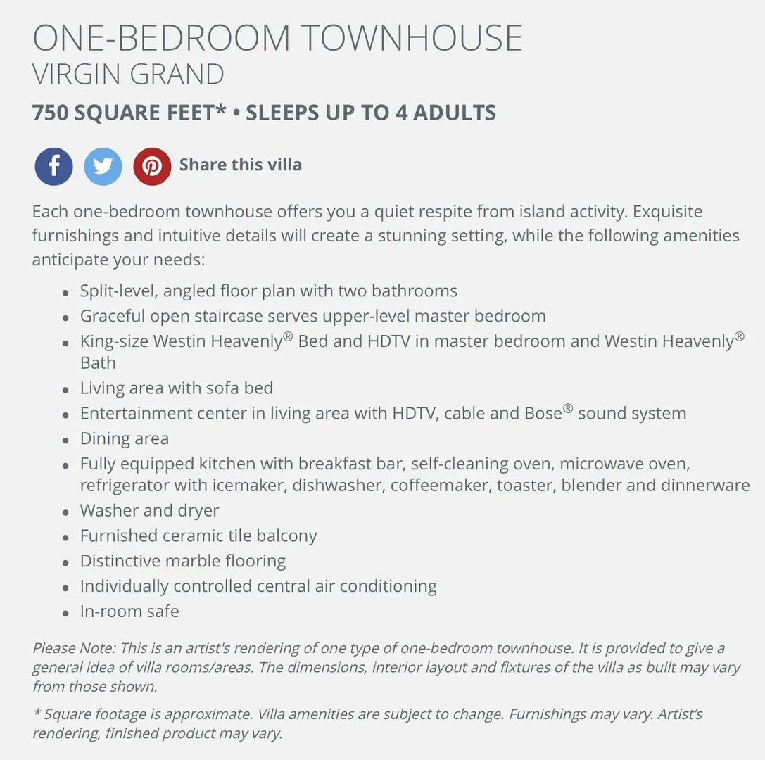 Enjoy President's Week 7 in a beautiful 2 bedroom/3 bathroom at the Westin St. John. Lovely 2-story townhouse next to the pool. Full kitchen, washer/dryer, heavenly beds, tastefully furnished and decorated. Also includes access to all Westin amenities such as 1/4 acre swimming pool, gym, beach toys, etc. Also grandfathered in 176,700 ownership ''Option'' points for trading within the Westin/Sheraton ownership properties such as Maui, Vail & Cabo San Lucas.