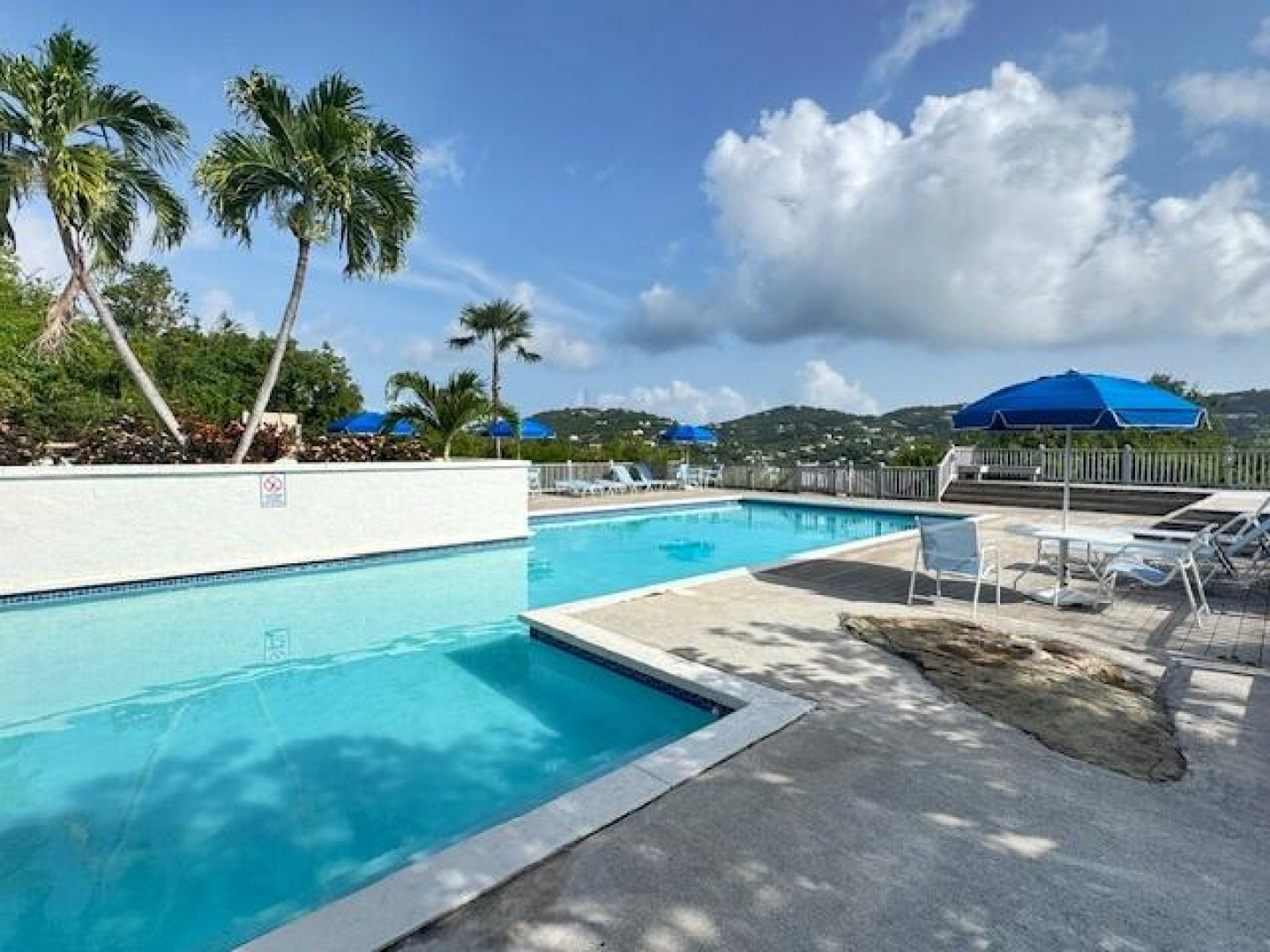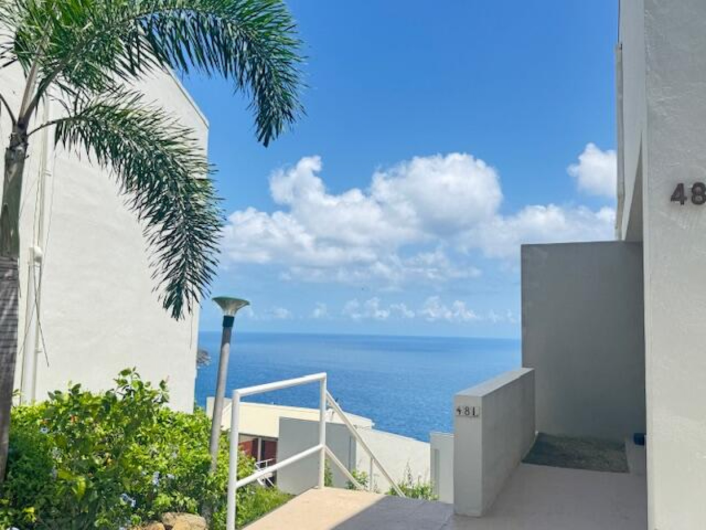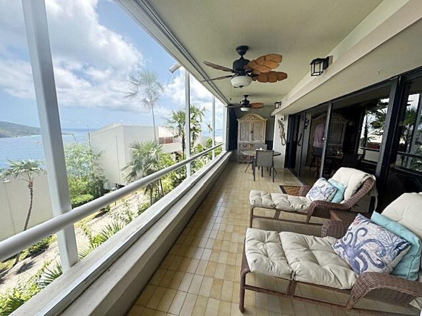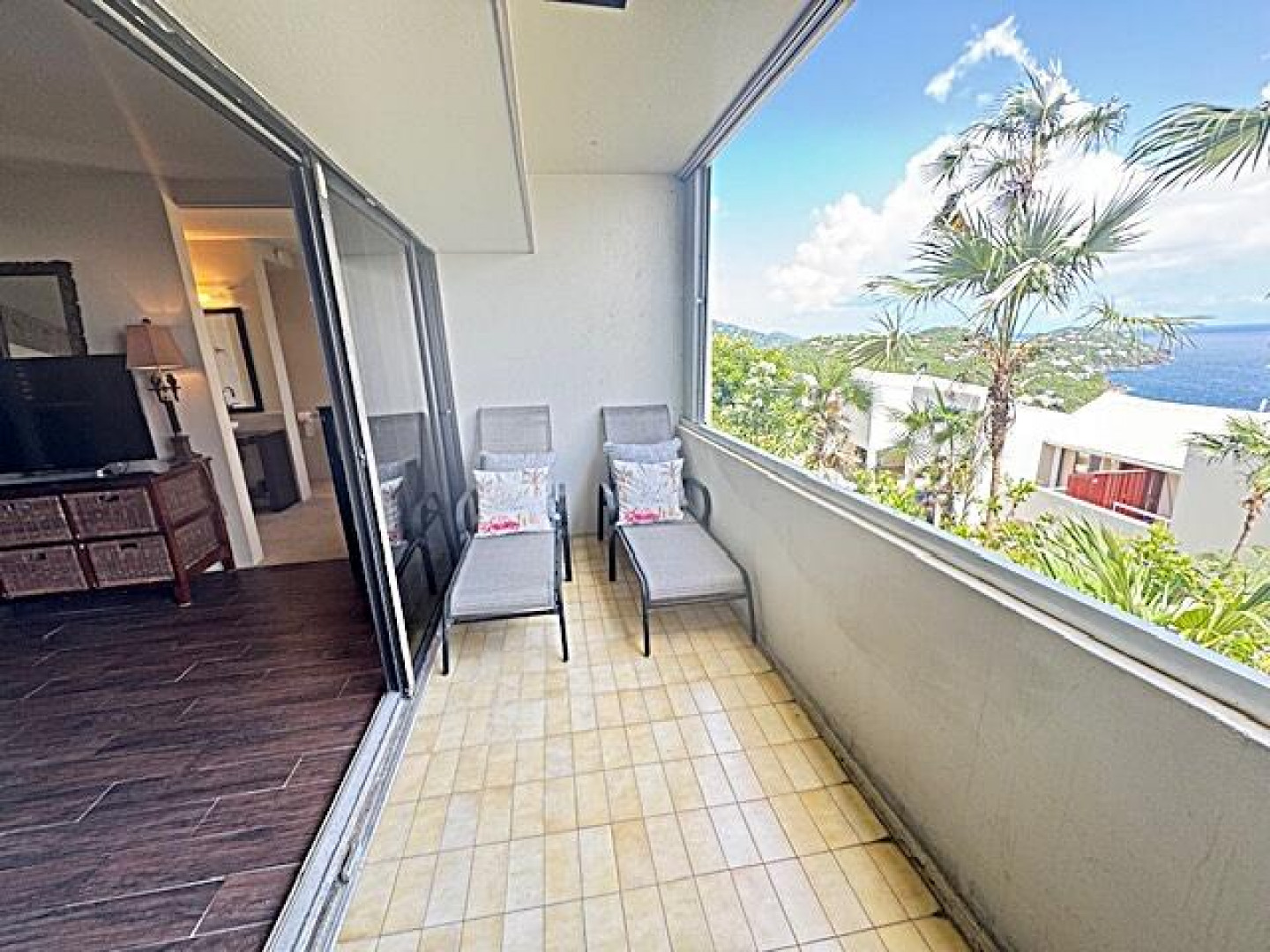 Located in Mahogany Run, one of the island's premier gated residential communities, this spacious one-bedroom condo offers panoramic ocean views and beautiful sunsets. The main patio is 32 feet in length and the bedroom has its own patio. It comes fully furnished and a kitchen with granite counter tops equipped with all appliances. The bedroom has a generous amount of closet and storage space and the beautifully remodeled bathroom is filled with light from large windows that enjoy the same ocean views. It comes with a Delta Pro Ultra Eco-Flow backup generator. Mahogany Run has a large pool and services include the security gate, trash pickup and exterminating. It's conveniently located for the east end or town and a five minute drive to St. Thomas's iconic Magens Bay Beach.The Sellers have been told by M Run COA they are on the list for new windows and sliding glass doors in 2026. The Sellers have no control over when this will be done.