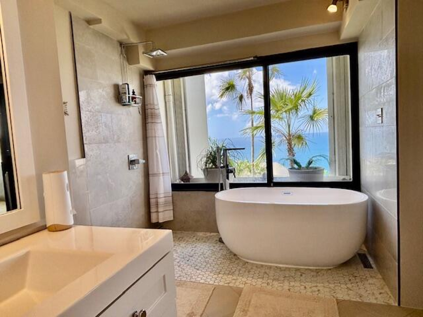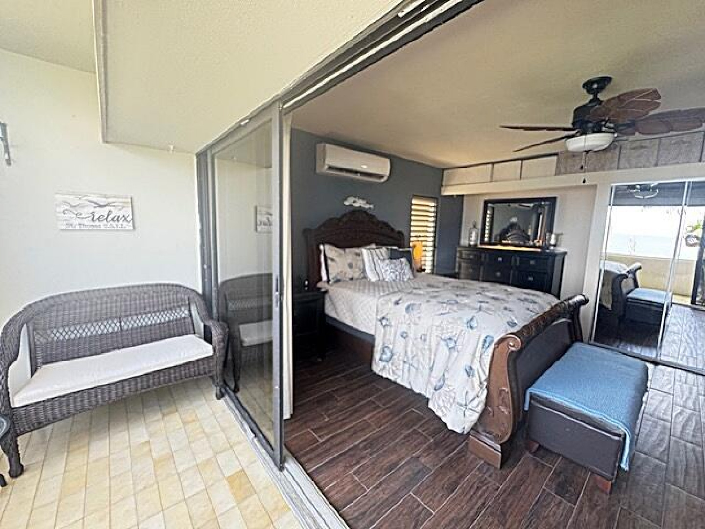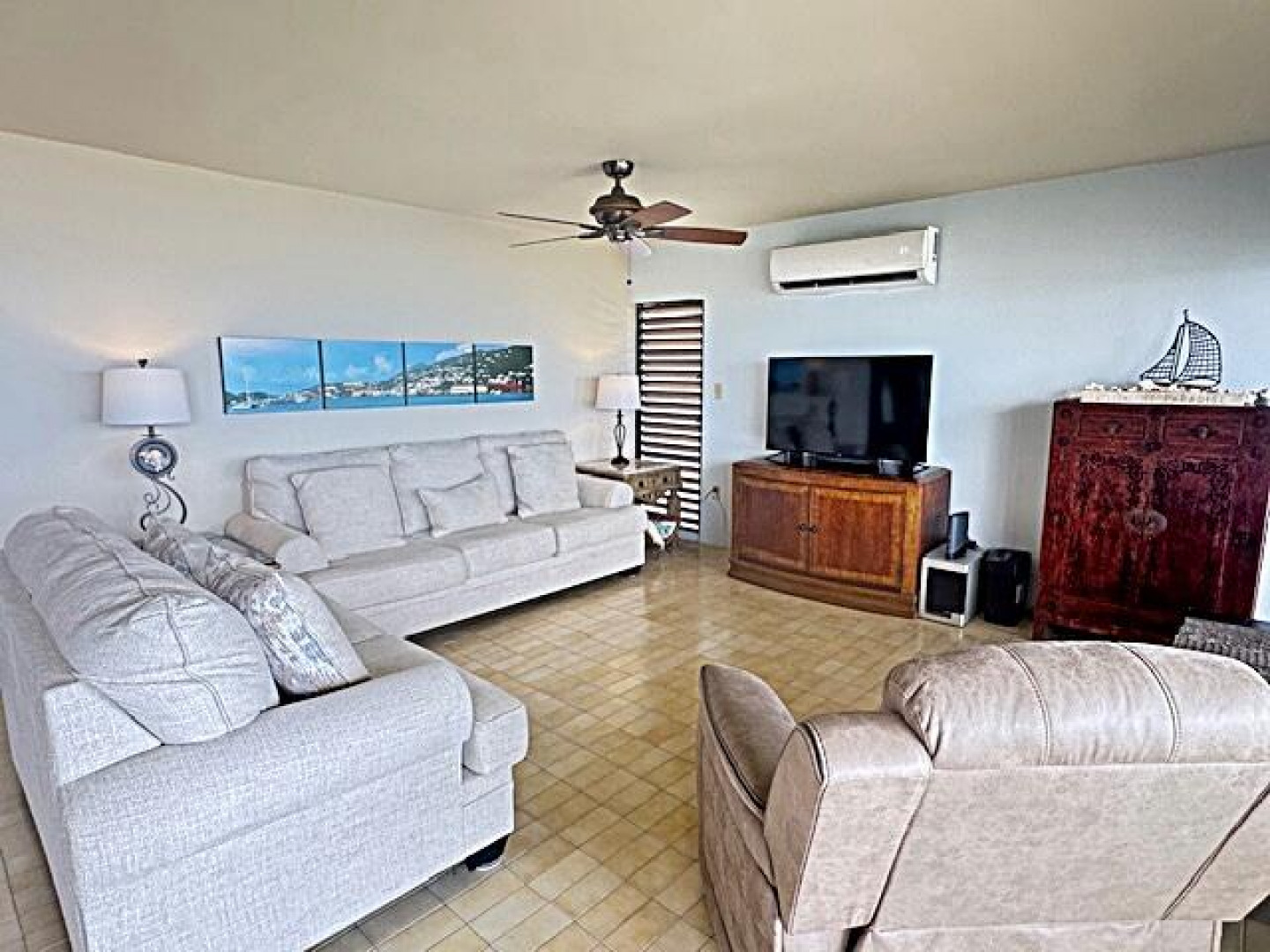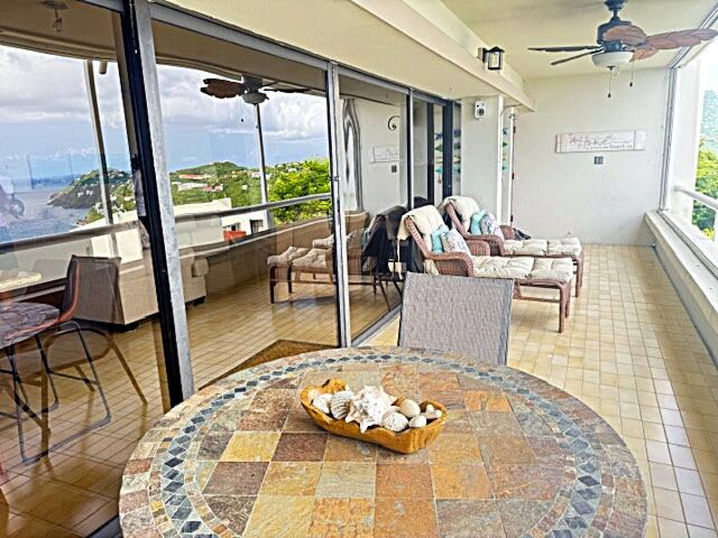 Located in Mahogany Run, one of the island's premier gated residential communities, this spacious one-bedroom condo offers panoramic ocean views and beautiful sunsets. The main patio is 32 feet in length and the bedroom has its own patio. It comes fully furnished and a kitchen with granite counter tops equipped with all appliances. The bedroom has a generous amount of closet and storage space and the beautifully remodeled bathroom is filled with light from large windows that enjoy the same ocean views. It comes with a Delta Pro Ultra Eco-Flow backup generator. Mahogany Run has a large pool and services include the security gate, trash pickup and exterminating. It's conveniently located for the east end or town and a five minute drive to St. Thomas's iconic Magens Bay Beach.The Sellers have been told by M Run COA they are on the list for new windows and sliding glass doors in 2026. The Sellers have no control over when this will be done.