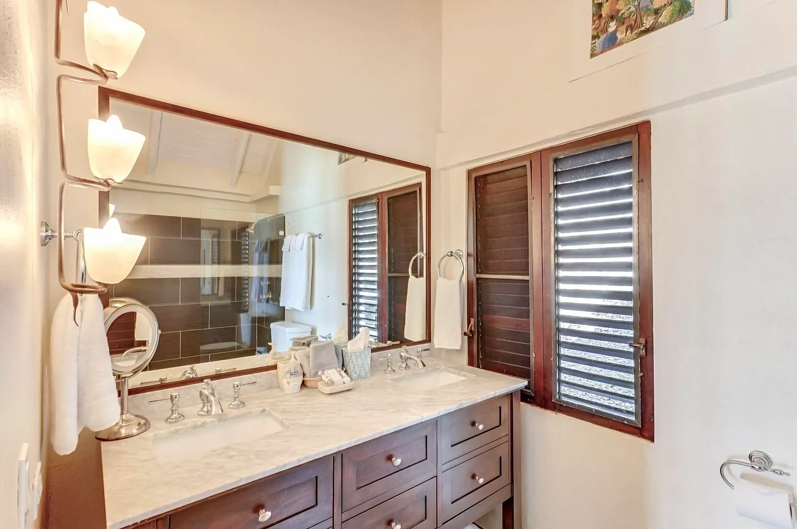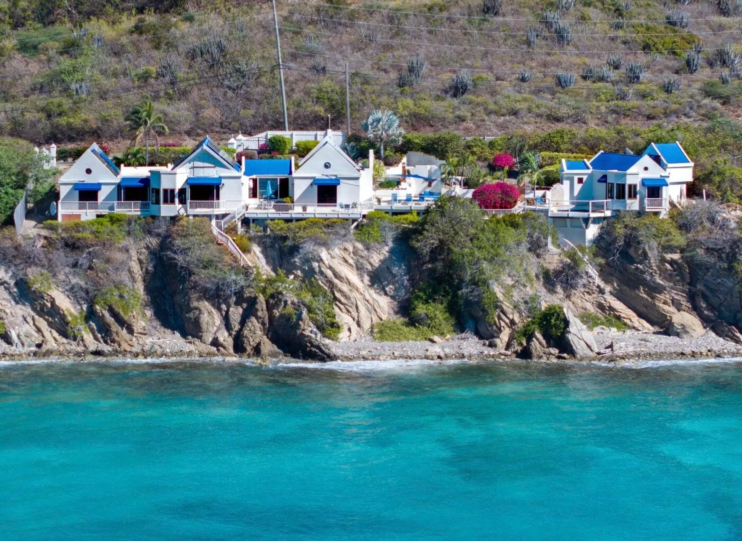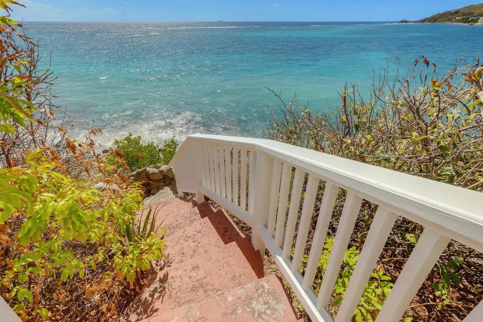 Welcome to Rainbow Cove! Enjoy spectacular Caribbean Sea views from this gorgeous WATERFRONT villa. This unique 2 bed 2 bath main house & 1 bed 1 bath cottage, each adorned with their own pool, is nestled on 0.65 acres overlooking beautiful Turner Hole. An exceptional property that boasts a harmonious blend of contemporary design and environmentally conscious amenities, including 52 solar panels with Net Metering, UV water filtration system, new 20KW diesel generator w/ 100 gallon tank & automatic transfer switch. The property has recently updated bathrooms, modern kitchen w/ granite countertops, stainless steel Viking & Sub-Zero appliances, custom cabinetry, newly installed french doors & hurricane impact glass. Take a walk down to the water from one of the two built-in staircasesGreet your guests in an elegant artistically designed foyer showcasing the crystal blue waters of the Caribbean Sea. With a warm European feel and refined modern finishes, you can easily sense the comfort of the home. An open living and dining room, with a built-in bar, high vaulted ceilings, which are filled with foam insulation for an added layer of heat protection, creates a grand space for entertainment and relaxation. The expansive Imbuya Brazilian walnut French doors, with impact glass, allows abundant natural light to flood the interior, providing a seamless indoor and outdoor living space.