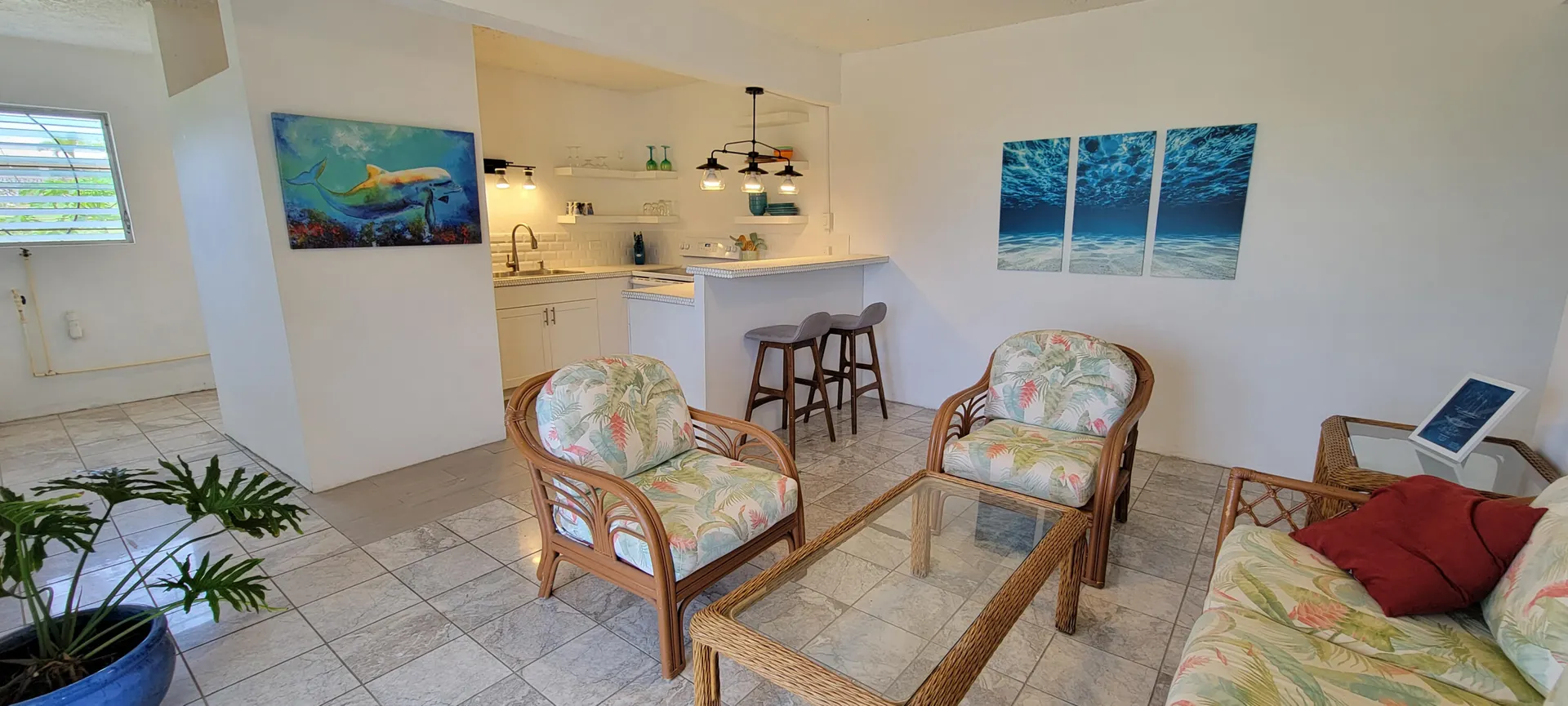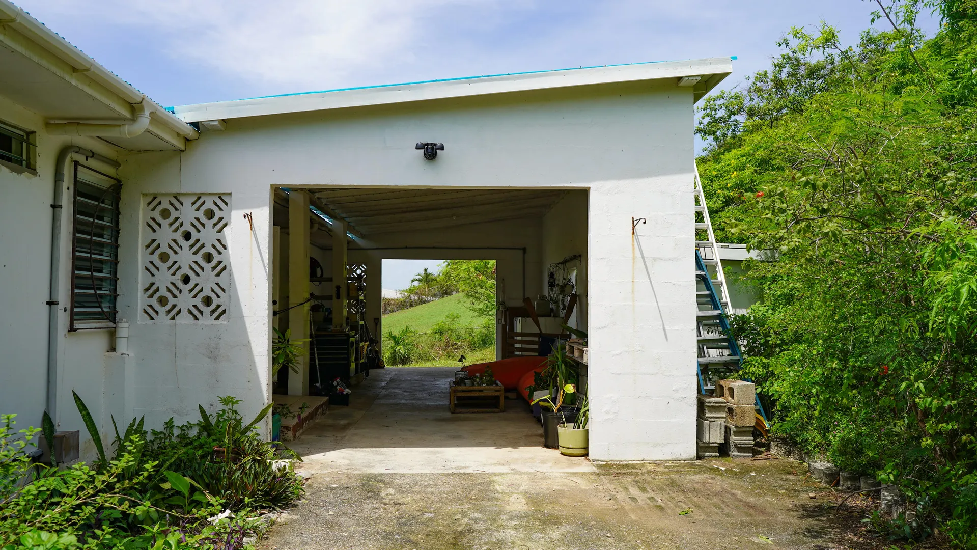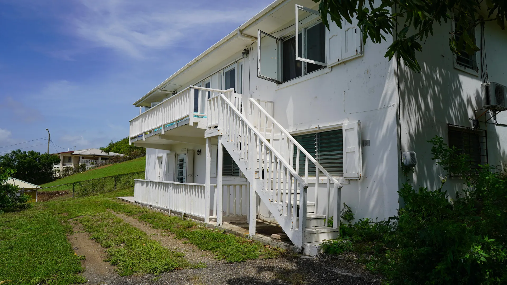 Stunning South Shore and Salt Pond views from this spacious and airy 3 bedroom, 2 bath home with 2 bedroom, 1 bath apartment - fully furnished. Turnkey for vacation or long term rentals -amazing as an investment or to live in. Picture windows flanking the entire southern exposure bring in the blues of the ocean into the house. Deck off first floor and patio off second floor. Open floor plan kitchen with stainless appliances and granite countertops. Primary bedroom has walk-in closet and ensuite bathroom. Renovations conducted by current owner including new windows, new interior doors, cisterns (2) recoated, and painted roof. Bamboo outdoor shower, UV water filtration system. Carport currently purposed as lounging space. Thoughtfully decorated with Caribbean vibe.