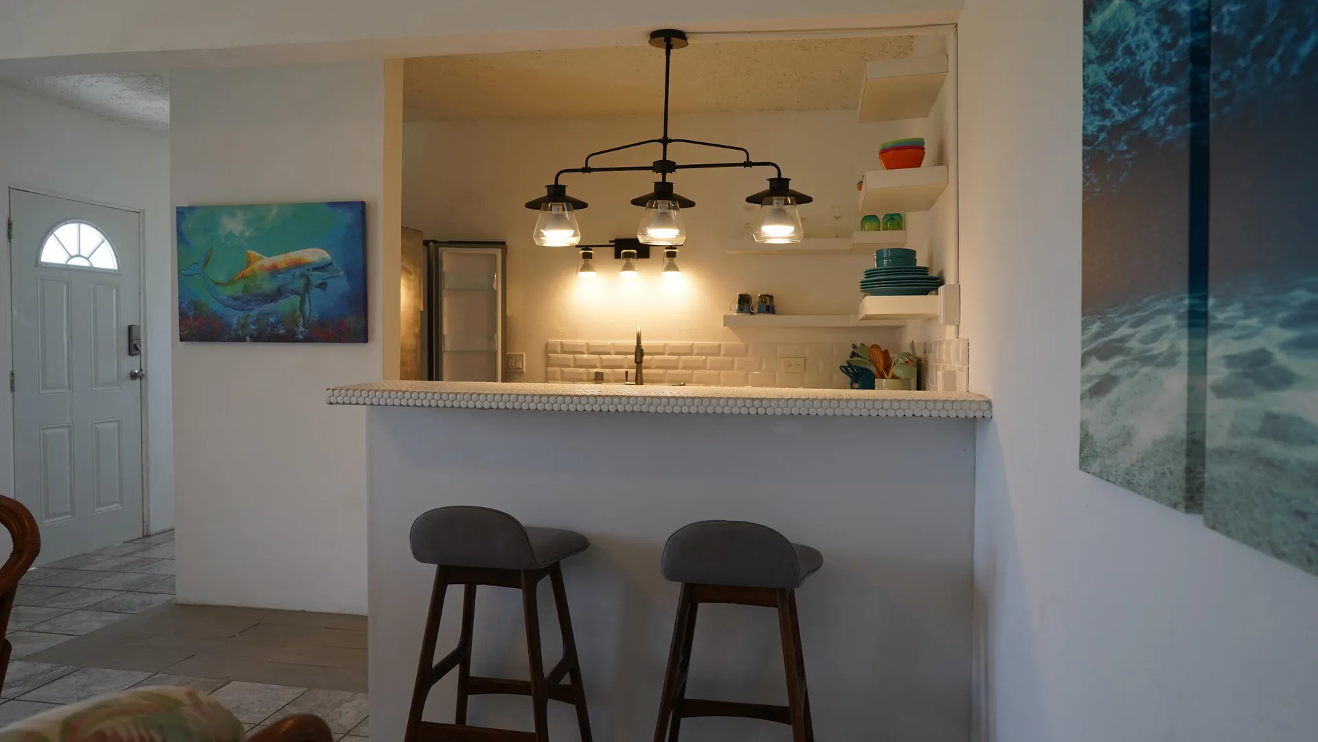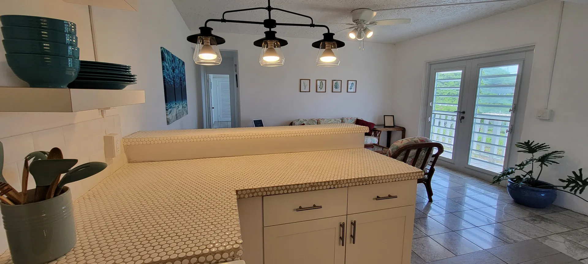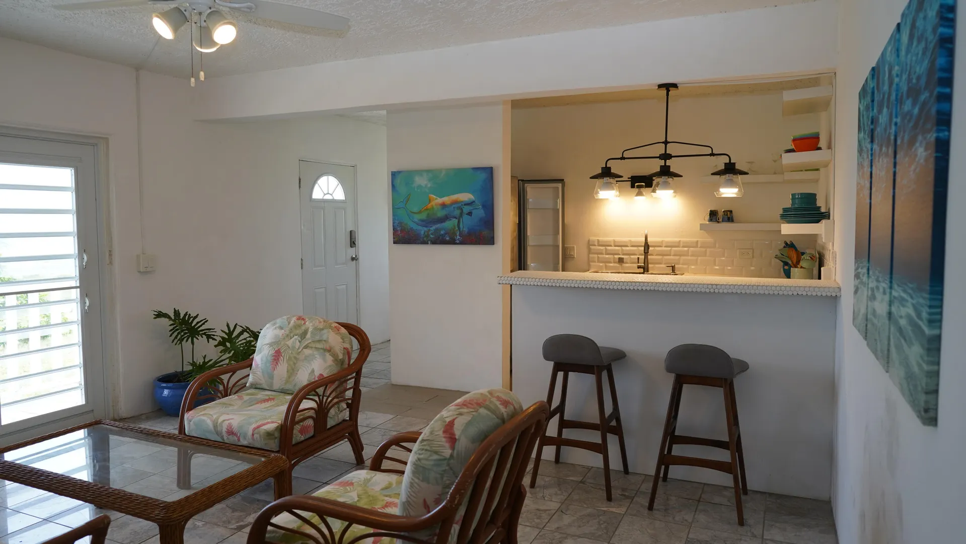 Stunning South Shore and Salt Pond views from this spacious and airy 3 bedroom, 2 bath home with 2 bedroom, 1 bath apartment - fully furnished. Turnkey for vacation or long term rentals -amazing as an investment or to live in. Picture windows flanking the entire southern exposure bring in the blues of the ocean into the house. Deck off first floor and patio off second floor. Open floor plan kitchen with stainless appliances and granite countertops. Primary bedroom has walk-in closet and ensuite bathroom. Renovations conducted by current owner including new windows, new interior doors, cisterns (2) recoated, and painted roof. Bamboo outdoor shower, UV water filtration system. Carport currently purposed as lounging space. Thoughtfully decorated with Caribbean vibe.