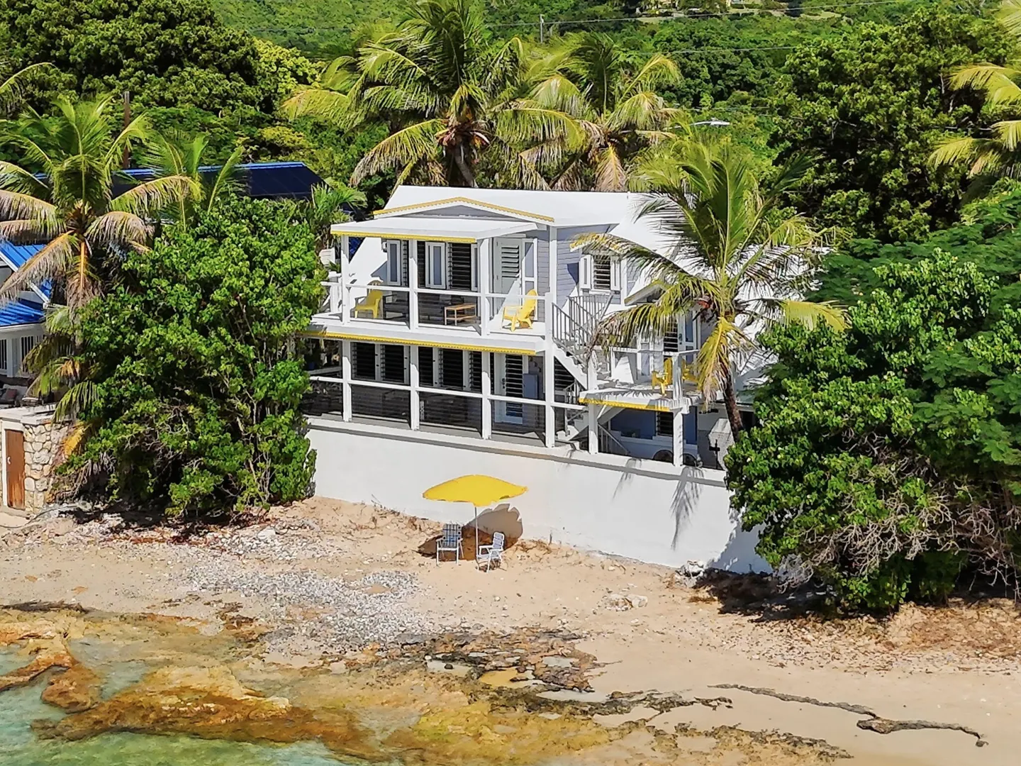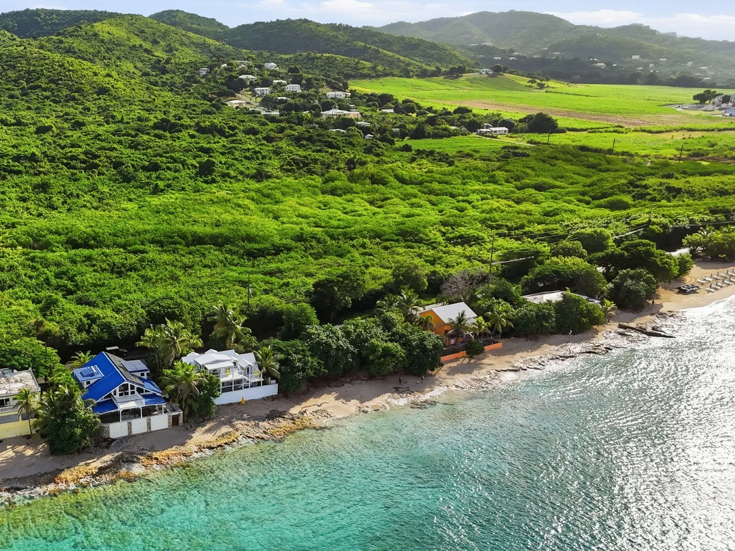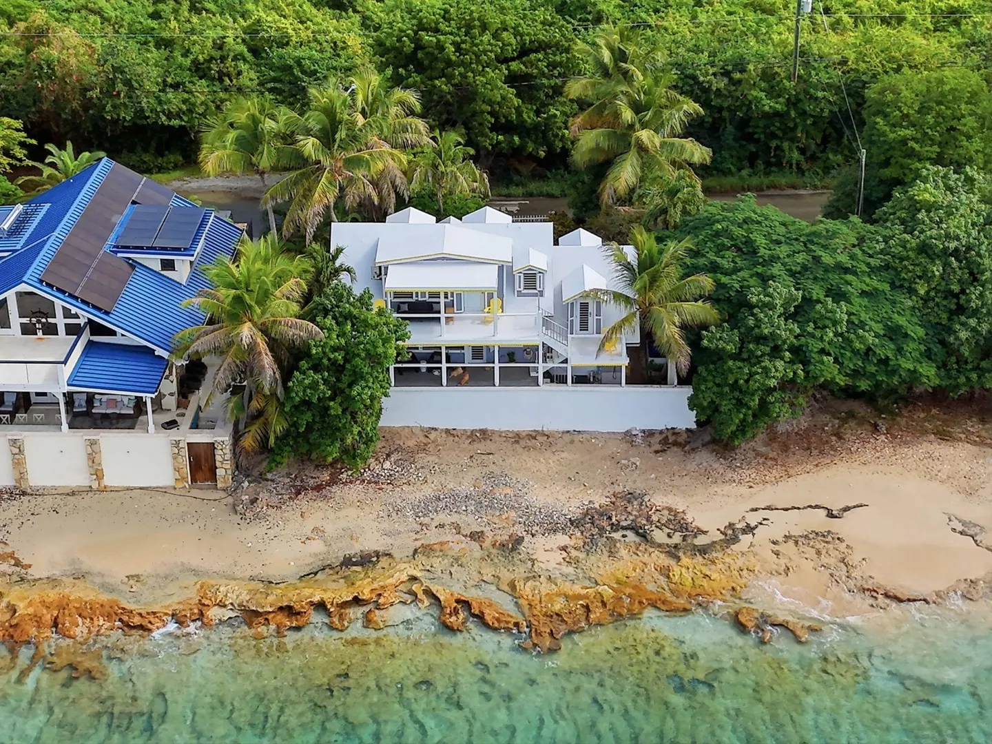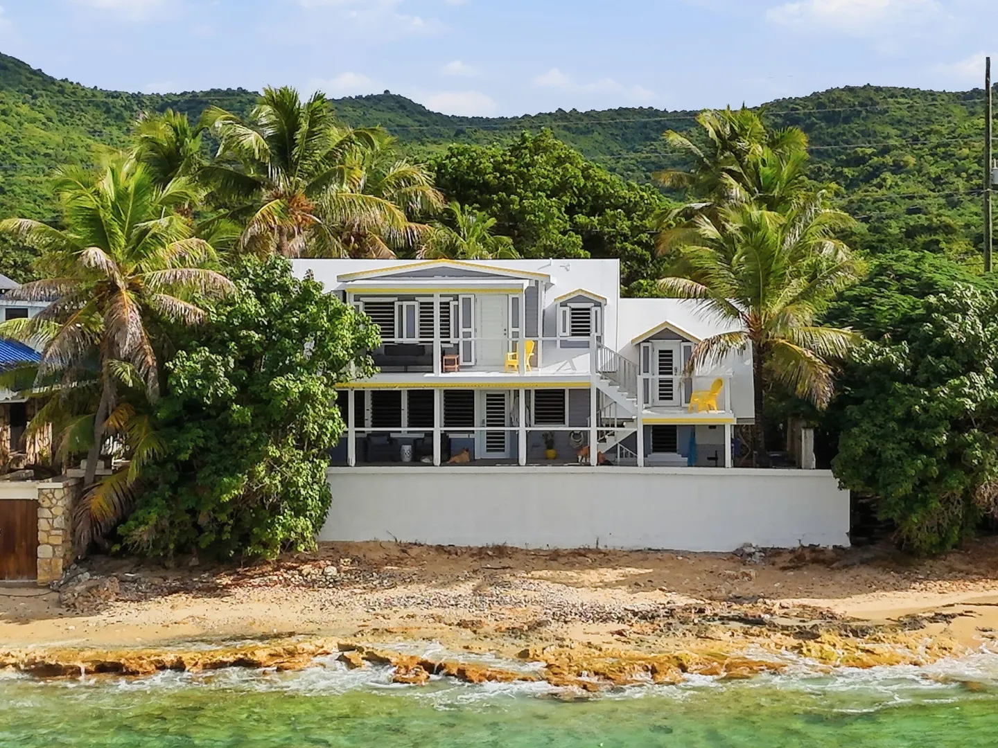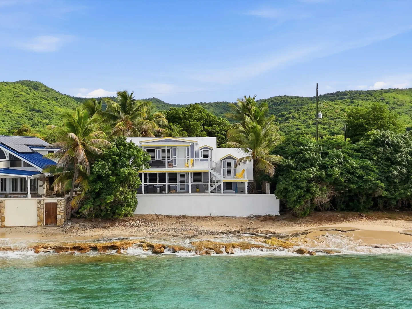 Rare opportunity to own this Caribbean inspired Beach Front home! Sitting only steps from one of the most beautiful beaches in St.Croix with the crystal clear Caribbean waters waiting for you. The house has been updated inside in and out with everything from electrical to plumbing, to furnishings . Designer flooring from Karastan LVP , George Nelson's Bubble Lamps , high end GE appliances adds more charm to this home The house features a king bed & full bath downstairs and a large ,beautifully finished loft style primary suite with a sitting area, full bath, private deck and amazing views of the sea & stunning sunsets upstairs. There's a separate entrance for the loft style apt. A basement, fenced courtyard ,& ample parking rounds out the property. Your dream home is right here.Your front row seat to the magical Caribbean is waiting just for you. Your day begins with a quick swim, maybe the dolphins will join you. Followed by a lazy kayak trip down to the pier for a cup of coffee and a sweet tart. Later in the week you might decide to take your tanks and go for a dive, walk right into the cool waters from your beachfront home! This home feature a large king size guest room downstairs with full bath, upstairs ensuite loft with sitting area, full bath, and a gorgeous deck to view the setting sun. The loft style apartment has a queen bed, with ensuite bath, a full living room and kitchen downstairs with a half bath. There are three cisterns, triple filter system, and elastomeric roof that has survived numerous hurricanes . Fully walled and very private, the front gate slides open for extra parking. The lot next door belongs to the VI Government for beach access, insuring lots of extra parking for your get togethers. Next door to the north is owned by state siders who do high end short term rentals occasionally . This is a turnkey property just waiting for you.