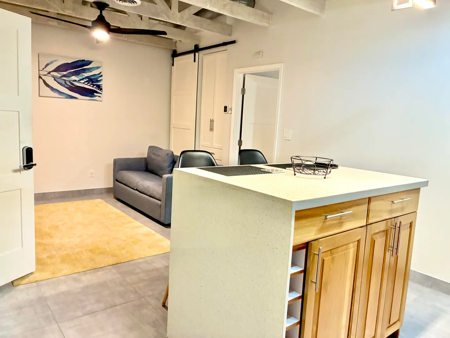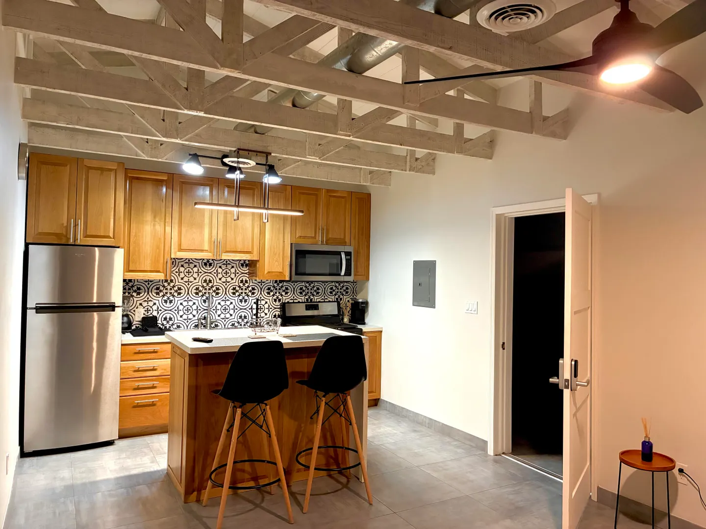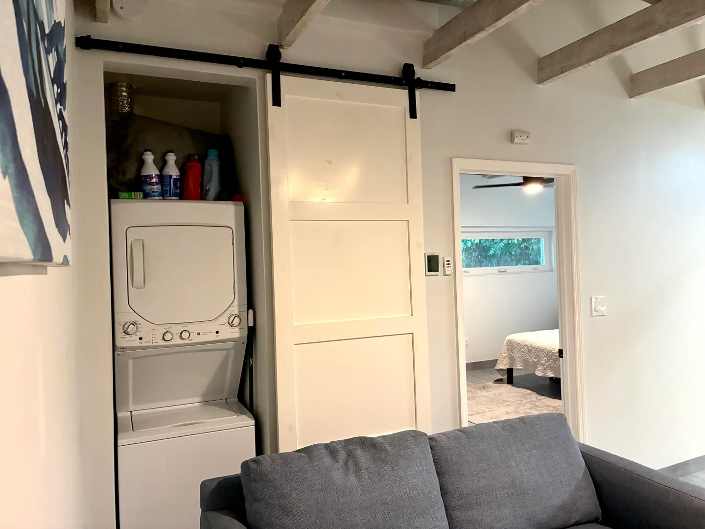 Luxury 1 Bedroom/1 Bath penthouse apartment replete with central A/C, like-new appliances, smart TV, WiFi, Trash Pick Up, monthly pest control, full furnishings, washer/dryer. Small pets considered with fee, subject to Landlord approval. $50/MO flat rate water fee. 1 Private parking space provided to Tenant on private property. Cozy, quaint, upscale unit in the heart of Christiansted Town feels private yet is just minutes to the beach, great cuisine, restaurants, banks, convenience stores, and more. 50 Cafe coffee shop, smoothie bar & work space, The Social Beer Garden, craft cocktails & great food located just downstairs.