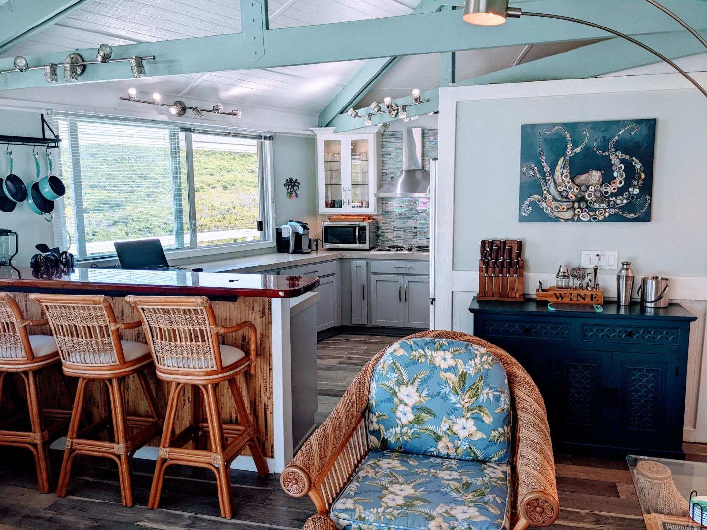 This beautifully furnished, meticulously kept, 2 bedroom/2 bathroom home on the East End of St Croix has a spacious porch to enjoy the Caribbean Sea views. The newly renovated kitchen is fully equipped with everything you could need including a window to easily pass a drink out to the outdoor bar. This rental includes a window AC in each bedroom, washer and dryer, and a sound system with indoor and outdoor speakers. WAPA with a cap of $300/month, internet, landscaping and pest control is included in rent.