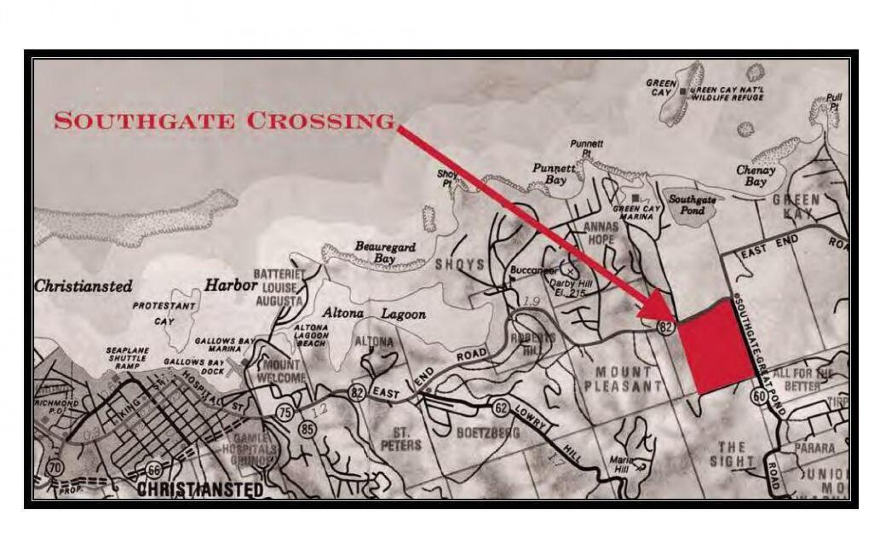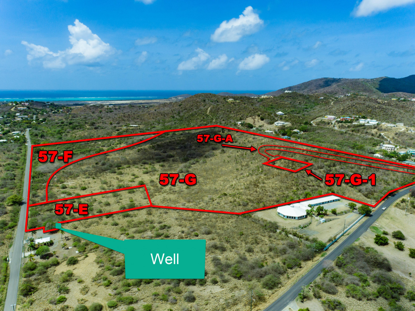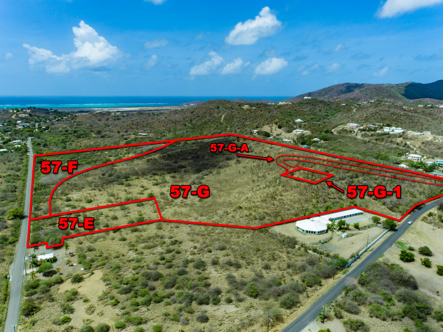 Buck Island and Christiansted town views from the knoll top of 5 parcels totaling 58 acres at the crossroads of the Christiansted and the East End in Southgate prime for a residential development. Listed at its assessed value! This R-1 zoned land has an approved Group Dwelling Permit issued by the Department of Planning and Natural Resources available upon request for qualified Buyers. This permit allows for the construction of 224 single family and townhouses (dwelling units) and recreational areas on Parcel 57-G, the 46-acre parcel. The topography varies from flat to moderate to a slight slope and hilltop with many of proposed lots having good view of the sea. Parcel 57-F is 9.6 acres and will be reserved for storm water and irrigation. There are two wells.