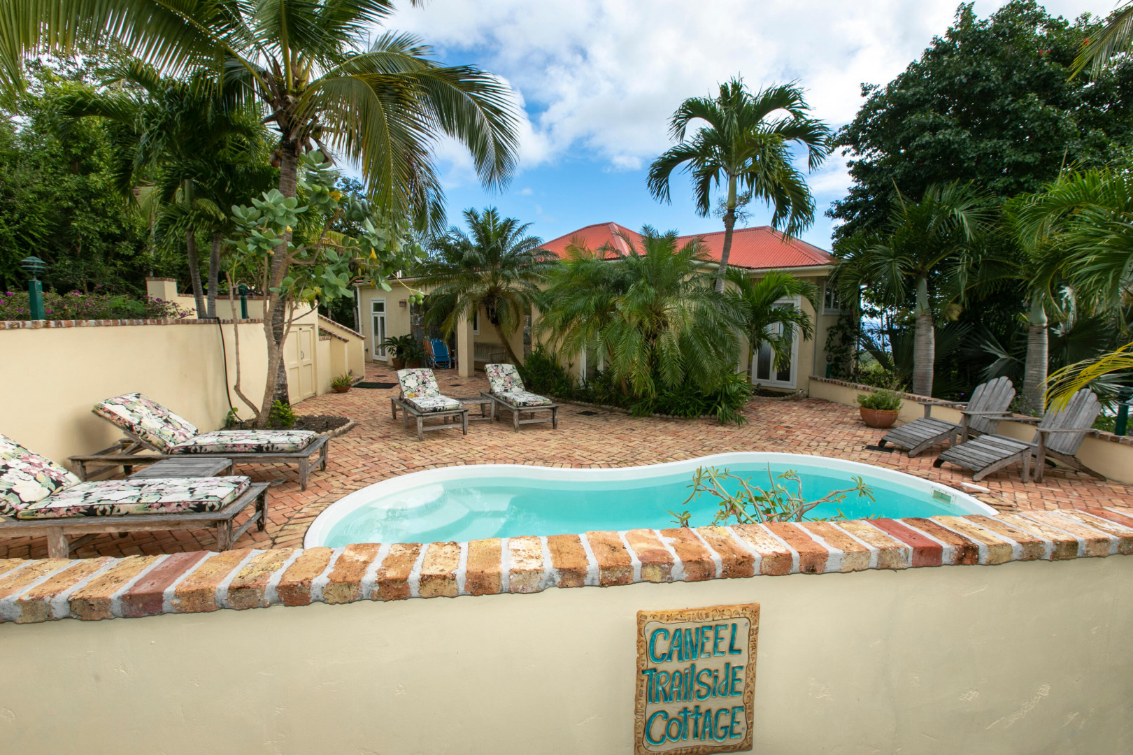 Welcome to Caneel Trailside Cottage - a fully-furnished, turnkey gem box of a villa perched above Cruz Bay providing direct access to the vast Virgin Islands National Park trail system. This two-bedroom, two-bathroom masonry home is a haven for outdoor enthusiasts providing convenient proximity to dining, shopping and postcard perfect white sand beaches all within a short drive. Well established as one of St John's most beloved vacation rentals, the villa is equally suitable as a private island retreat.Interior and exterior design programming puts an emphasis on privacy and efficiency with breezy single-level living. The charming pool deck offers a seamless transition into central living spaces flanked by well-appointed guest suites and miles of southern ocean views from a large outdoor veranda.