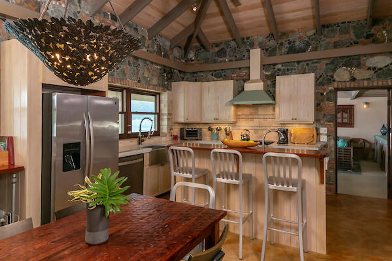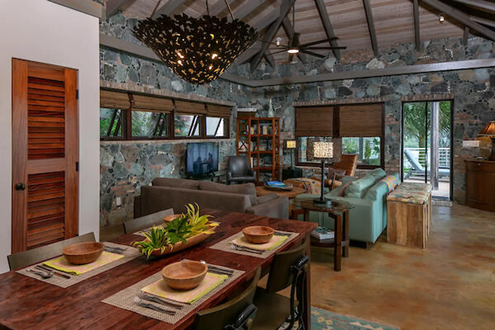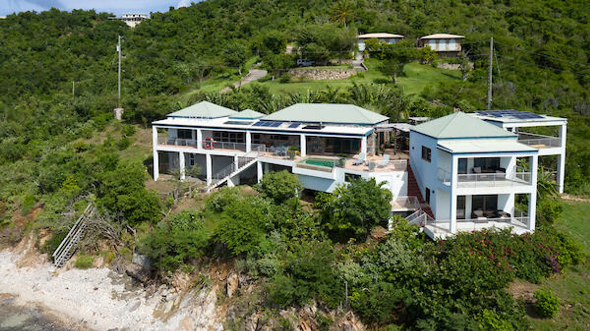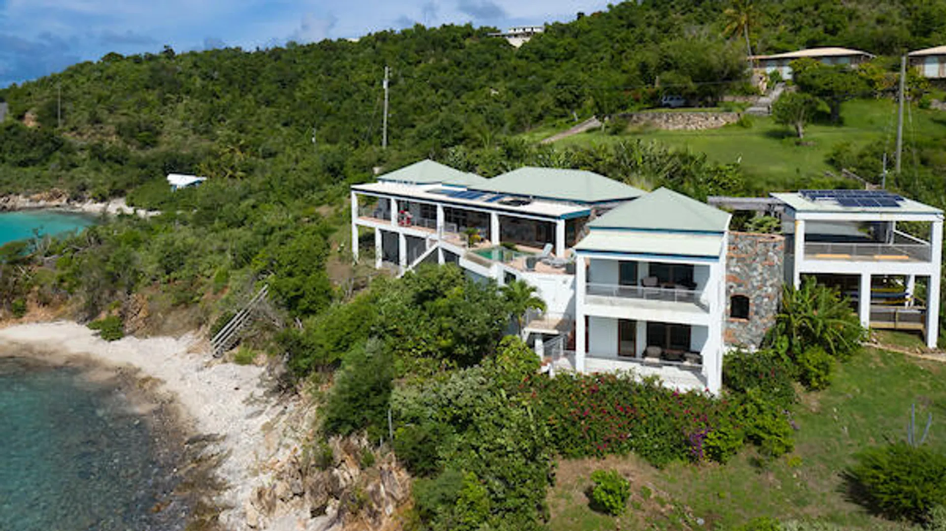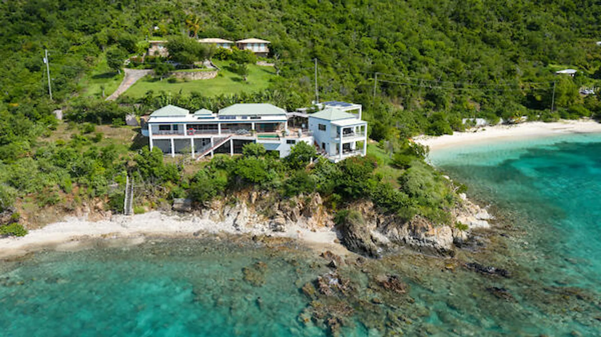 ''East of Eden'' is an exceptional waterfront property nestled above Lime Tree Bay with access to an expansive white sand beach, and a cove with a cobble/sand pocket beach. This stone & masonry villa is architecturally striking and consists of 3 bdrms x 3.5 baths. The main house features a great room, dining area and a modern, well-equipped kitchen. A large screened-in room provides additional dining space and comfortable lounging opportunities. Every room has an unimpeded view of Round Bay. Just off the great room is the sundeck with an infinity-edge pool, chaise lounges and a dining area. The 3 primary bedrooms consist of king-sized beds, en-suite baths, balconies, outdoor showers with an ocean view and one features an indoor shower. Amazing views from every room!