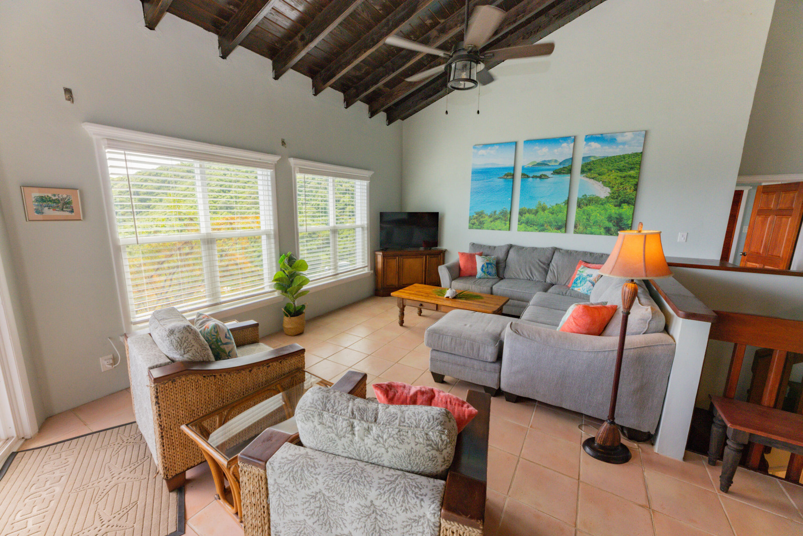 Casanita is a well-built masonry home with stunning water views across the Caribbean to the British Virgin Islands. This 3 bed 3 bath home was recently renovated with a new roof, windows, doors, hurricane shutters, appliances and more. It has an open floor plan and a spacious master suite on the main level. All of the openings on the main level are 36 inch wide door frames for easy access from room to room. An internal staircase connects to the other two bedrooms with ensuite baths and laundry room. Each bedroom has a balcony to take in the views and provides comfort with AC. The flat driveway and only two steps to the main living area and primary bedroom suite makes this home easily accessible. It would be the perfect island residence or could continue as a successful short term rental.