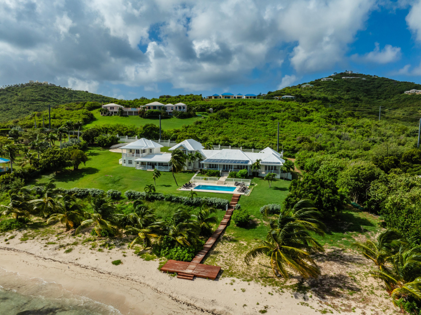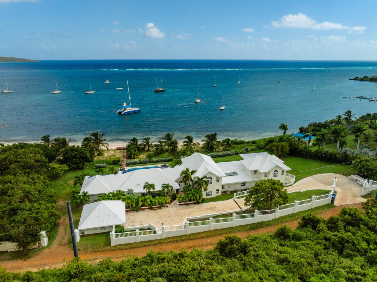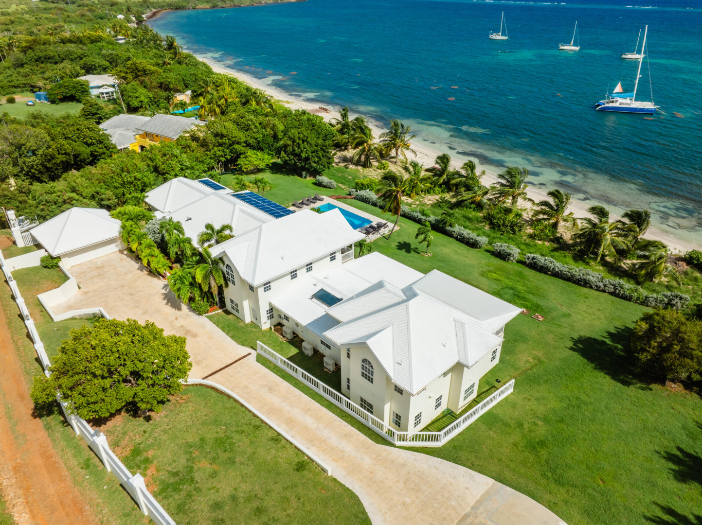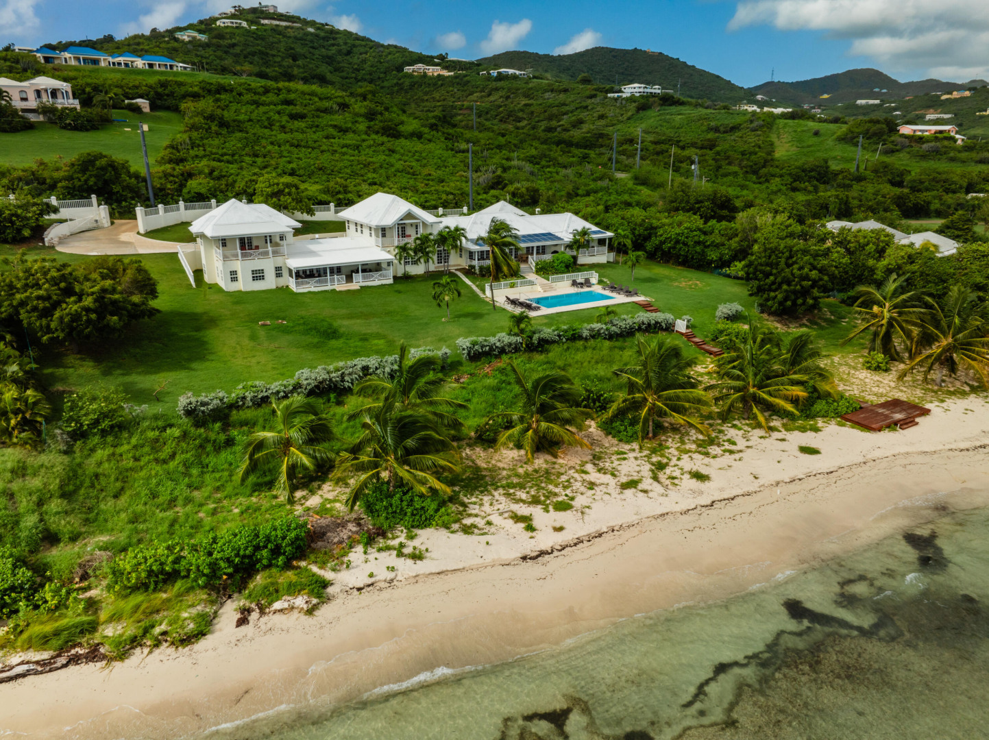 ** RECENTLY UPDATED with new furnishings inside and out, repaired windows, solar panels installed, putting tiles on the concrete driveway, freshly painted inside, cleaning & re-grouting the showers, and new exterior lighting fixtures! This is stunning beach front home w/ over an acre of land located directly on a gorgeous sandy beach. Beautiful views of Buck Island & all of Teague Bay from every room & patio. Featuring chefs kitchen, pool, automatic generator, 2 master bedrooms w/ en-suite baths and balconies. 4 additional bedrooms (including a bunk room) & 3 additional bathrooms. This home makes for a perfect family retreat, vacation home (rents for over $1500 per night!) . Excellent opportunity to take over the existing rental income flow and book out the weeks you want for yourself!