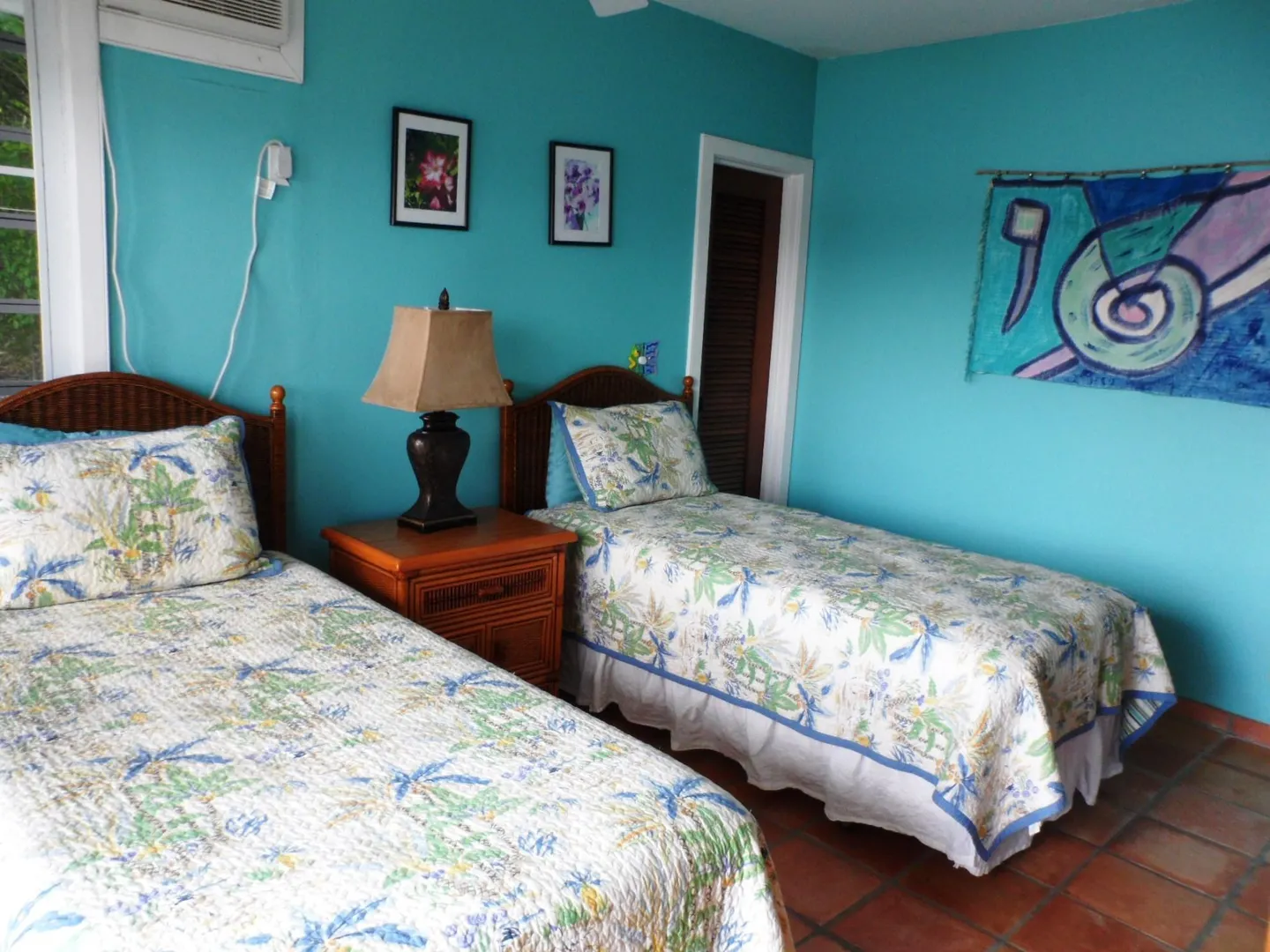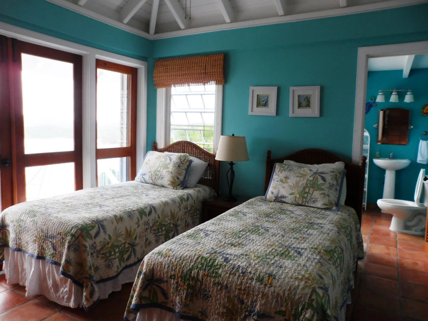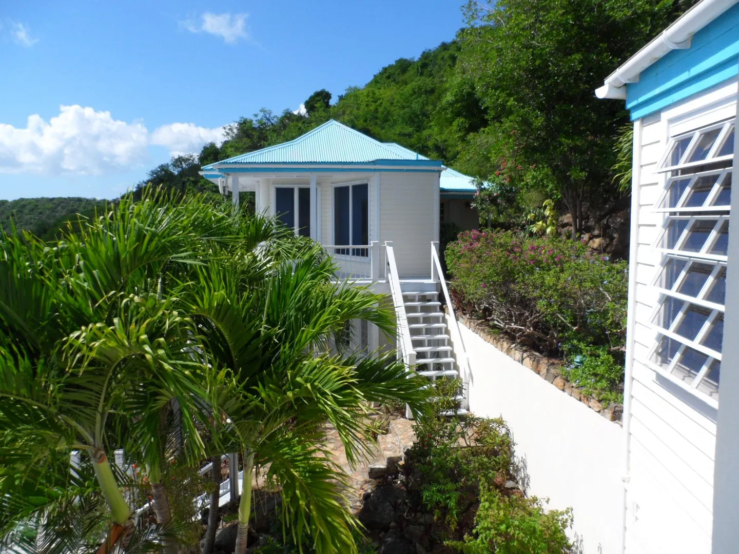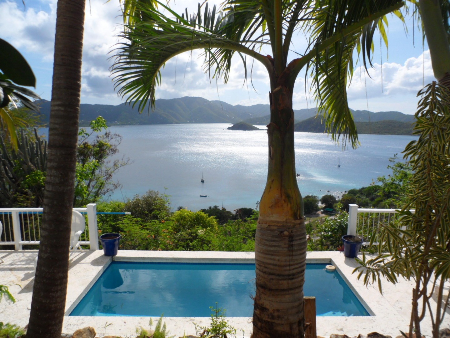 Wild Jasmine is located on the quiet East End of St. John in an upscale subdivision known as Privateer Bay Estates. Amenities include paved roadways, underground utilities, deeded access to two beaches and exclusive owner use of two rustic beach cottages. The two separate buildings feature an open layout with each room opening onto spacious decks from which to take in the sweeping bay vistas. The south building consists of the main living, kitchen and dining area flanked on either side by two air conditioned bedroom suites. The north building has an office, sitting area, wet bar and air conditioned bedroom suite on the upper level plus two air conditioned bedroom suites on the lower level. Stairways lead from each deck to a central pool and sunning patio surrounded by lush palms.
