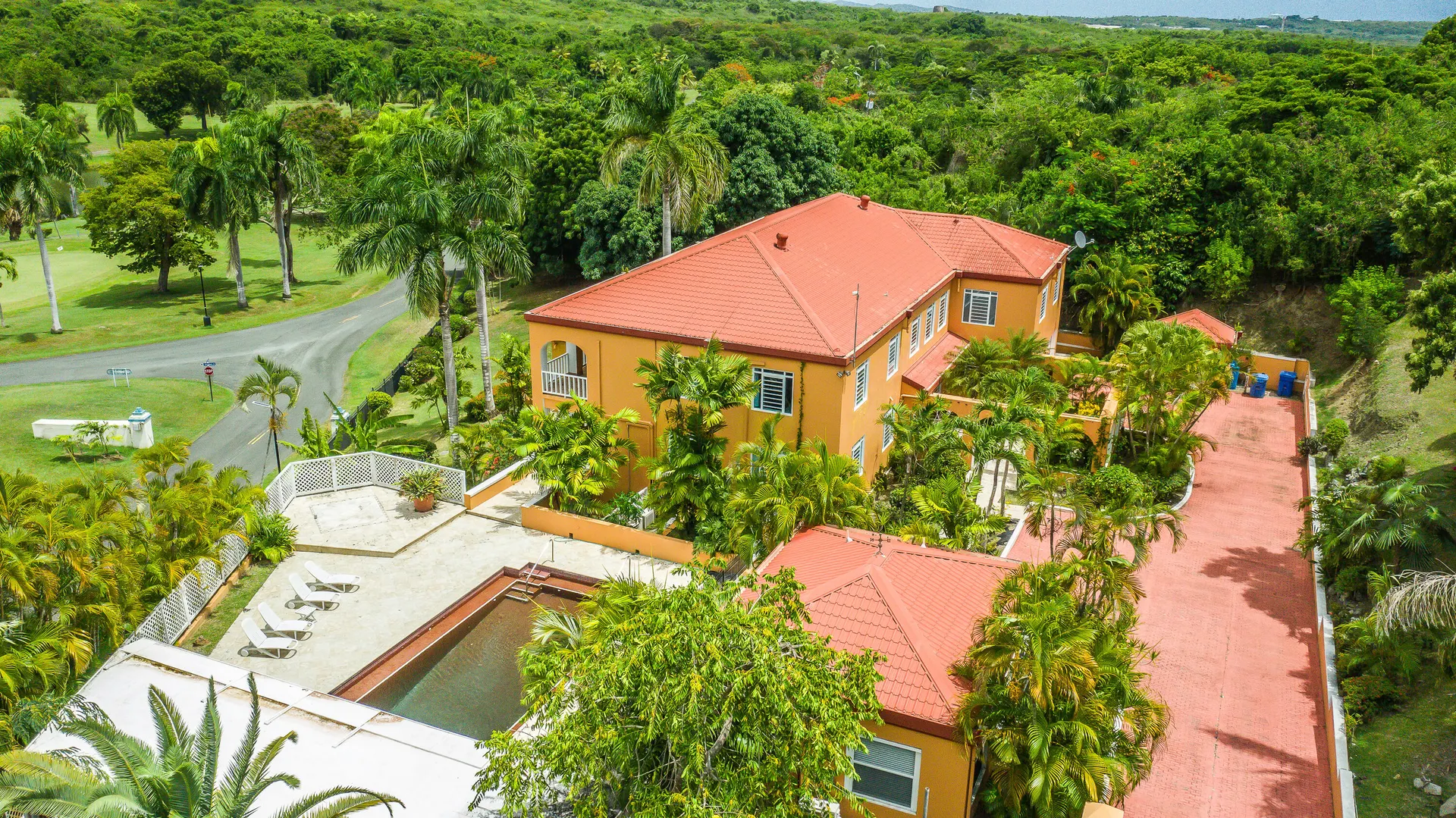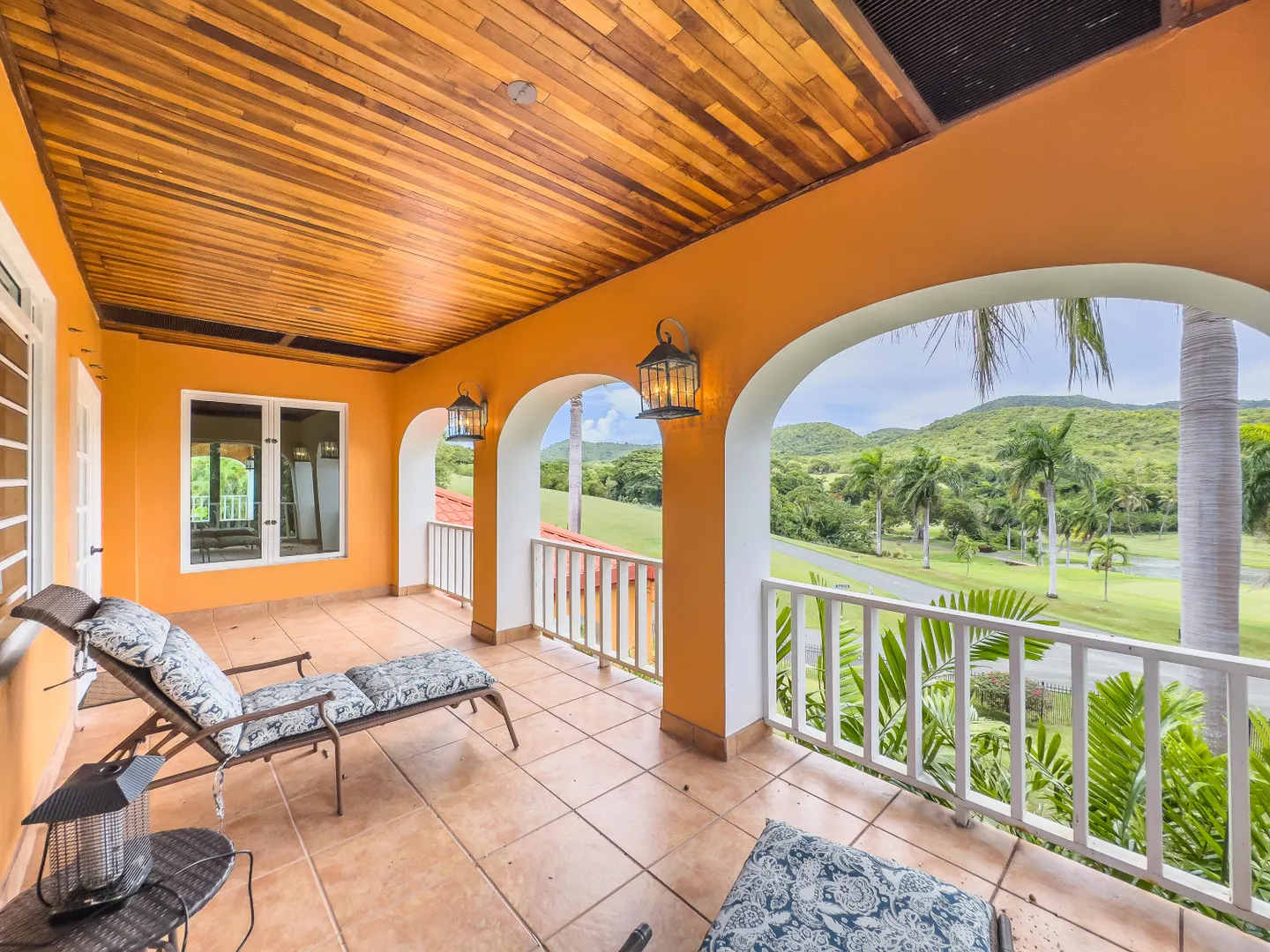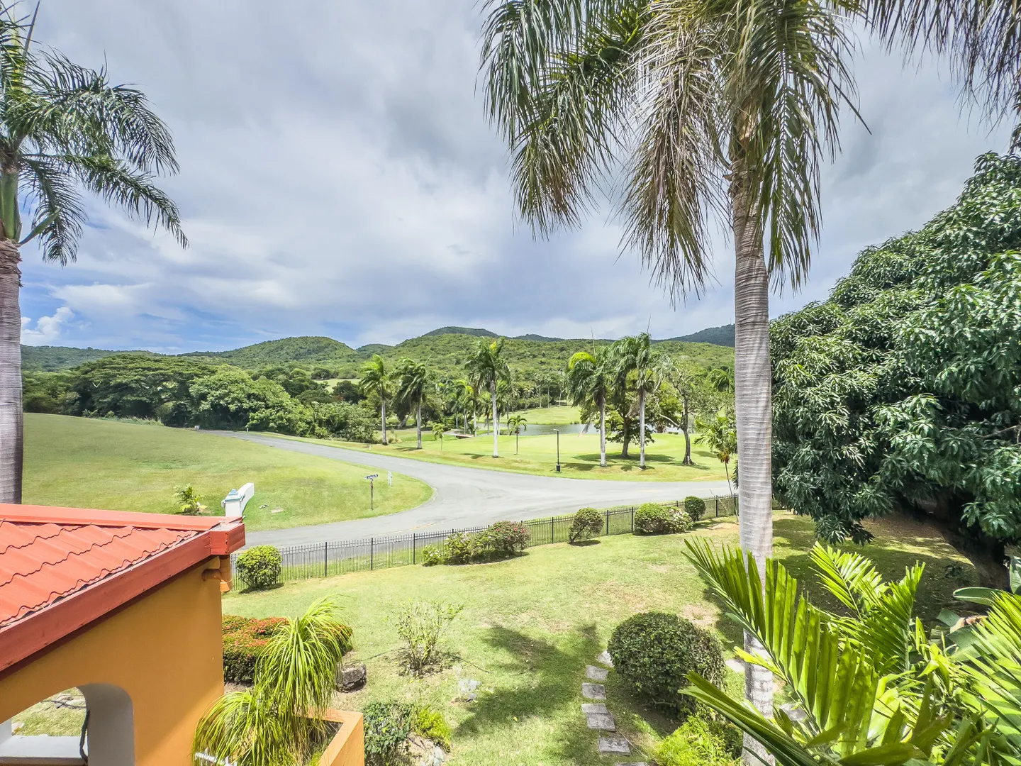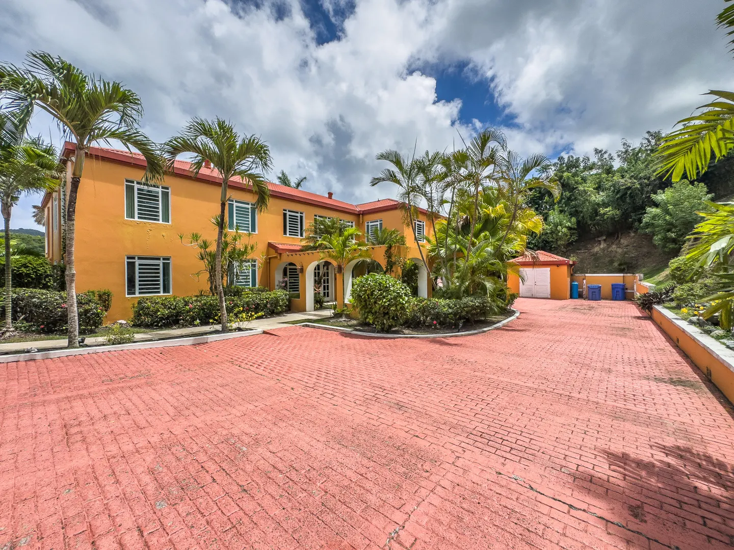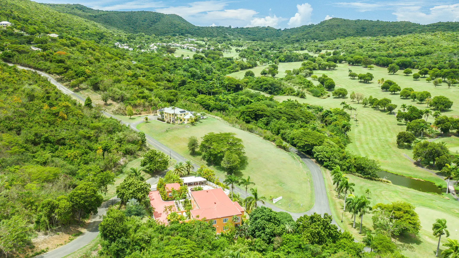Welcome to Ginger Fancy at 66 Estate River--a stately, fully gated Caribbean retreat offering timeless style, resort-caliber amenities, and breathtaking golf course views. This exceptional estate overlooks the 4th green of the Robert Trent Jones-designed golf course at Carambola Country Golf Club, delivering a serene, picture-perfect backdrop for everyday living and entertaining.The main residence features 4 bedrooms and 4 baths, including a spacious living and dining room, an entertainment/theater room, and a wet bar ideal for hosting. The updated kitchen is supported by a convenient staging area, and the home is thoughtfully designed with a first-floor laundry room and a huge two-car garage with ample extra storage.Upstairs, the primary suite is a true sanctuary with a large private balcony, an oversized bath with his-and-her vanities, a separate shower, and a stand-alone tub. The suite is complemented by a massive, air-conditioned walk-in closet. A guest bedroom also enjoys its own balcony, and additional guest rooms feature walk-in closets for comfort and convenience.