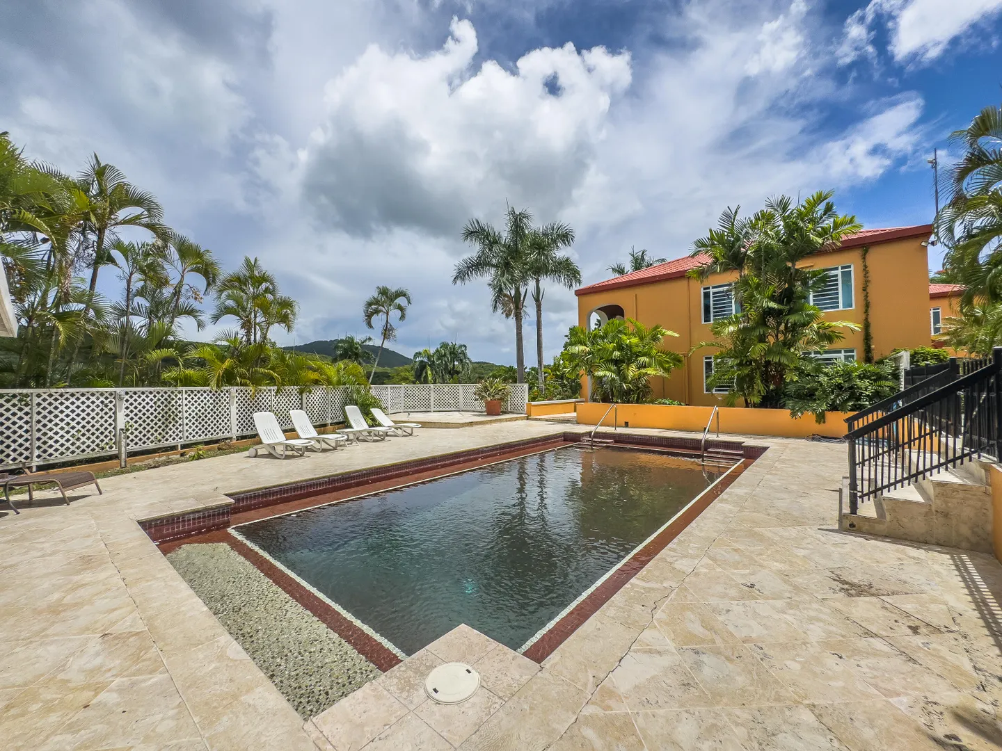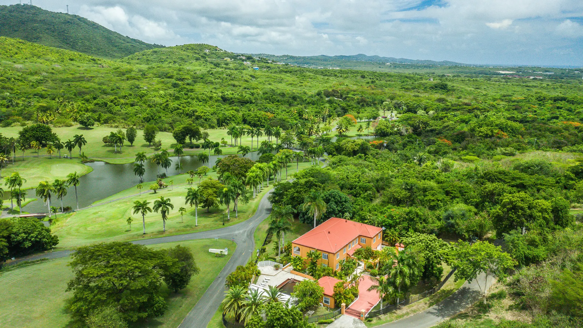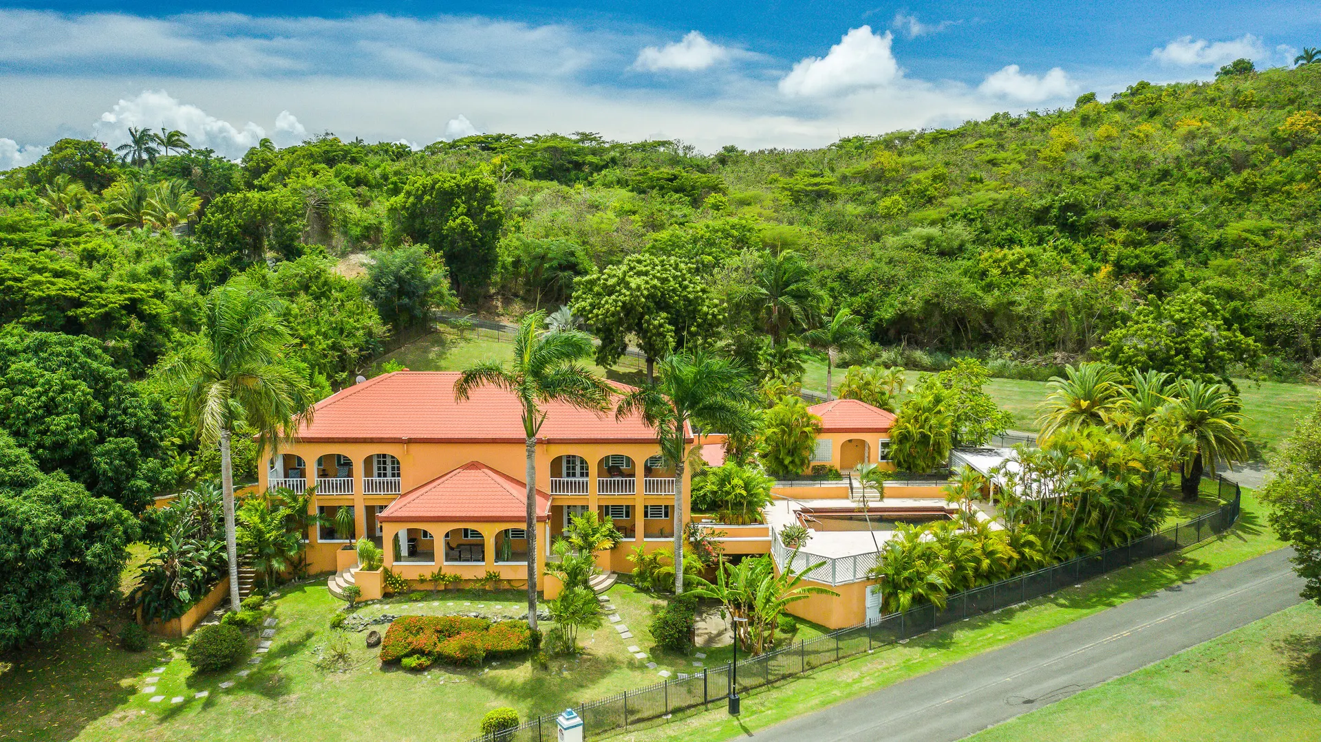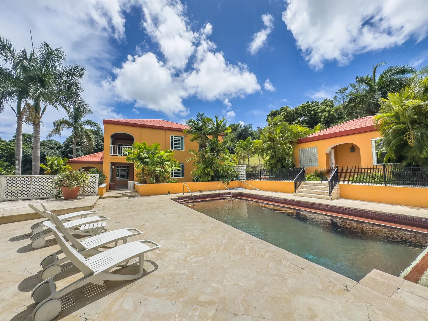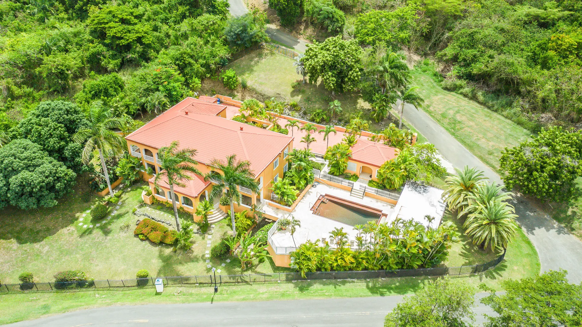 Welcome to Ginger Fancy at 66 Estate River--a stately, fully gated Caribbean retreat offering timeless style, resort-caliber amenities, and breathtaking golf course views. This exceptional estate overlooks the 4th green of the Robert Trent Jones-designed golf course at Carambola Country Golf Club, delivering a serene, picture-perfect backdrop for everyday living and entertaining.The main residence features 4 bedrooms and 4 baths, including a spacious living and dining room, an entertainment/theater room, and a wet bar ideal for hosting. The updated kitchen is supported by a convenient staging area, and the home is thoughtfully designed with a first-floor laundry room and a huge two-car garage with ample extra storage.Upstairs, the primary suite is a true sanctuary with a large private balcony, an oversized bath with his-and-her vanities, a separate shower, and a stand-alone tub. The suite is complemented by a massive, air-conditioned walk-in closet. A guest bedroom also enjoys its own balcony, and additional guest rooms feature walk-in closets for comfort and convenience.