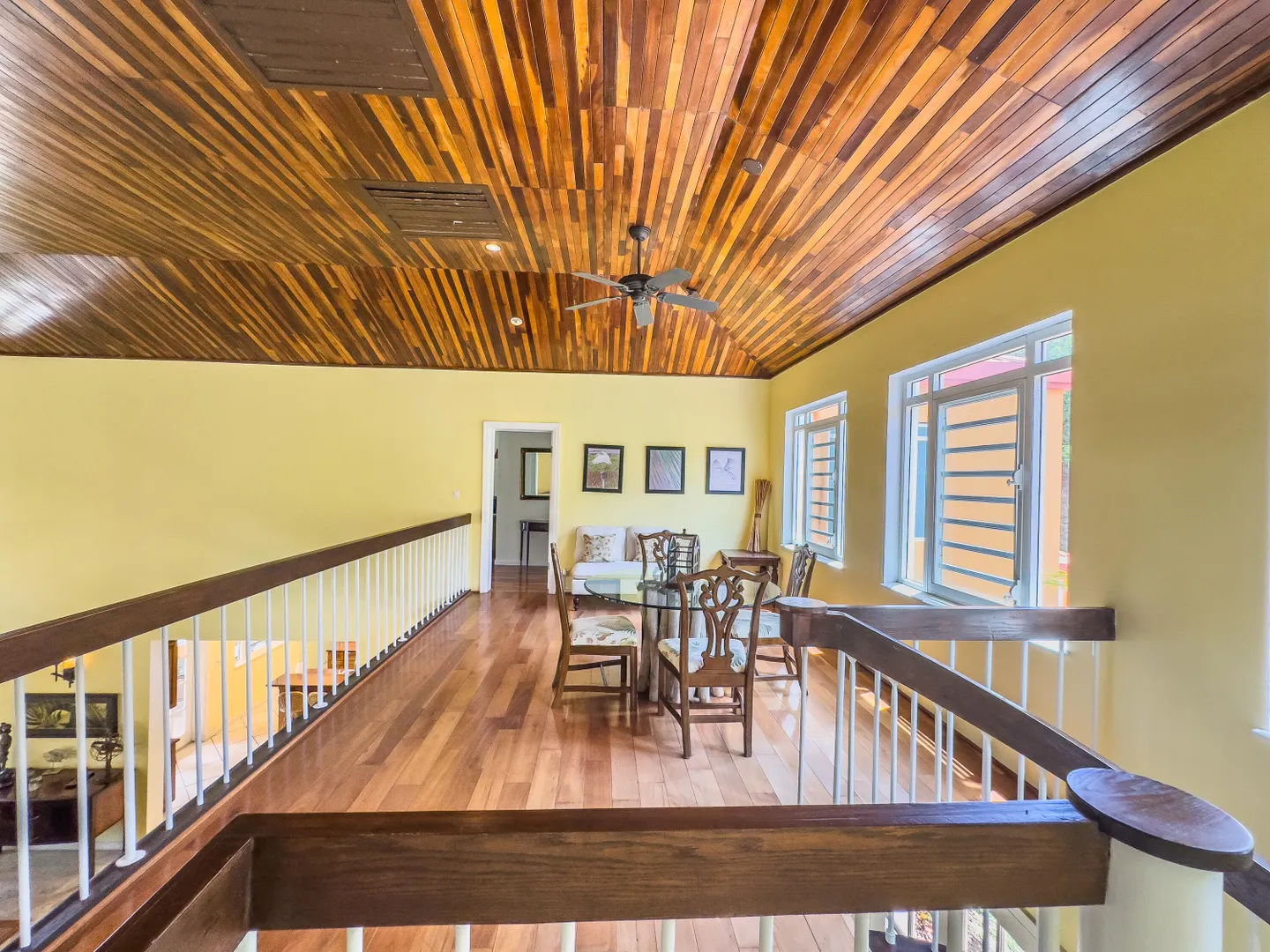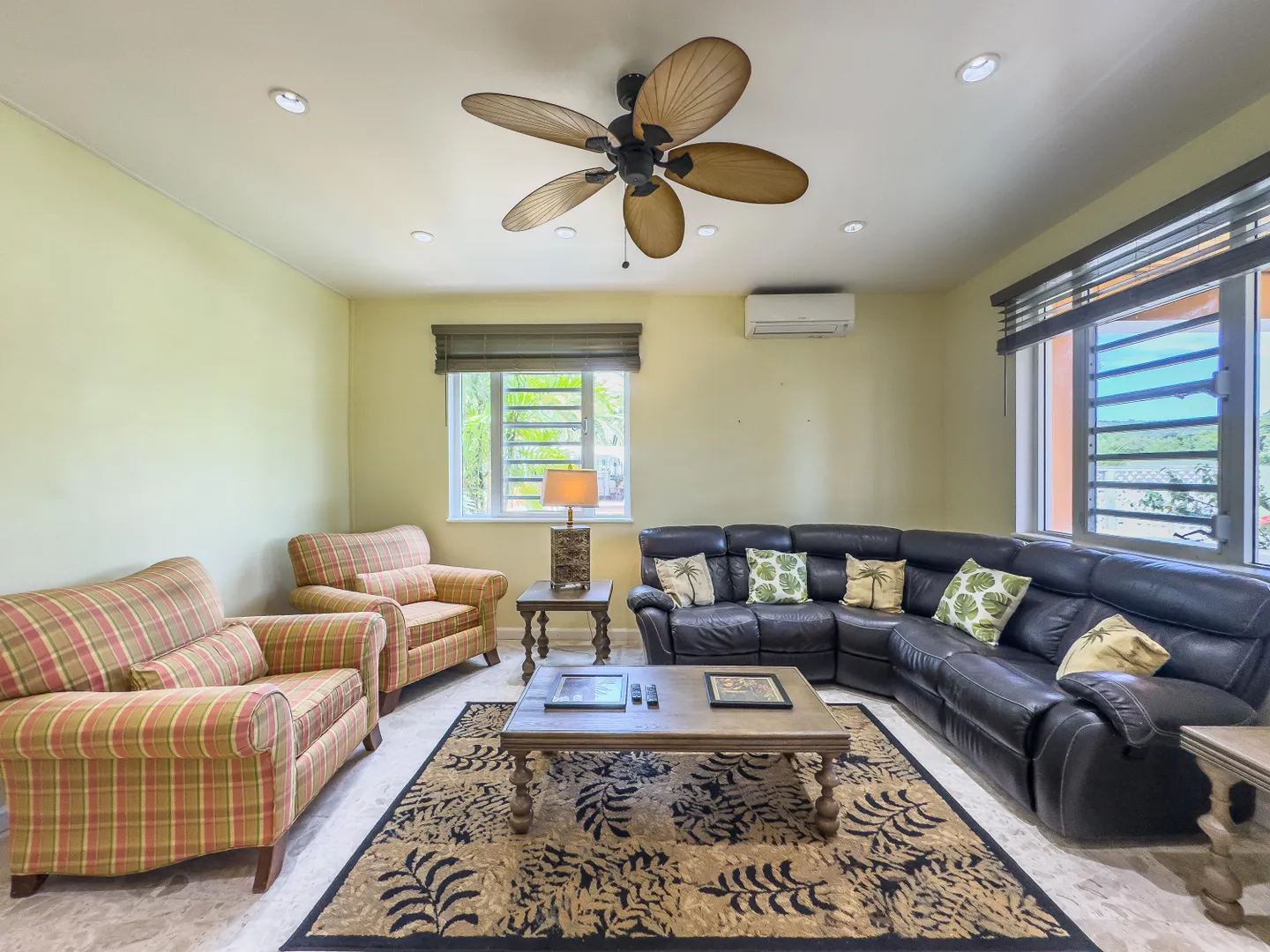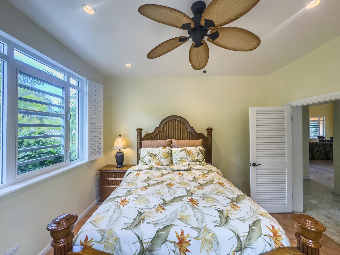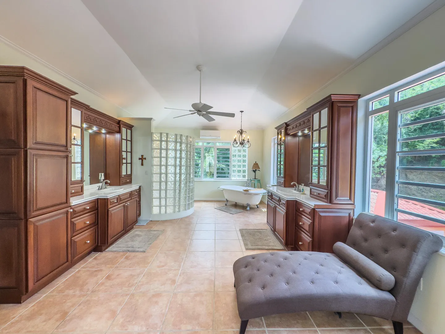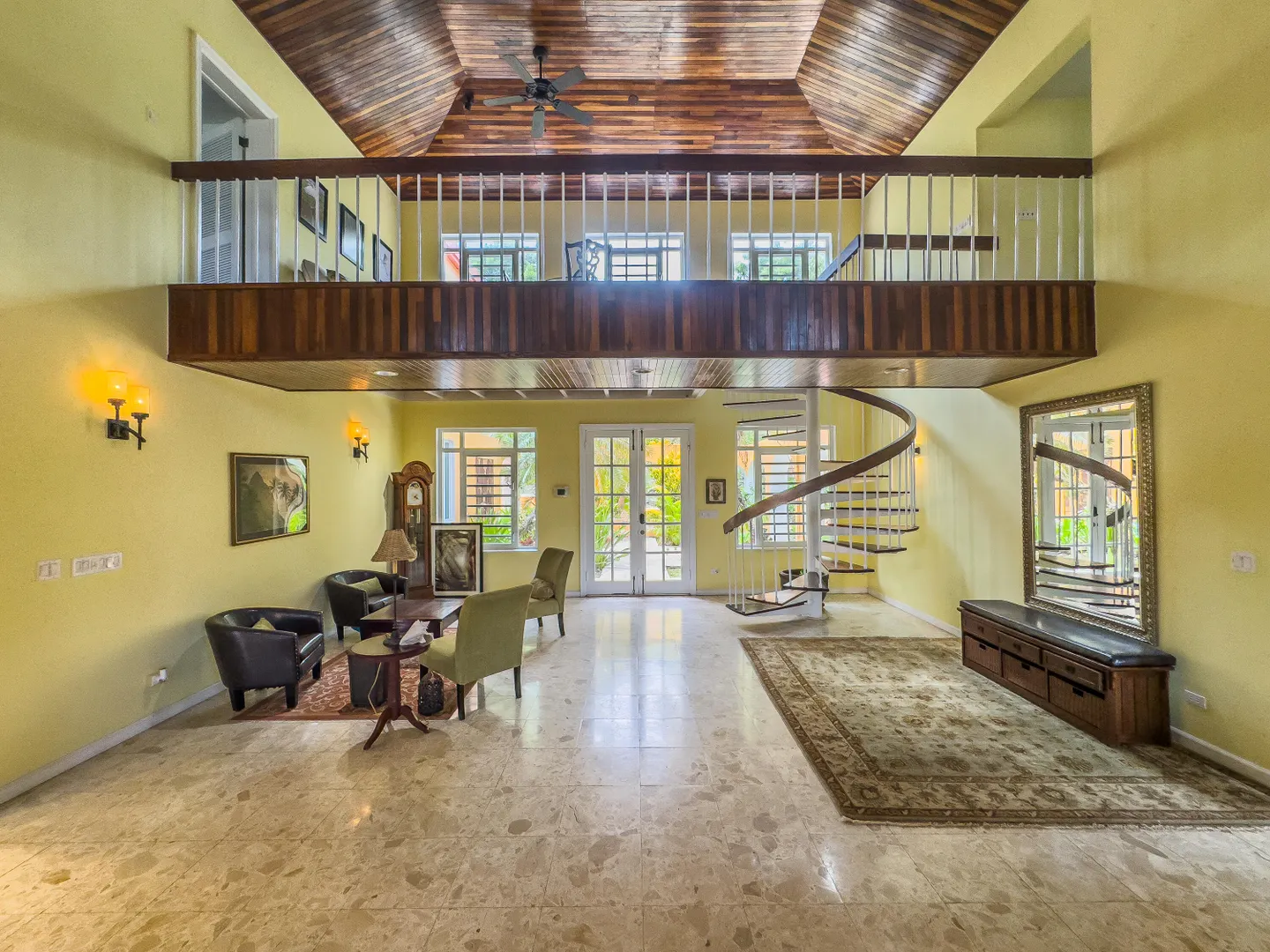 Welcome to Ginger Fancy at 66 Estate River--a stately, fully gated Caribbean retreat offering timeless style, resort-caliber amenities, and breathtaking golf course views. This exceptional estate overlooks the 4th green of the Robert Trent Jones-designed golf course at Carambola Country Golf Club, delivering a serene, picture-perfect backdrop for everyday living and entertaining.The main residence features 4 bedrooms and 4 baths, including a spacious living and dining room, an entertainment/theater room, and a wet bar ideal for hosting. The updated kitchen is supported by a convenient staging area, and the home is thoughtfully designed with a first-floor laundry room and a huge two-car garage with ample extra storage.Upstairs, the primary suite is a true sanctuary with a large private balcony, an oversized bath with his-and-her vanities, a separate shower, and a stand-alone tub. The suite is complemented by a massive, air-conditioned walk-in closet. A guest bedroom also enjoys its own balcony, and additional guest rooms feature walk-in closets for comfort and convenience.