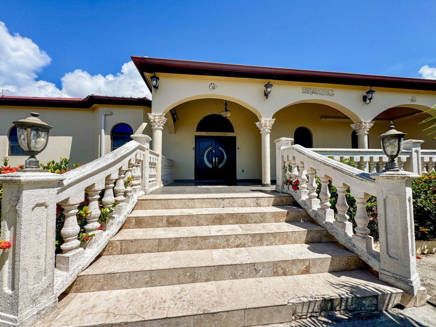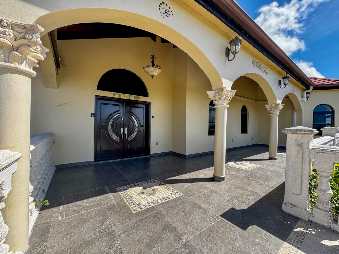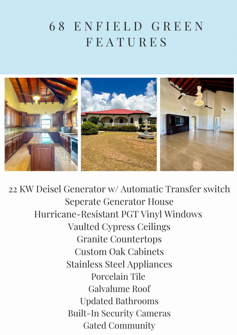 Gorgeous turn key property in the gated community of Enfield Green. Located on St. Croix's south shore, this spacious 4 bedroom, 3 bathroom home sits on 0.67 acres with stunning views of the Caribbean Sea. Built in 2017 the home was designed with both comfort and durability in mind. Adorned with high end finishes, a custom oak wood kitchen with granite countertops, stainless steel appliances, updated bathrooms, porcelain tile throughout, gorgeous high vaulted Cypress wood ceilings, split A/Cs throughout, hurricane-resistant PGT vinyl windows, Galvalume roof, built-in security cameras, and 22 KW diesel generator with automatic transfer switch, this property combines elegant modern living with practical island features.Step inside the elegant entryway to a grand open floor plan with soaring high ceilings, gorgeous high end finishes, and custom chandeliers. A spacious open living and dining room creates a harmonious space for entertaining and relaxation filled with natural light bringing warmth and comfort to the home.