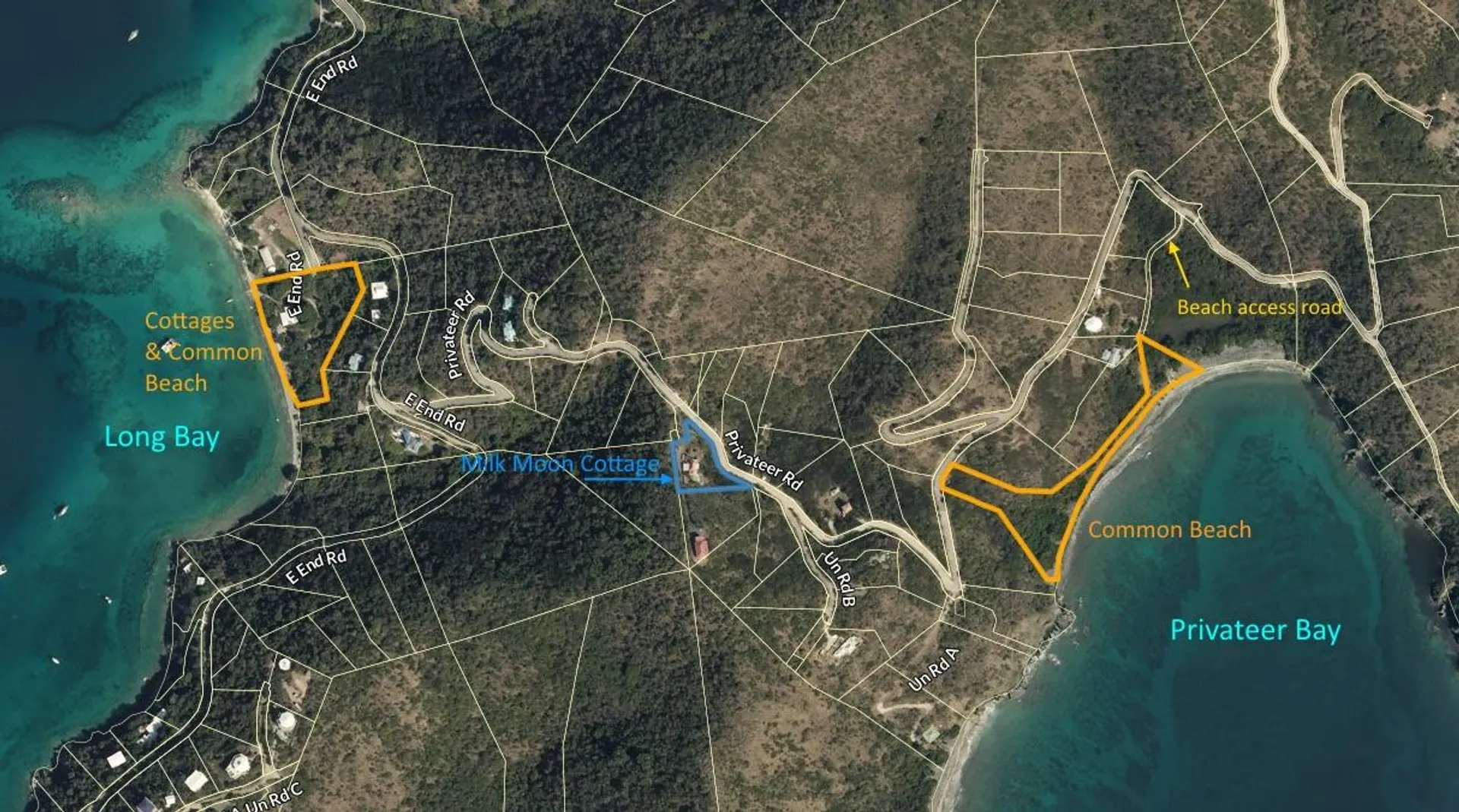MILK MOON COTTAGE. No structural damage from storms. Expansive Breathtaking Views, Privacy, Tranquility and Cooling Breezes make this charming 2 bedroom home in Privateer Bay Estates very special. Easy access on paved roads, ample parking, and NO STAIRS to the front entrance! Large masonry pool, native stone work, tastefully furnished and landscaped. This home is in excellent condition and enjoys exceptional success as a vacation rental property. Paved roads and underground utilities. Ownership includes deeded access to two beach parcels and owner use of the association owned Newfound Beach Cottages. http://privateerbay.org/ NOTE: there is an additional masonry gray water cistern (7,500 gal) for irrigation use.