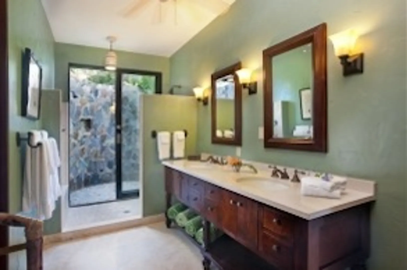 The main house features a master suite and four guest suites, all with A/C, each with their own full bathroom (two with outdoor showers and two stone showers with North shore views ), all with king size beds.