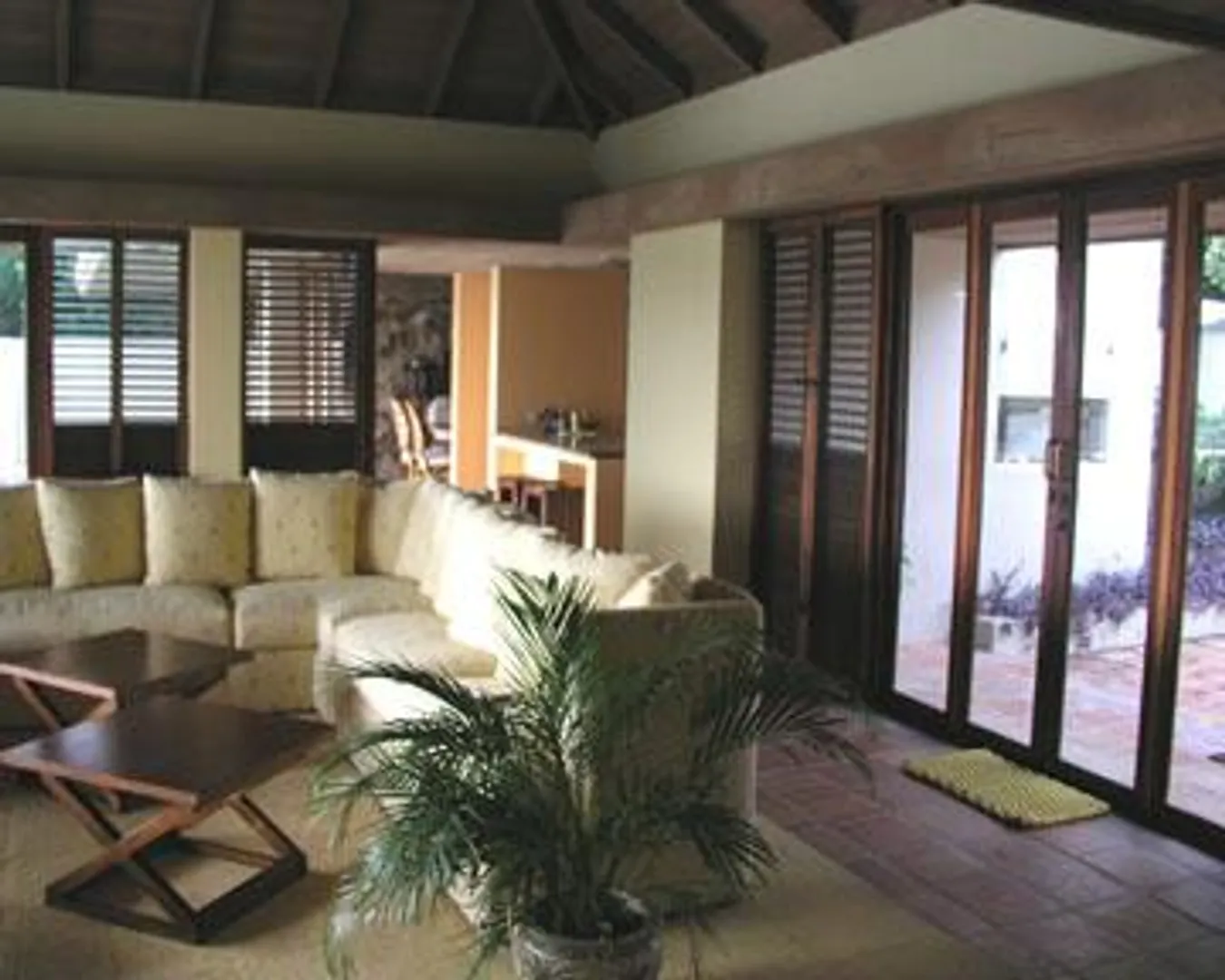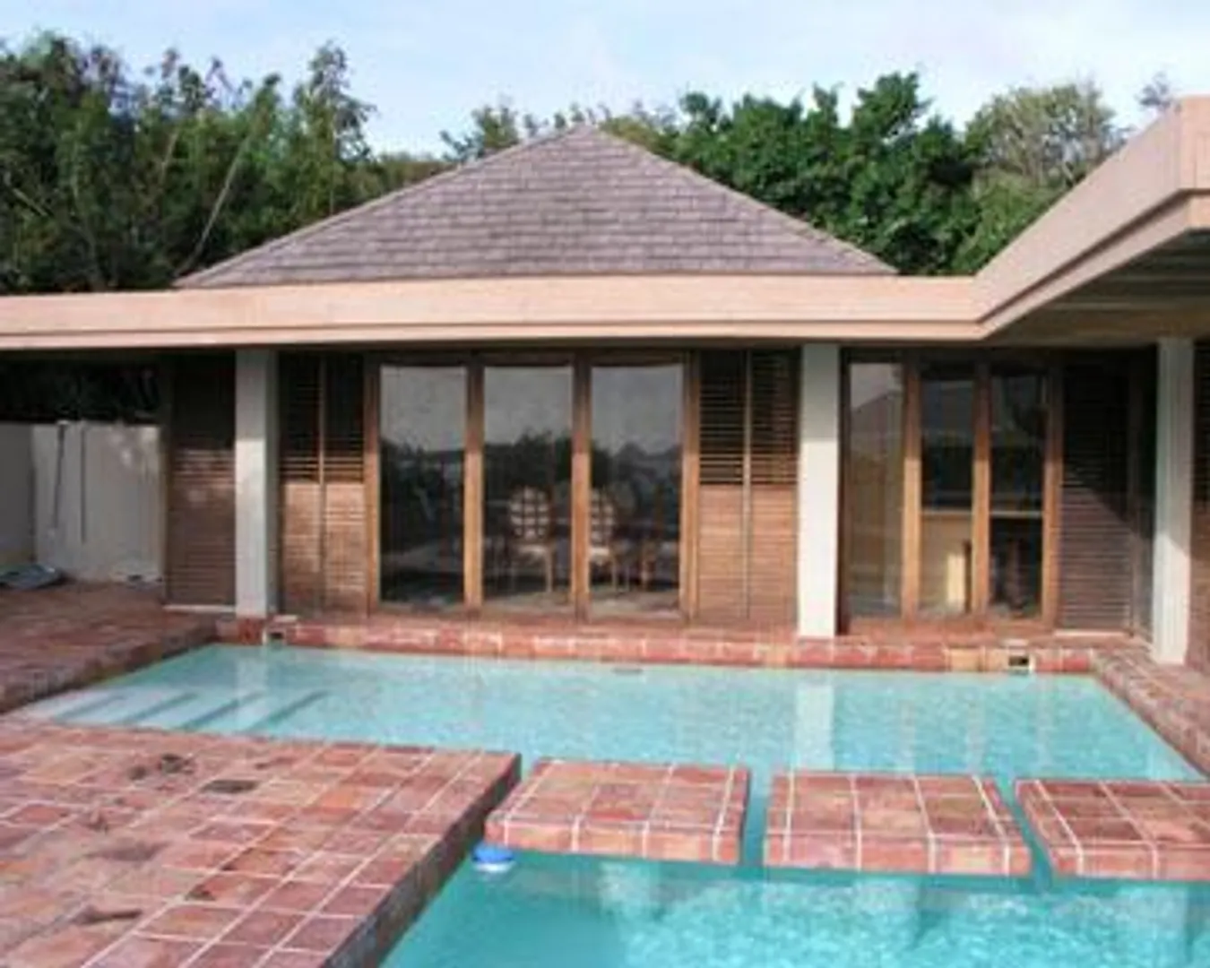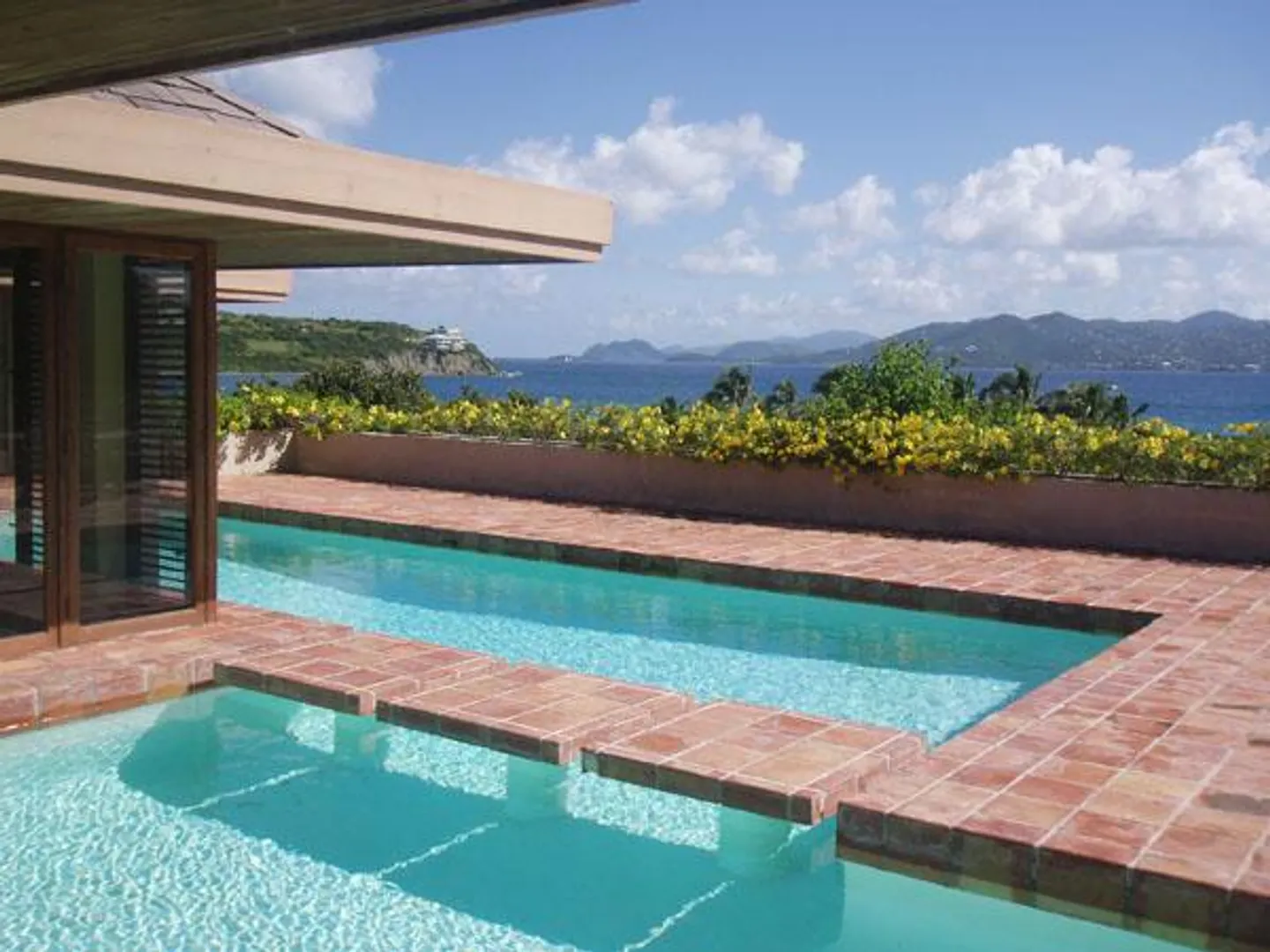 The one and only home for sale in prestigious WATER POINT ESTATES. The quintessential beach house with amazing 'double pool! Bordering the 5 acre recreation parcel, walk down a short path on this property directly onto the sandy beach. Villa offers fabulous views of St. John and beyond. Lovely stonework, tropical hardwoods and high pitched ceilings give this property a Balinese feeling.Water Point Estates offers the best of everything St. Thomas has to offer within the gated confines of the sub-division. There is a 5 acre recreation parcel with a white sand beach, dock, BBQ area, gazebo and tennis court. Smooth paved roads throughout, a dedicated caretaker on premises, reverse osmosis plant for sub-division offering below cost fresh water when your cistern runs dry, common areas lushly landscaping. The villa offers dramatic views of the Atlantic ocean, neighboring islands and cays and passing yacht "traffic" . Preserving the integrity of the sub-division and the privacy of your neighbors, no rentals are allowed for less than one year; therefore, no vacation villa rentals allowed.