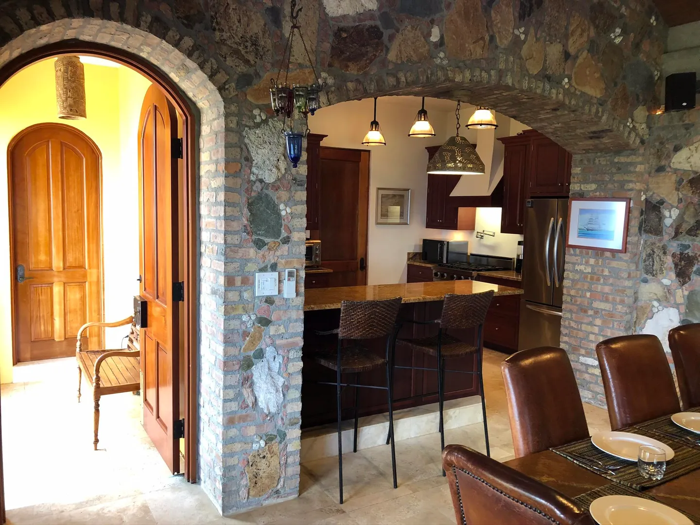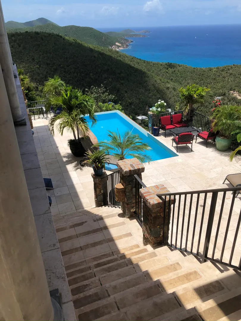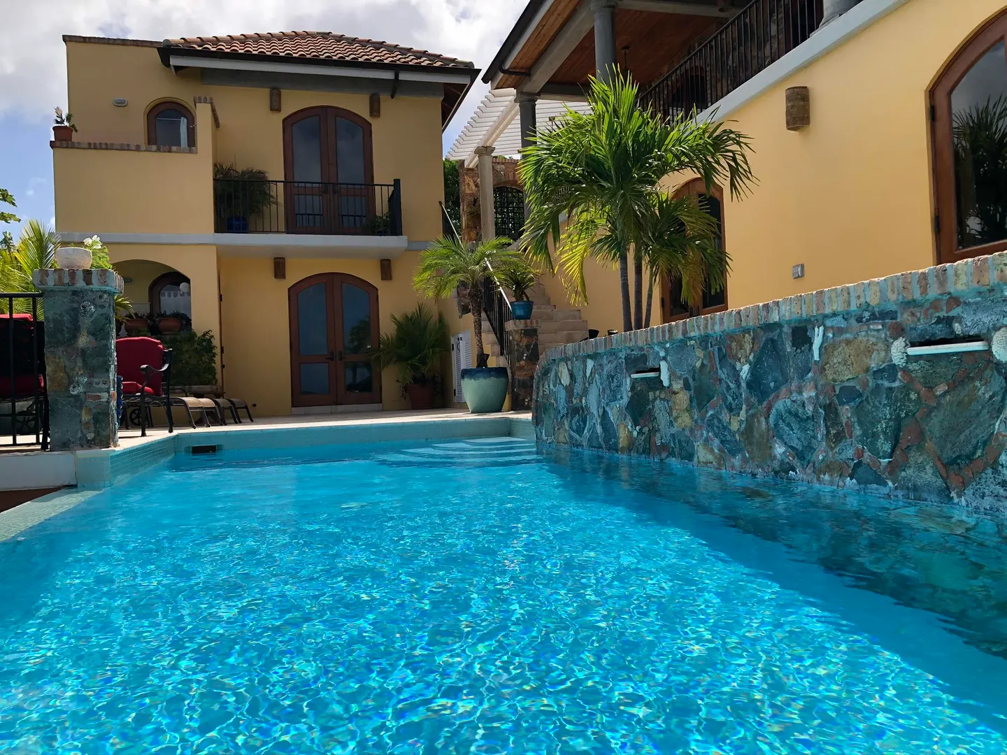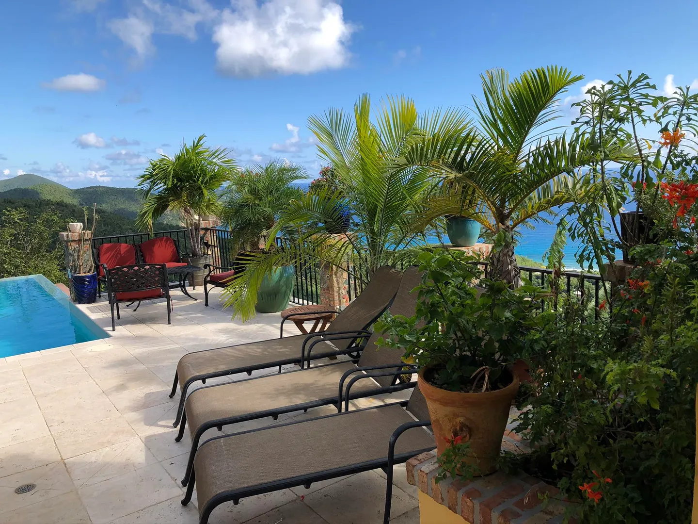 South Shore Villa offers a stunning mountaintop setting for enjoying soothing tradewinds and the relaxing island lifestyle. Two lots (totaling just over one acre of land) convey with the fully furnished luxury stone and masonry villa with 4 large master suites (all with ocean views), 4.5 baths including two outdoor showers, gourmet kitchen, air-conditioned throughout, and infinity edge swimming pool. Located next to National Park lands with a spellbinding panoramic view of the ocean, mountains, sunrises, Ram Head, white cliffs and St Croix. This lovely residence in the Skytop subdivision of Fish Bay, is very private yet convenient only minutes from town. Completed in 2006 with ample private and common spaces featuring superior decorative finishes throughout; custom mahogany doors