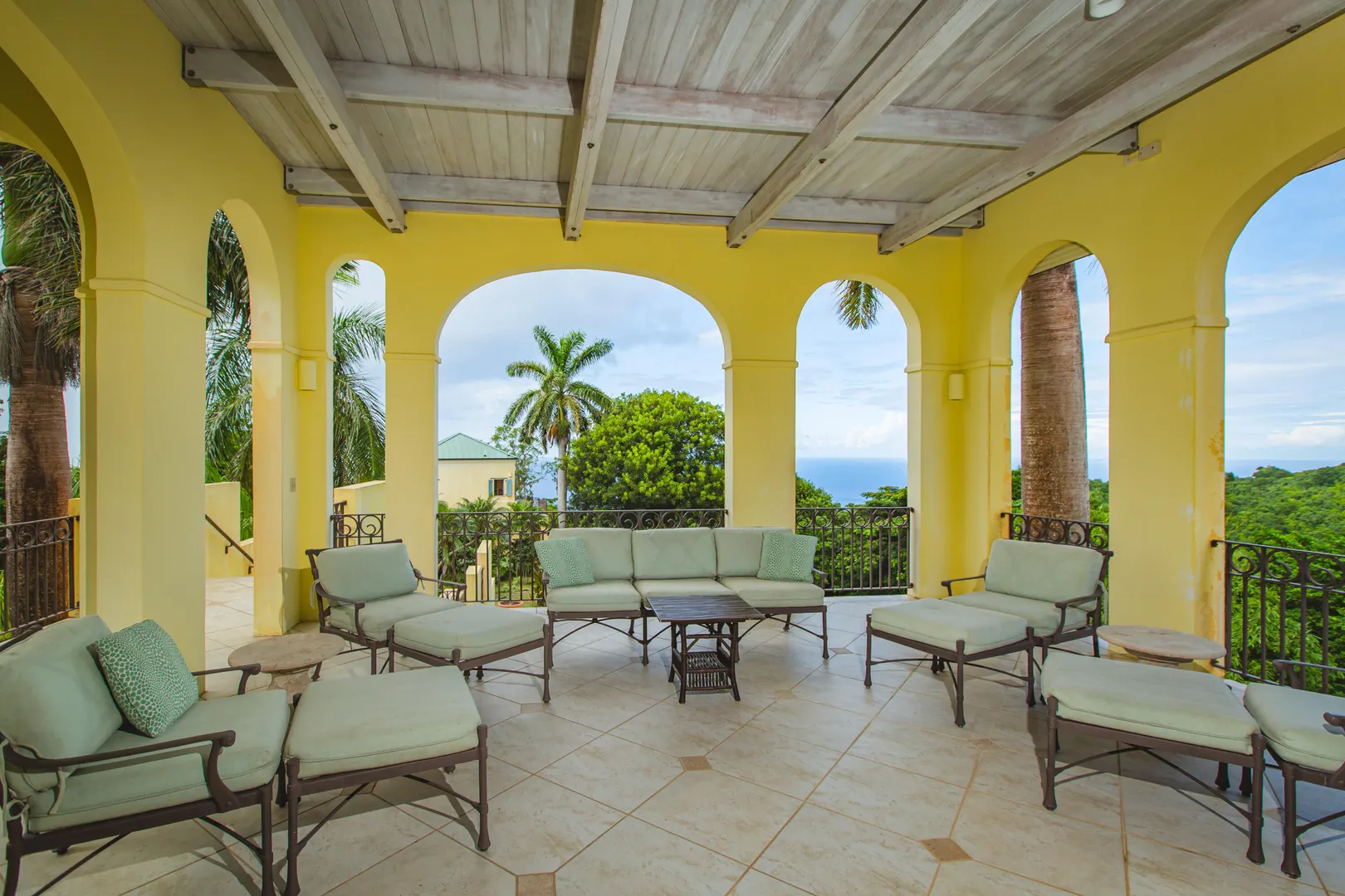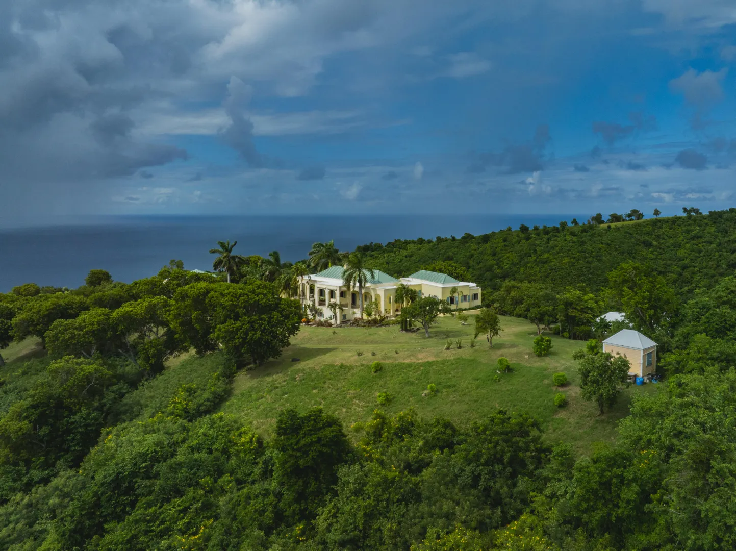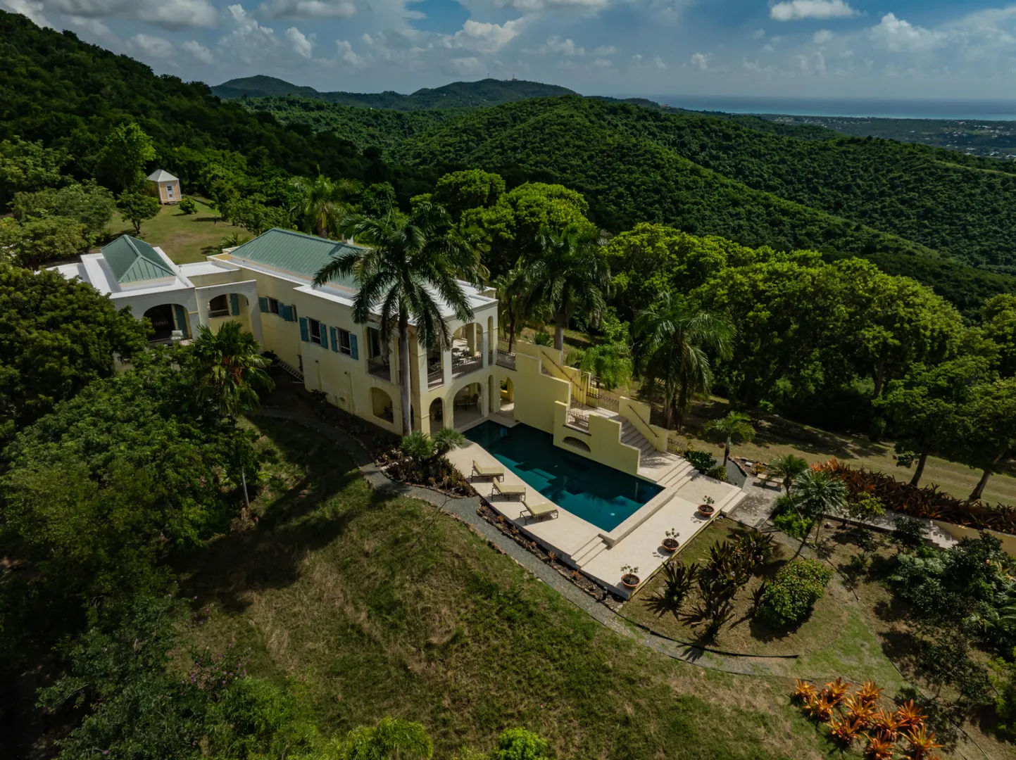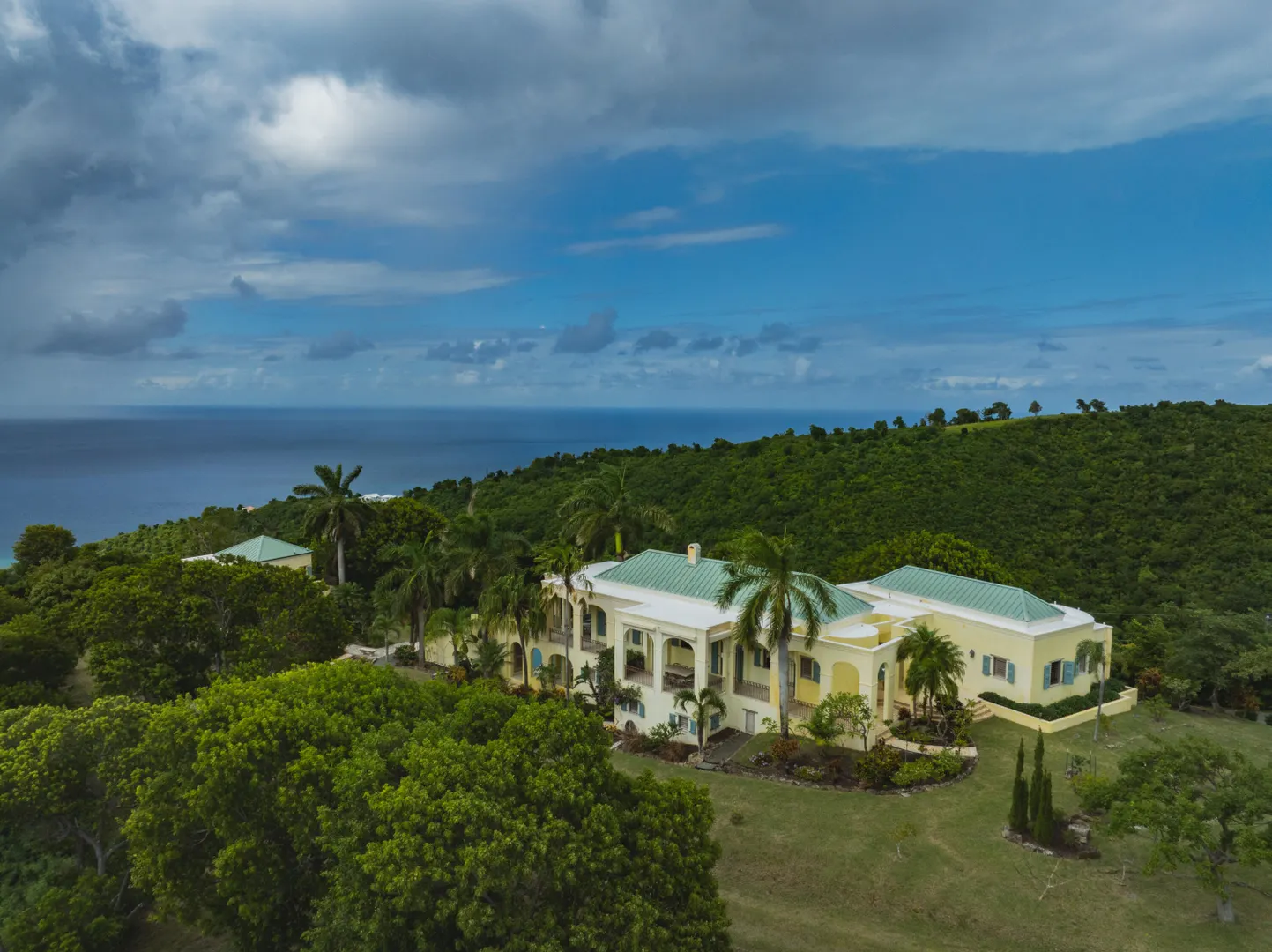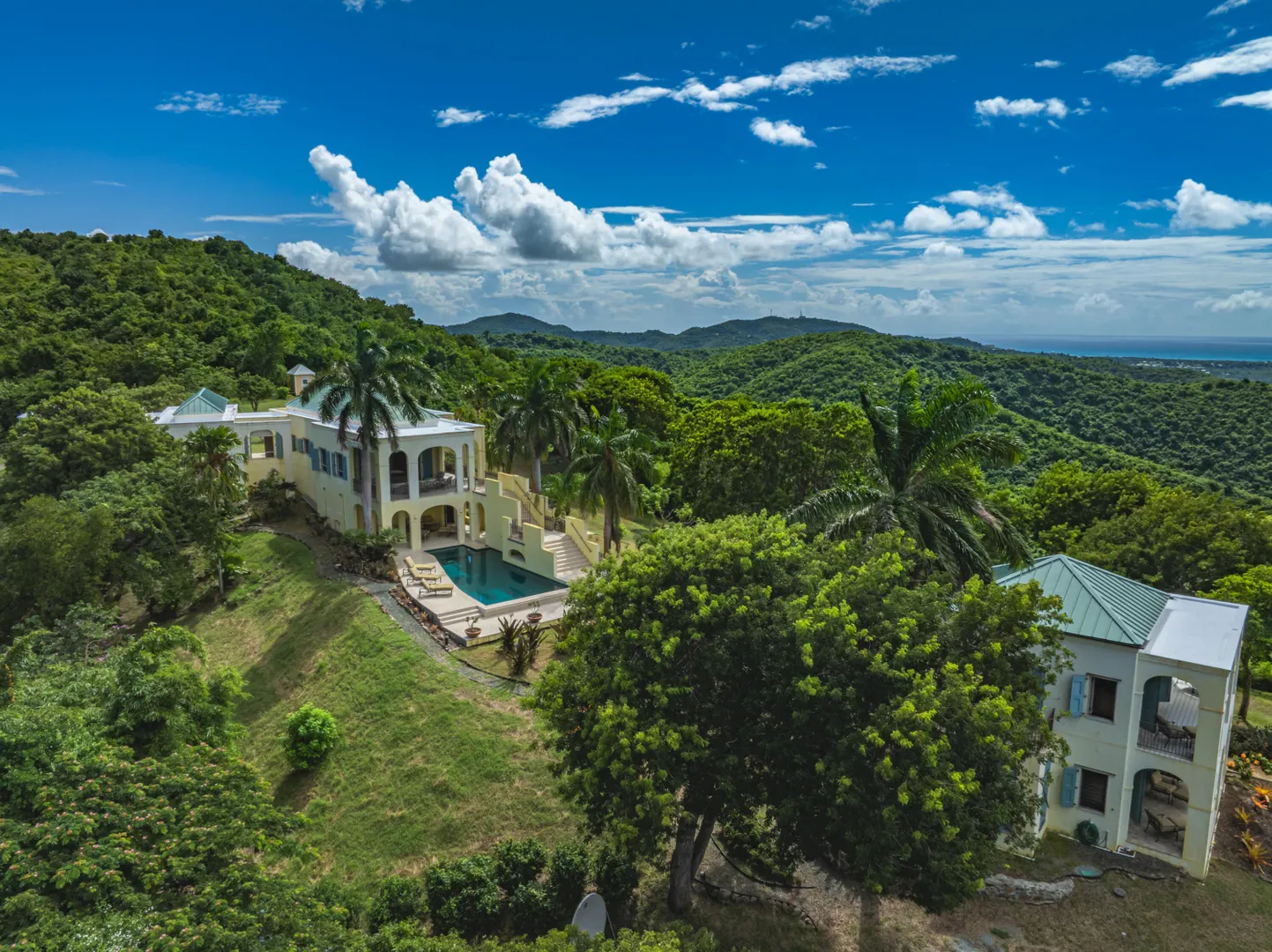 Perched at an elevation of 660 feet on the exclusive, gated roads of Washington Hill, this exquisite estate epitomizes timeless craftsmanship and offers unparalleled ocean views, encompassing Frederiksted pier, Puerto Rico, Vieques, and Culebra.Designed by the esteemed George Hascup, former Director of Design at Cornell University's School of Architecture, this remarkable residence was constructed between 1997 and 2000. It features a robust exterior of poured, steel-reinforced concrete and elegant cement block interiors, all set upon over 8 expansive hilltop acres. Every element of woodwork, from the grand four-poster beds to the gracefully arched windows and doors, is crafted from luxurious mahogany, culminating in a breathtaking mahogany cathedral ceiling.The exquisite millwork and treated metal finishes were all installed by Walsh Metal Works.