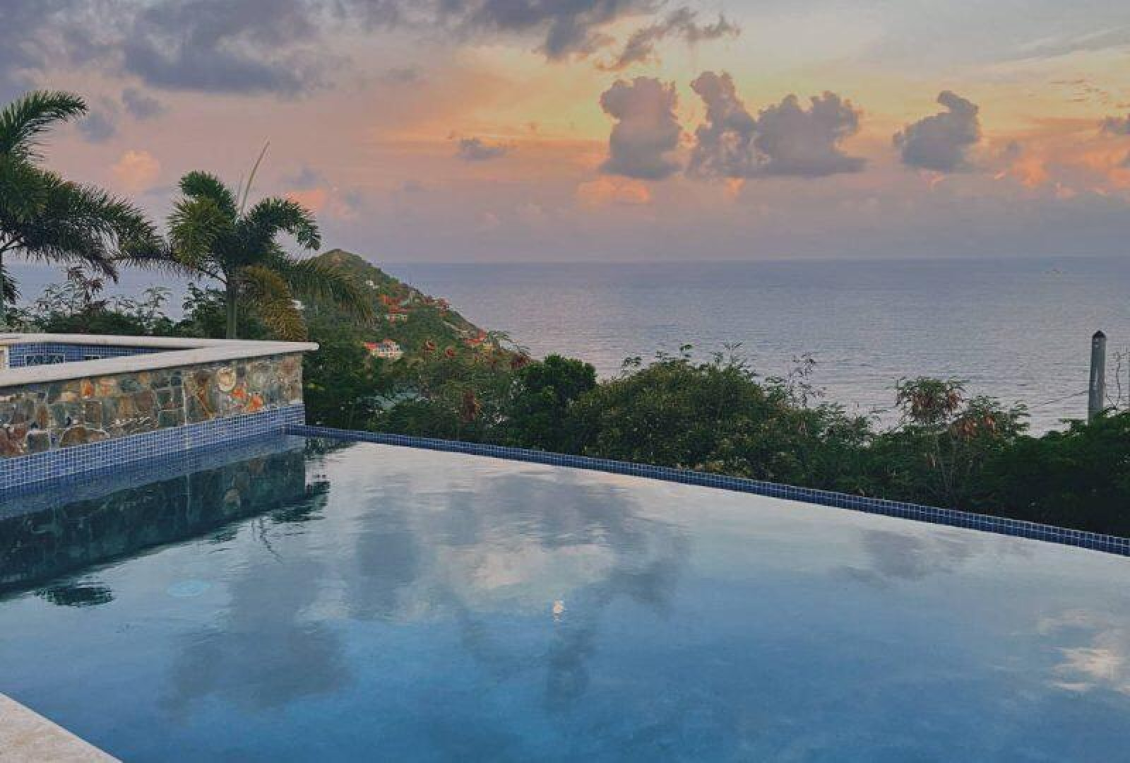 Orchid Hill is a custom built, Caribbean style home with double sided native stone, overlooking the Caribbean Sea, with 280-degree panoramic views. Located in the prestigious Maria Bluff neighborhood with lush tropical gardens, vaulted ceilings, arched mahogany doors and windows, spacious great room & bedroom with Serena & Lily decor. 2 bedrooms & 2 bathrooms with outdoor stone shower. Full A/C, infinity edge pool & spa. Newly added, outdoor table & chairs by the pool, solar with Telsa power walls, new washer and dishwasher. Buyer & Seller to equally split the Tax Stamps. Buyer to honor all confirmed rental reservations.