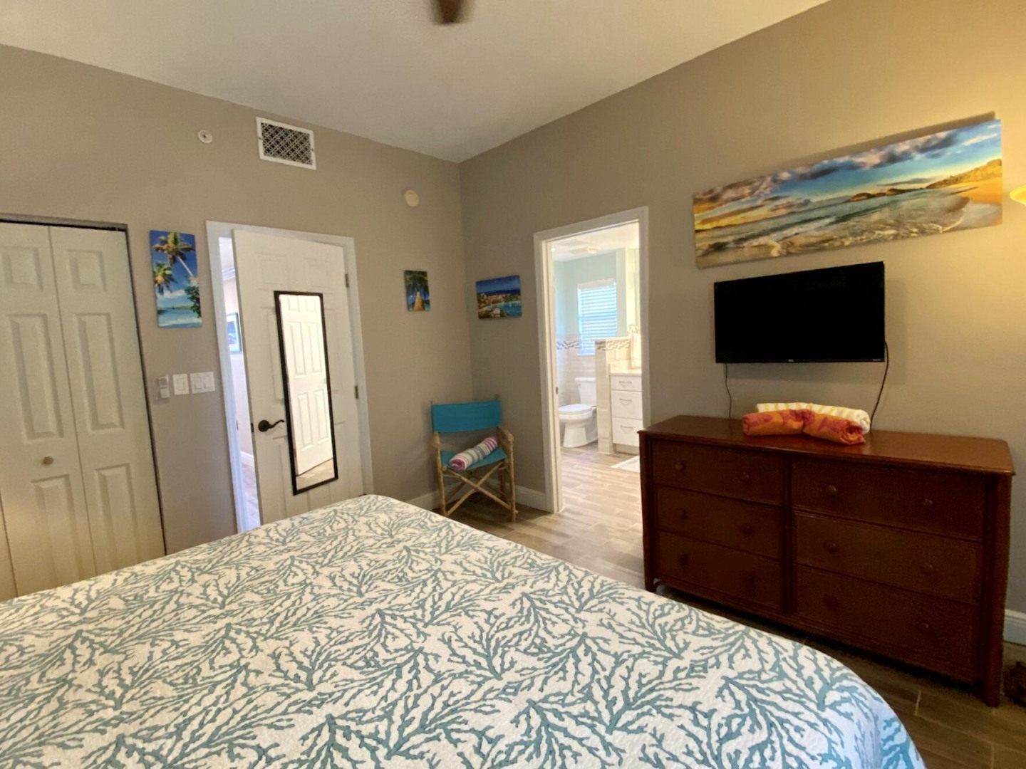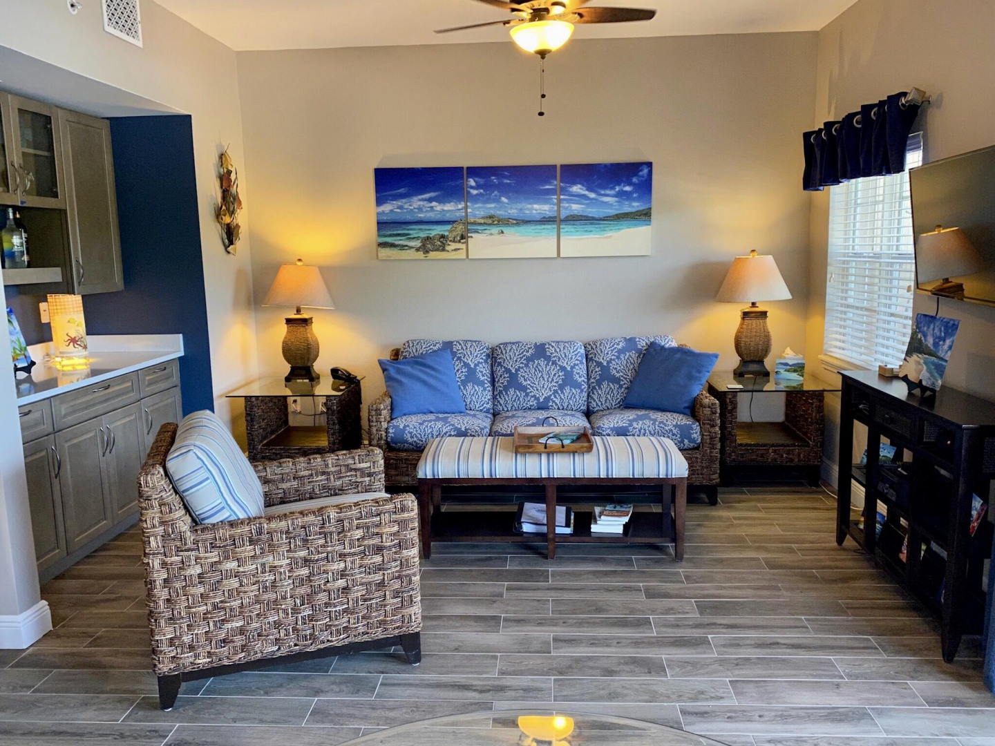 St. John Escape is a beautifully-designed & decorated one-bedroom condo located in a premier location at Grande Bay Resort. This impeccably-maintained unit was completely remodeled in 2020. The owners also redesigned the space to make it the ultimate vacation rental. Upgrades include a larger kitchen with new cabinets, countertops & appliances; an updated wet bar in the living room; a new bathroom & shower; new modern tiled floors inside & out; as well as a large, walk-in laundry with storage. The unit features a large deck with vaulted ceilings & unobstructed, panoramic views. St. John Escape is a great investment, as it is an extremely successful vacation rental. The occupancy rate, thus far, in 2024 is 95%. This unit has low grandfathered HOA fees. Buyer to honor rental reservations.St. John Escape is located in building four, which is the top left building at the resort. It has panoramic views of Cruz Bay beach, the harbor, St. Thomas, and the neighboring cays, all the way out to Lovango.